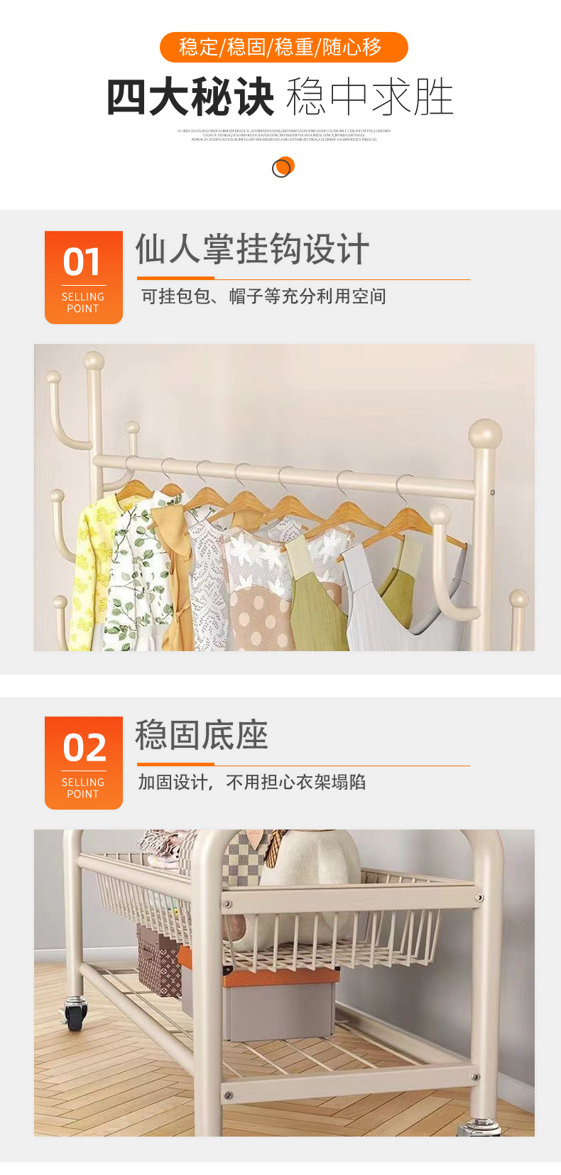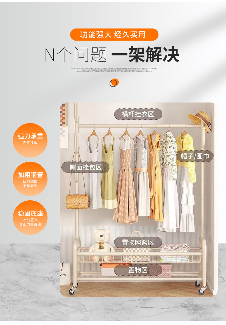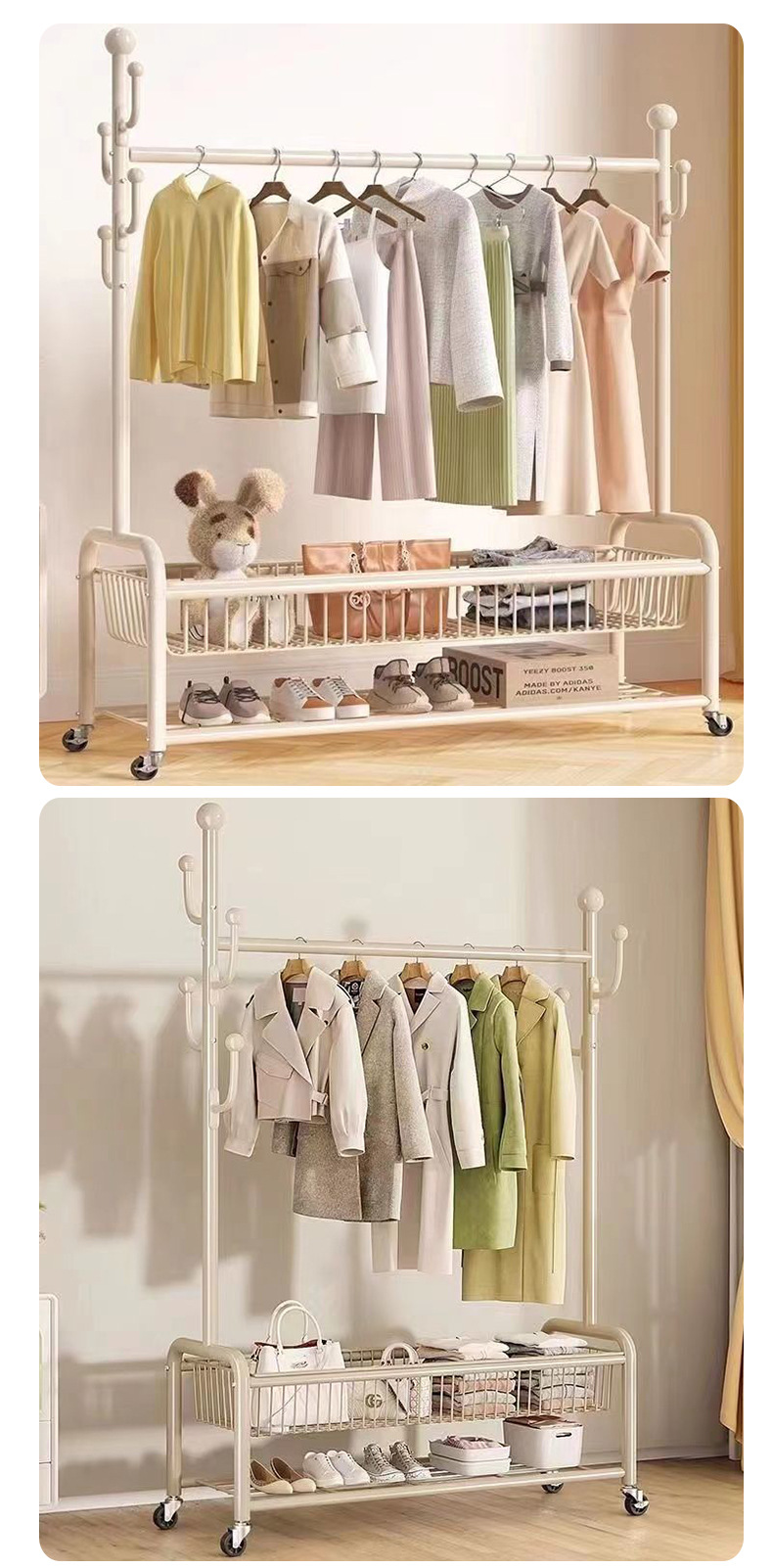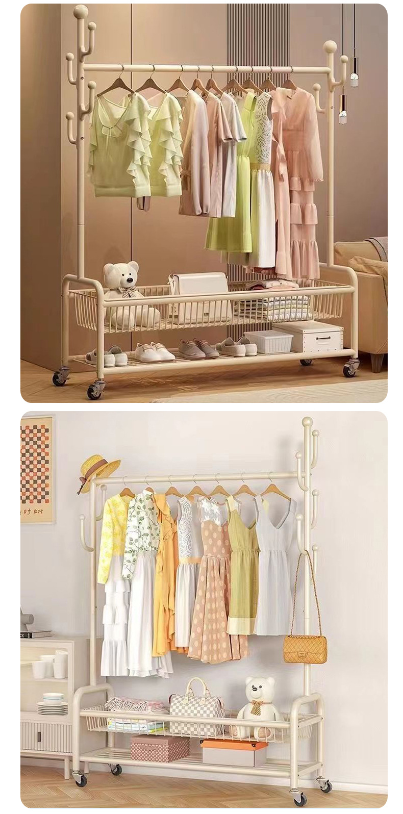 가정용 침실 옷걸이, 바구니가 있는 바닥형 옷걸이, 발코니 거실용 이동식 옷걸이