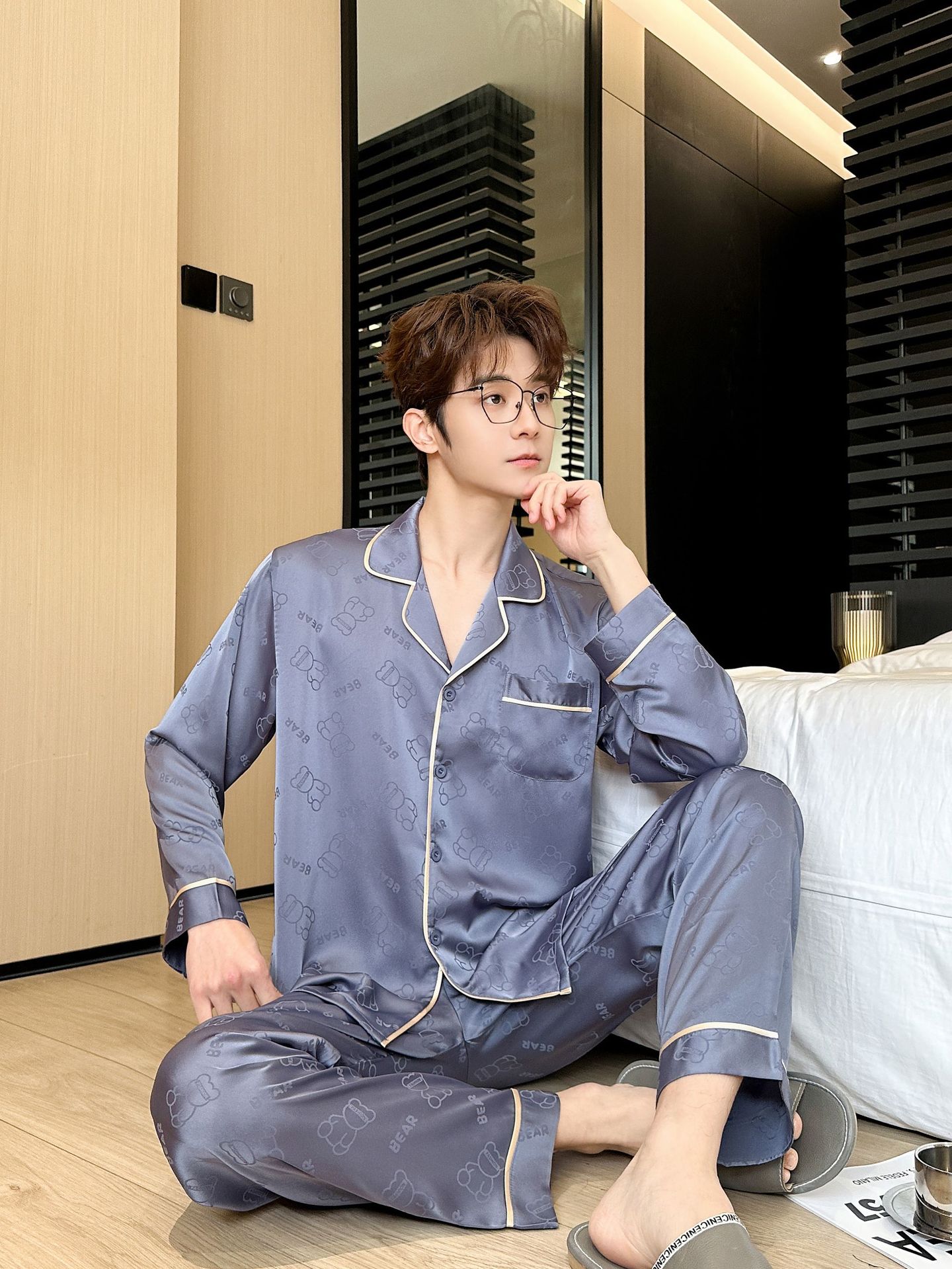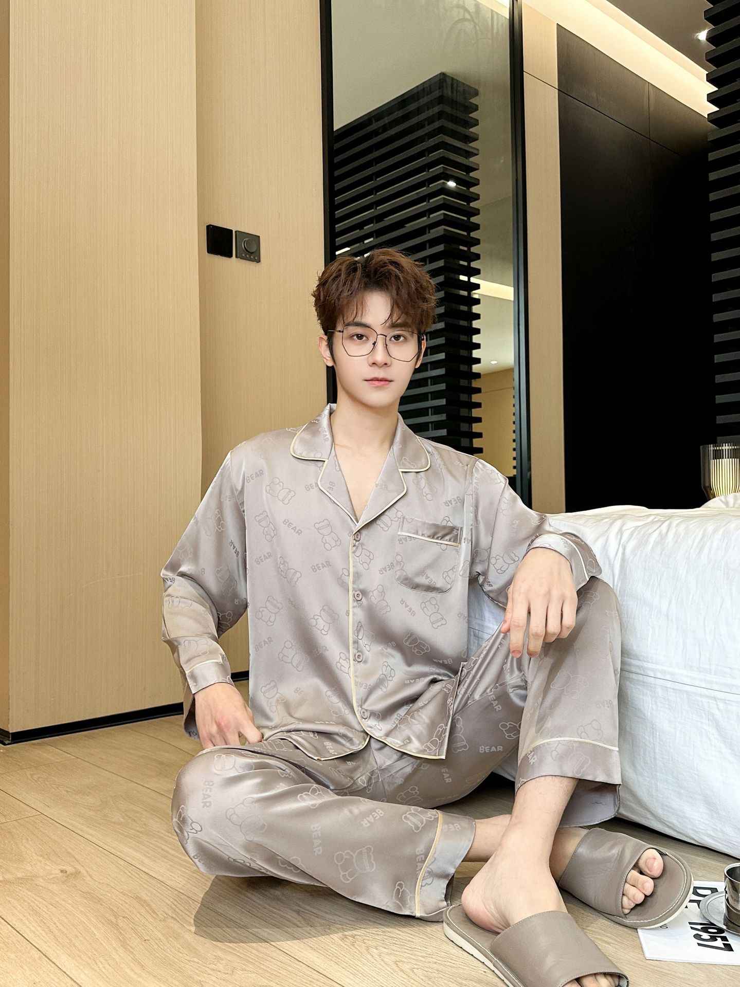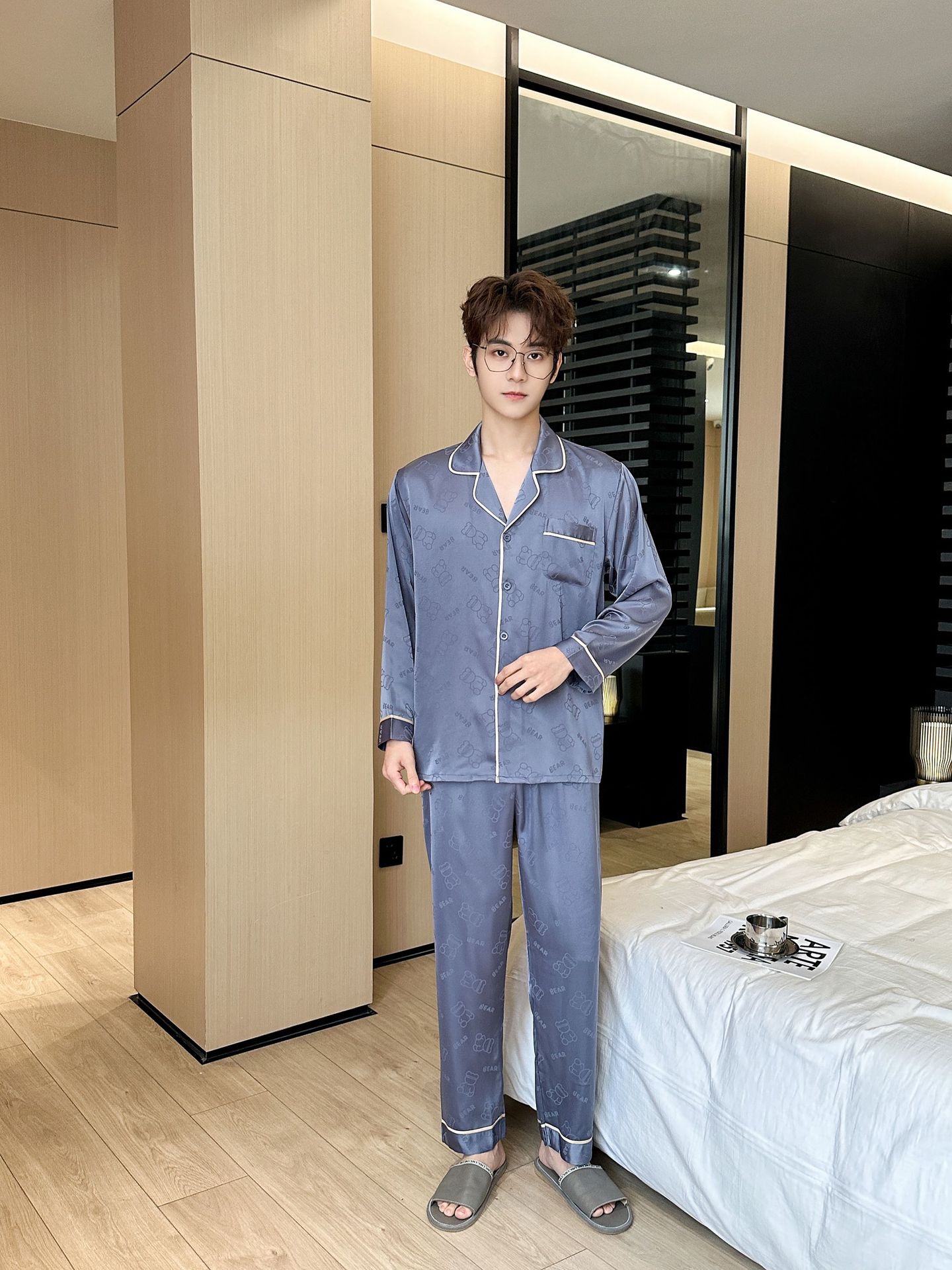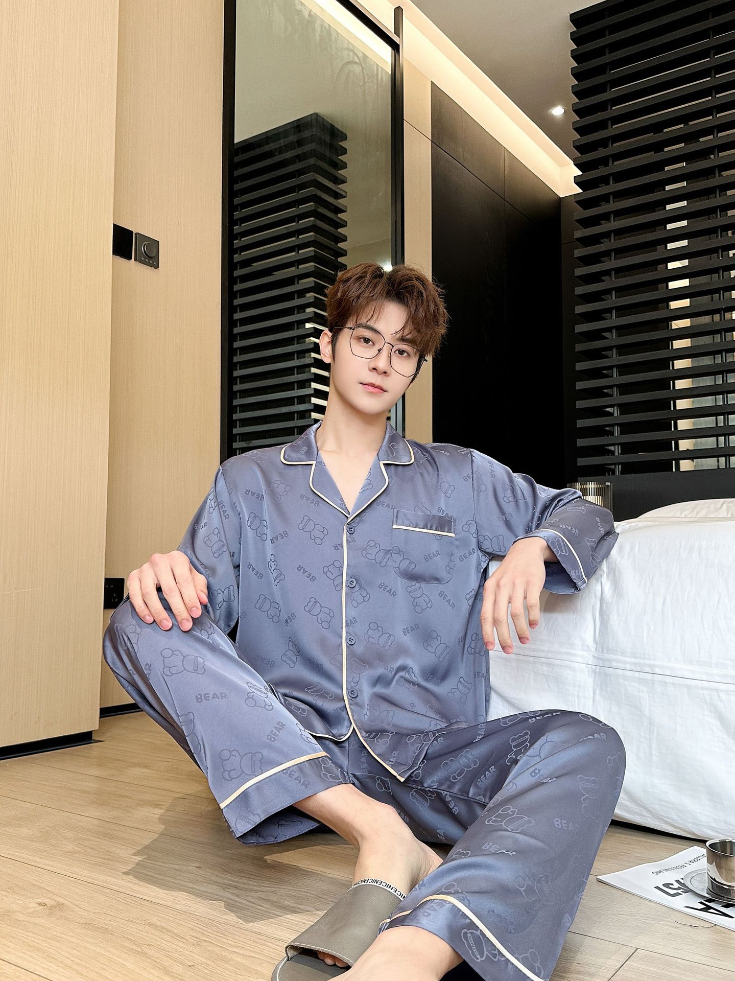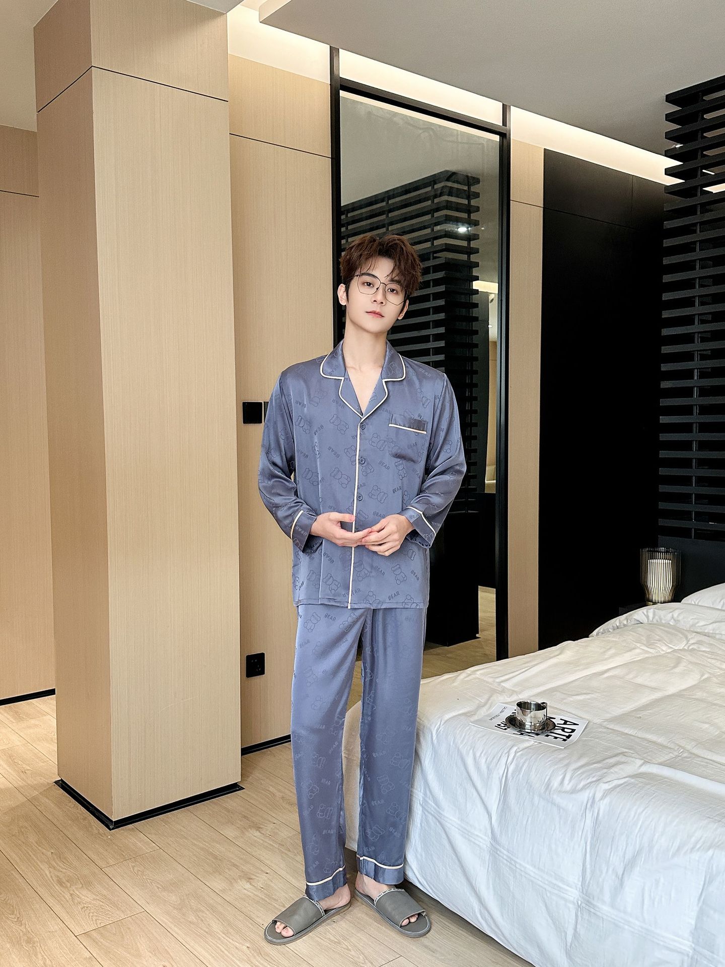[큰 크기] 2024 봄 새 잠옷 남자 긴팔 얇은 얼음 실크 고급 자카드 대형 가정용 옷스토어 가기