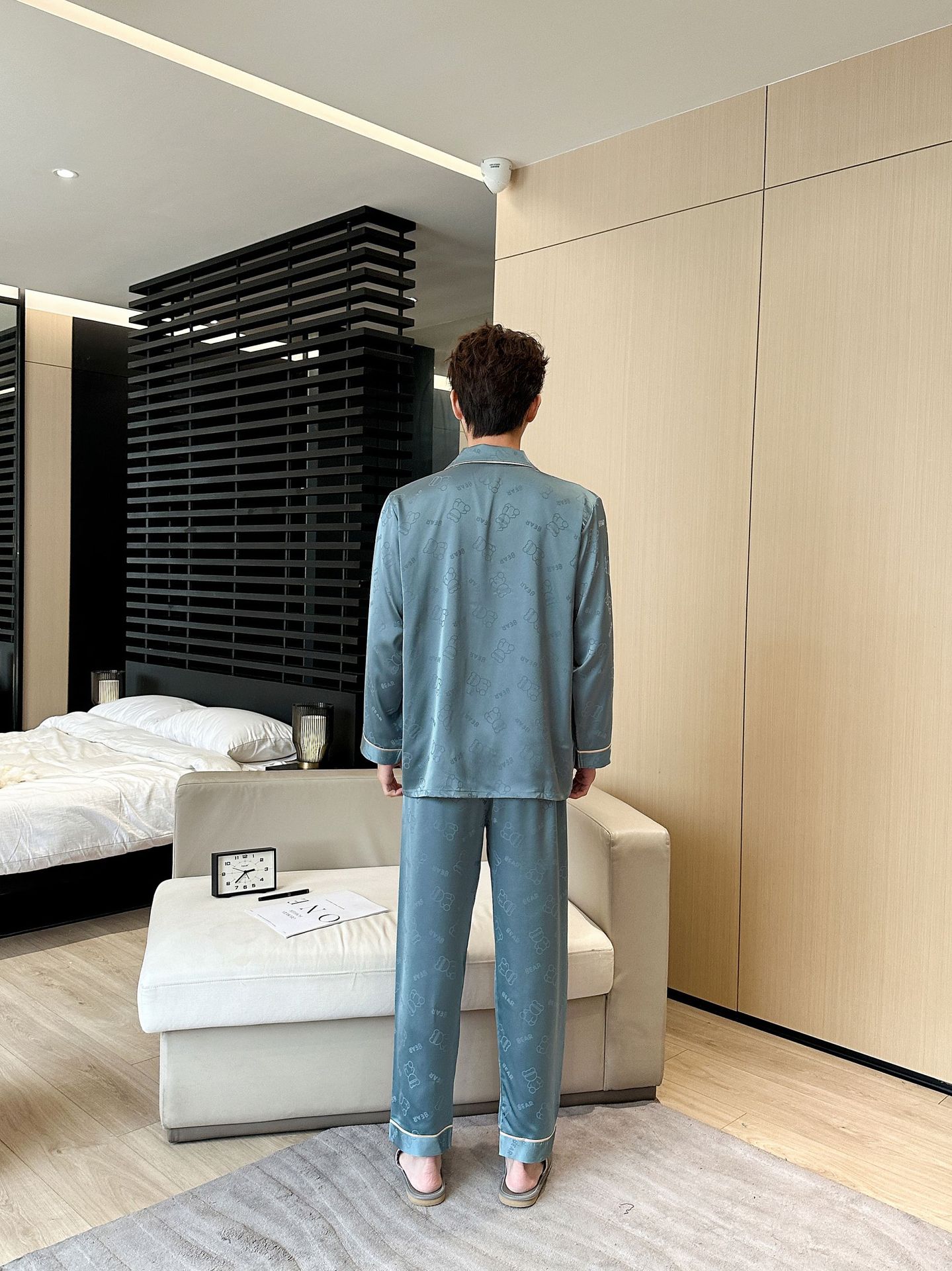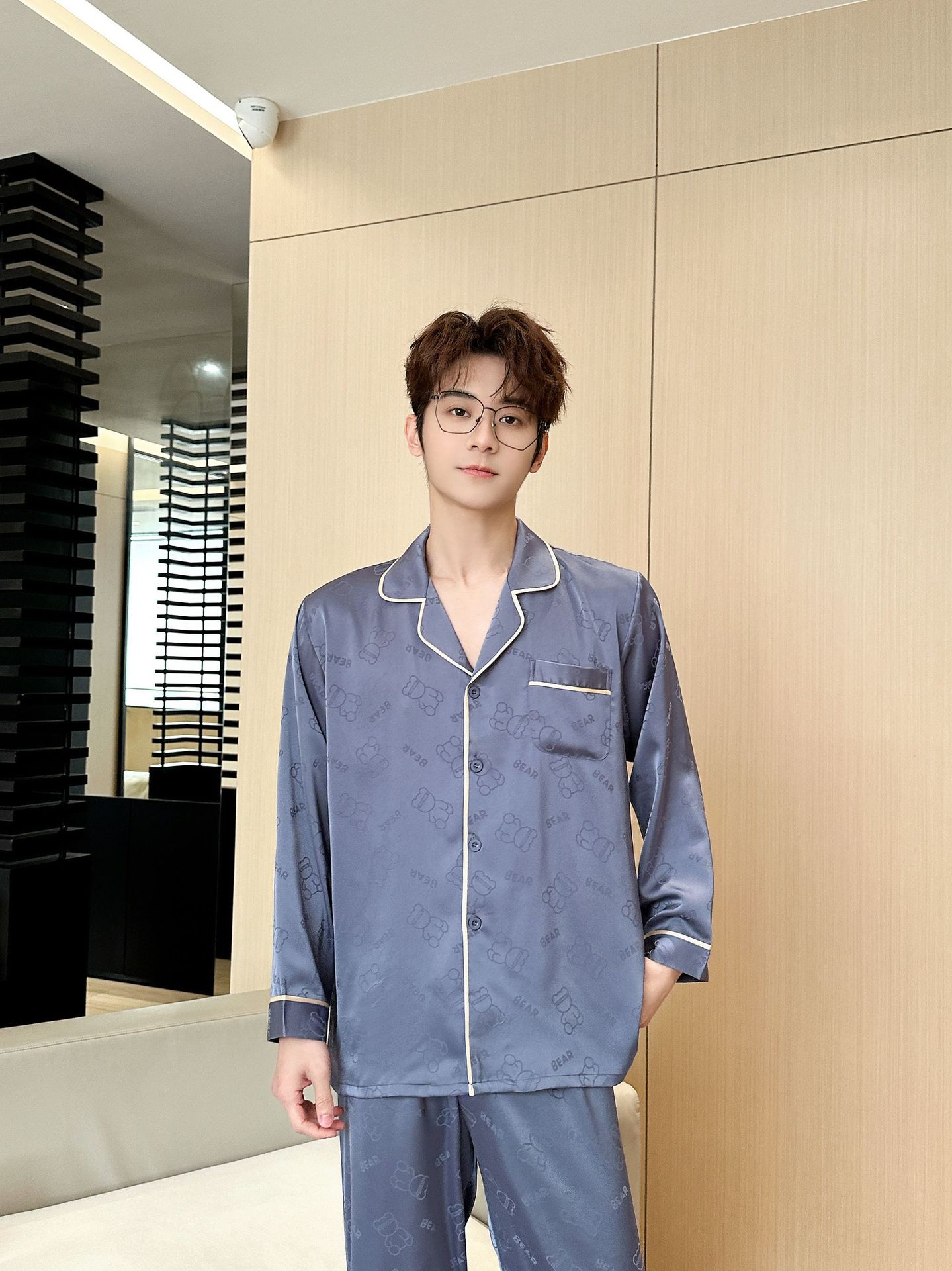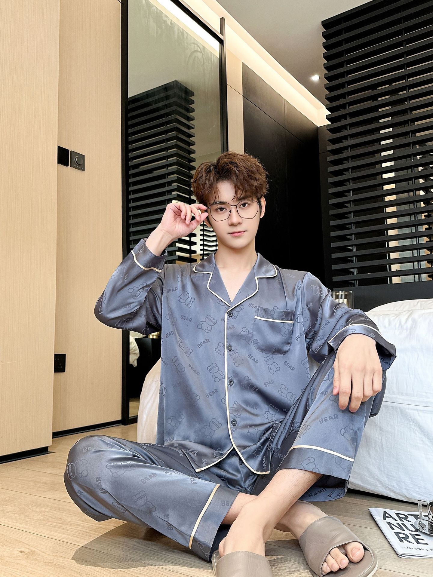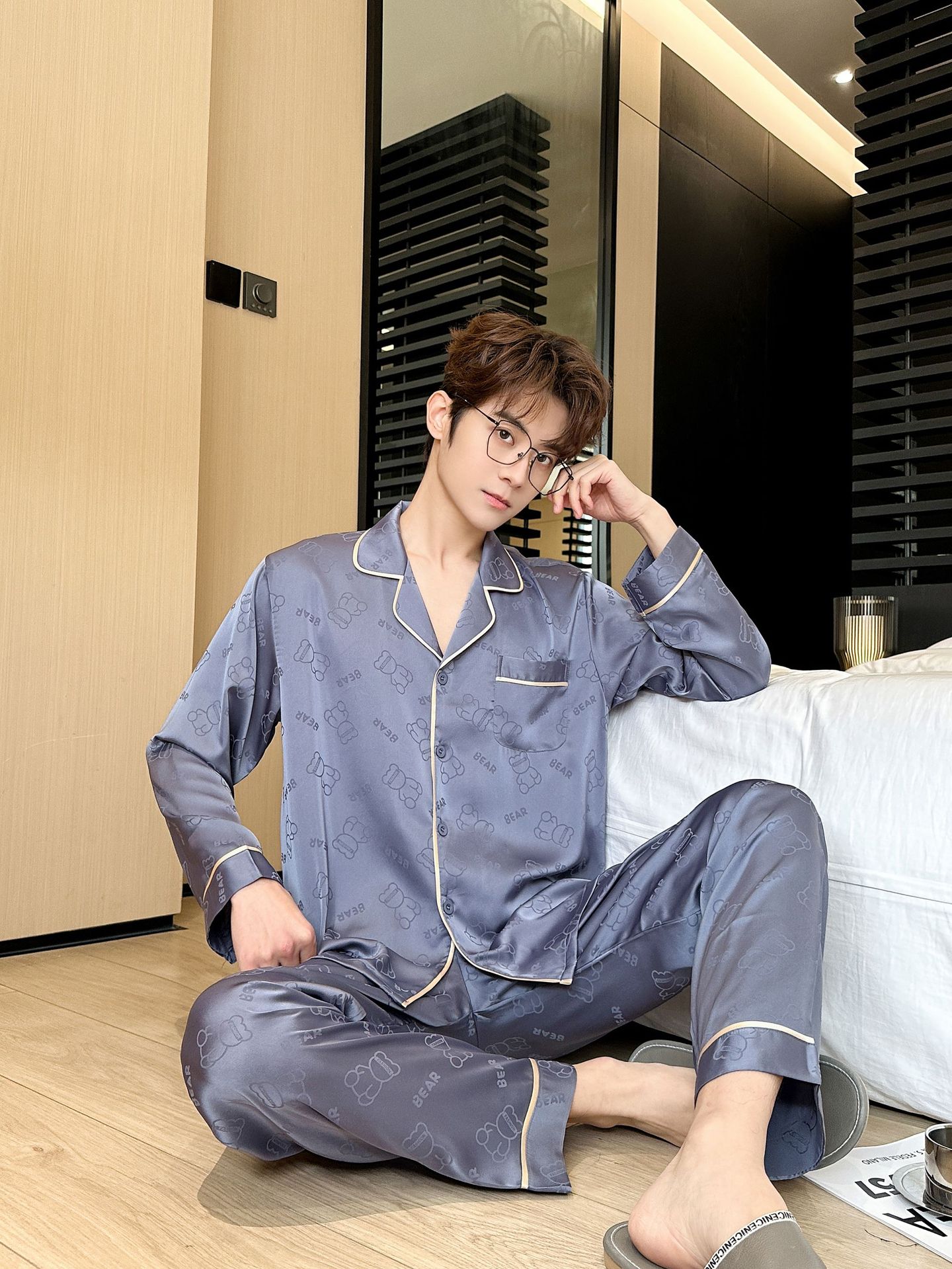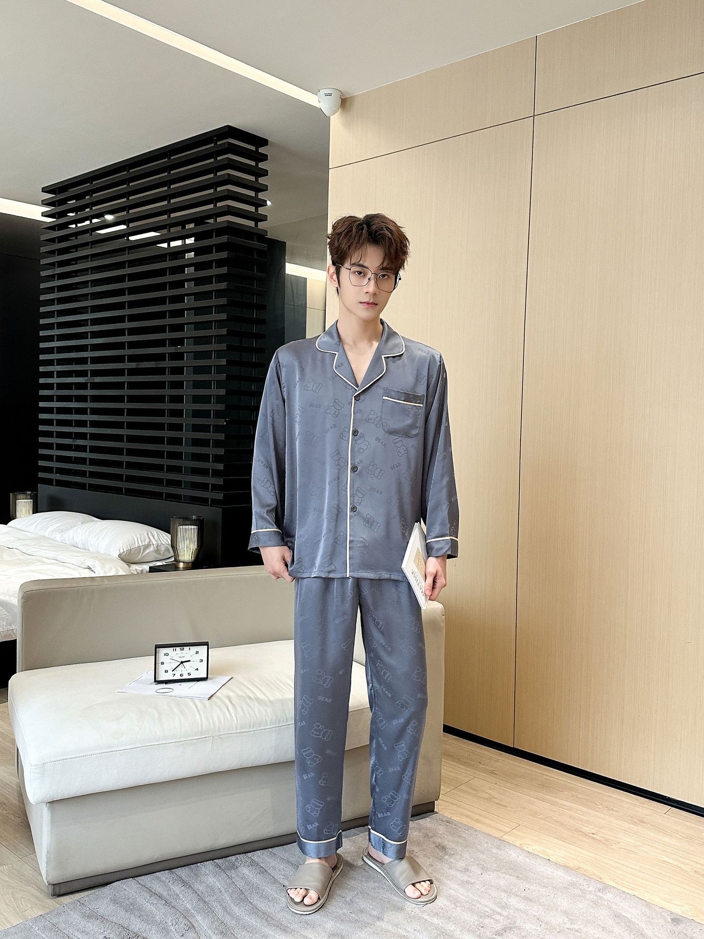 [큰 크기] 2024 봄 새 잠옷 남자 긴팔 얇은 얼음 실크 고급 자카드 대형 가정용 옷스토어 가기