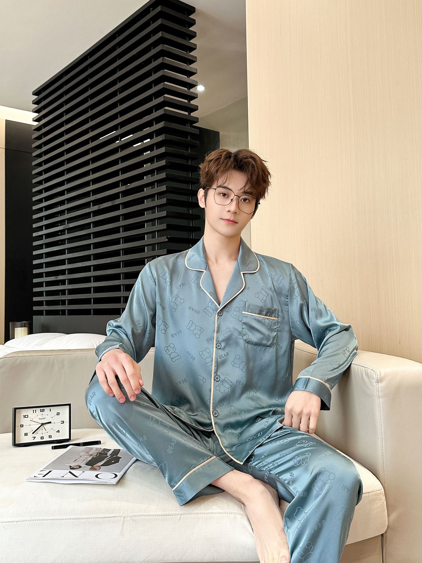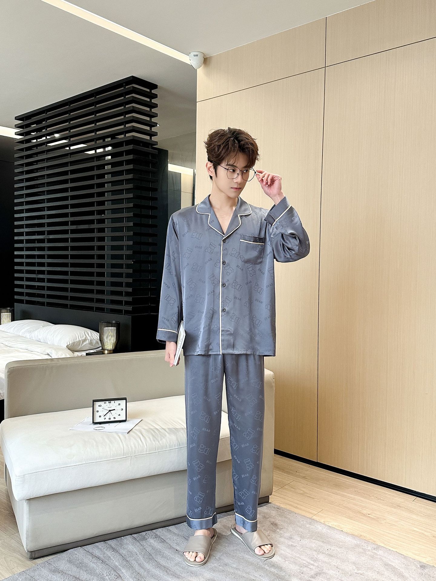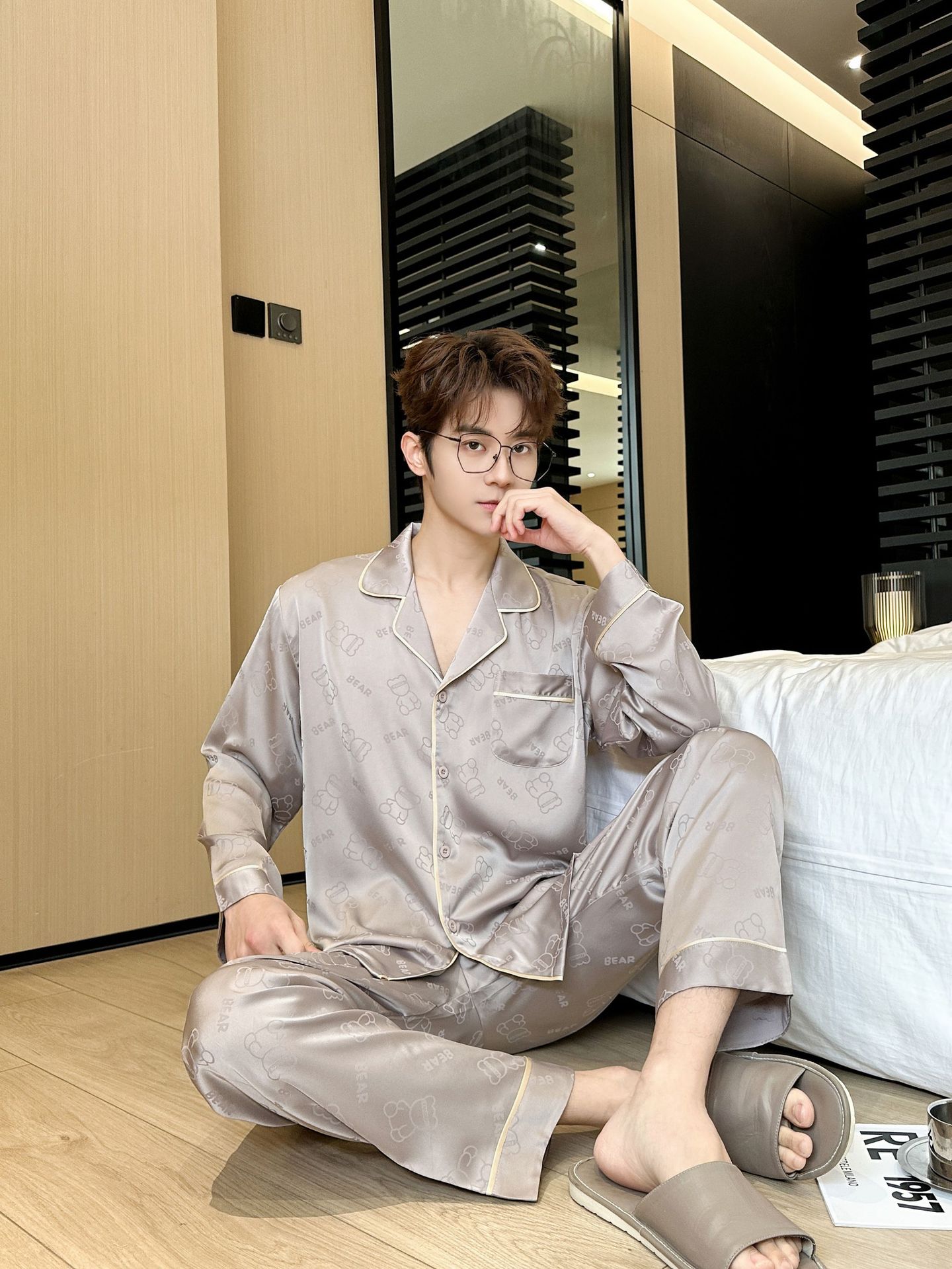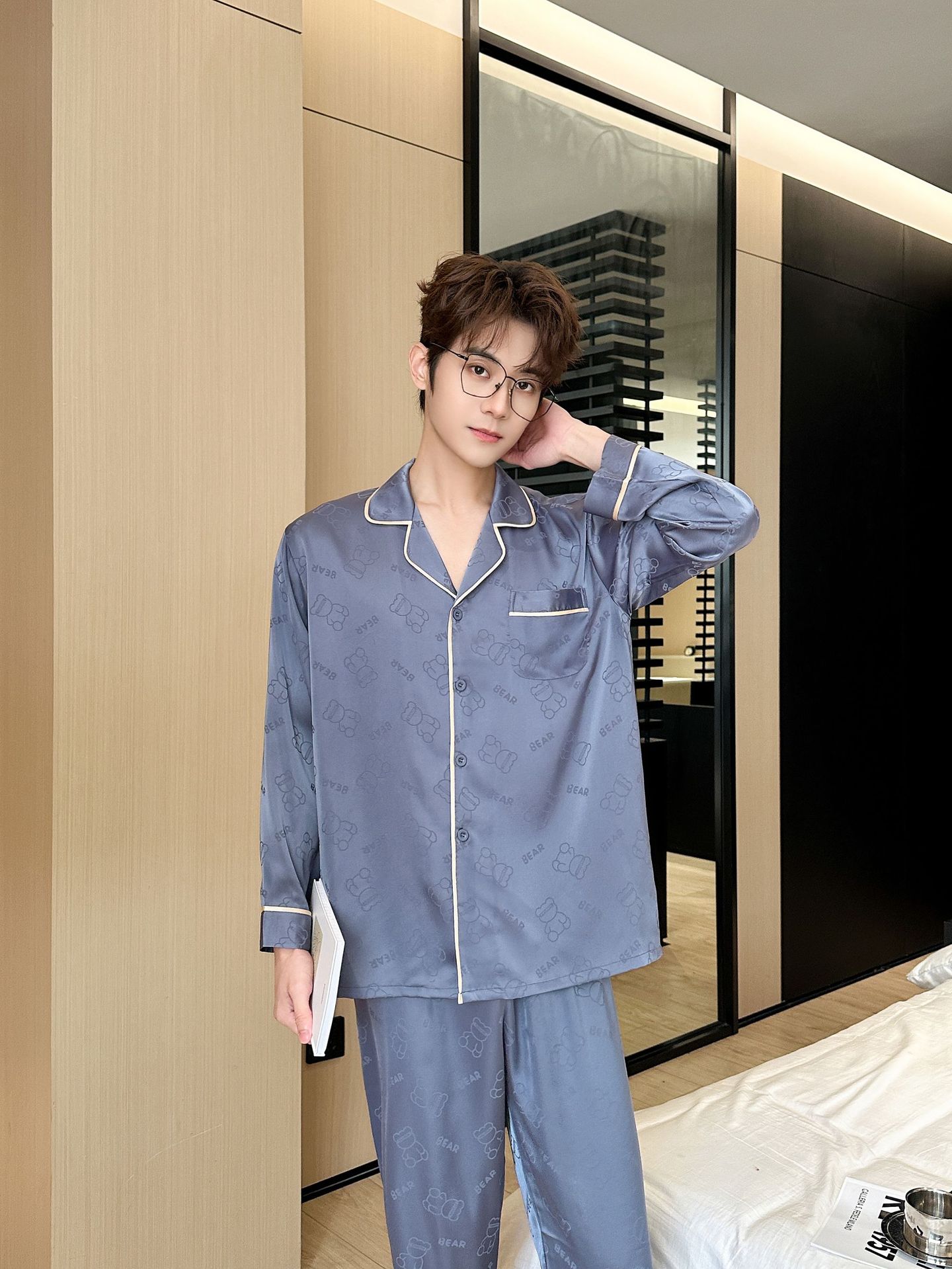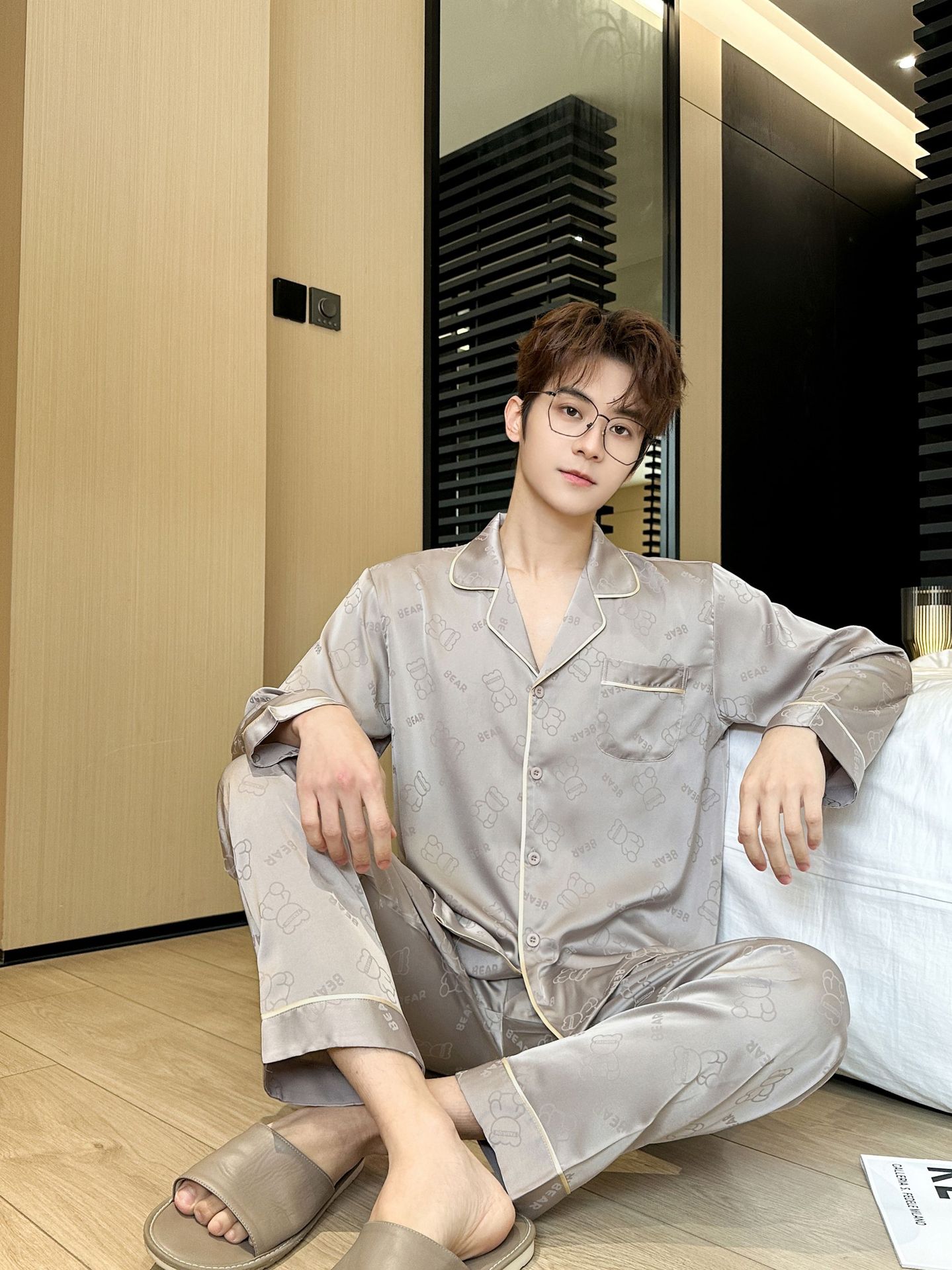 [큰 크기] 2024 봄 새 잠옷 남자 긴팔 얇은 얼음 실크 고급 자카드 대형 가정용 옷스토어 가기