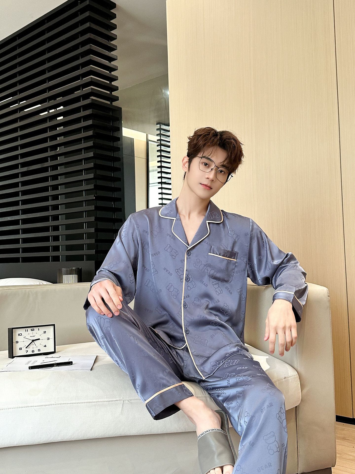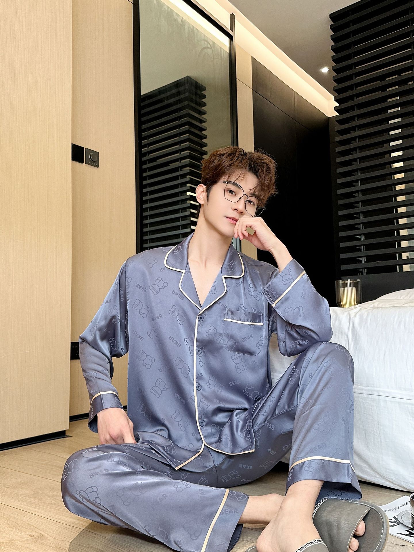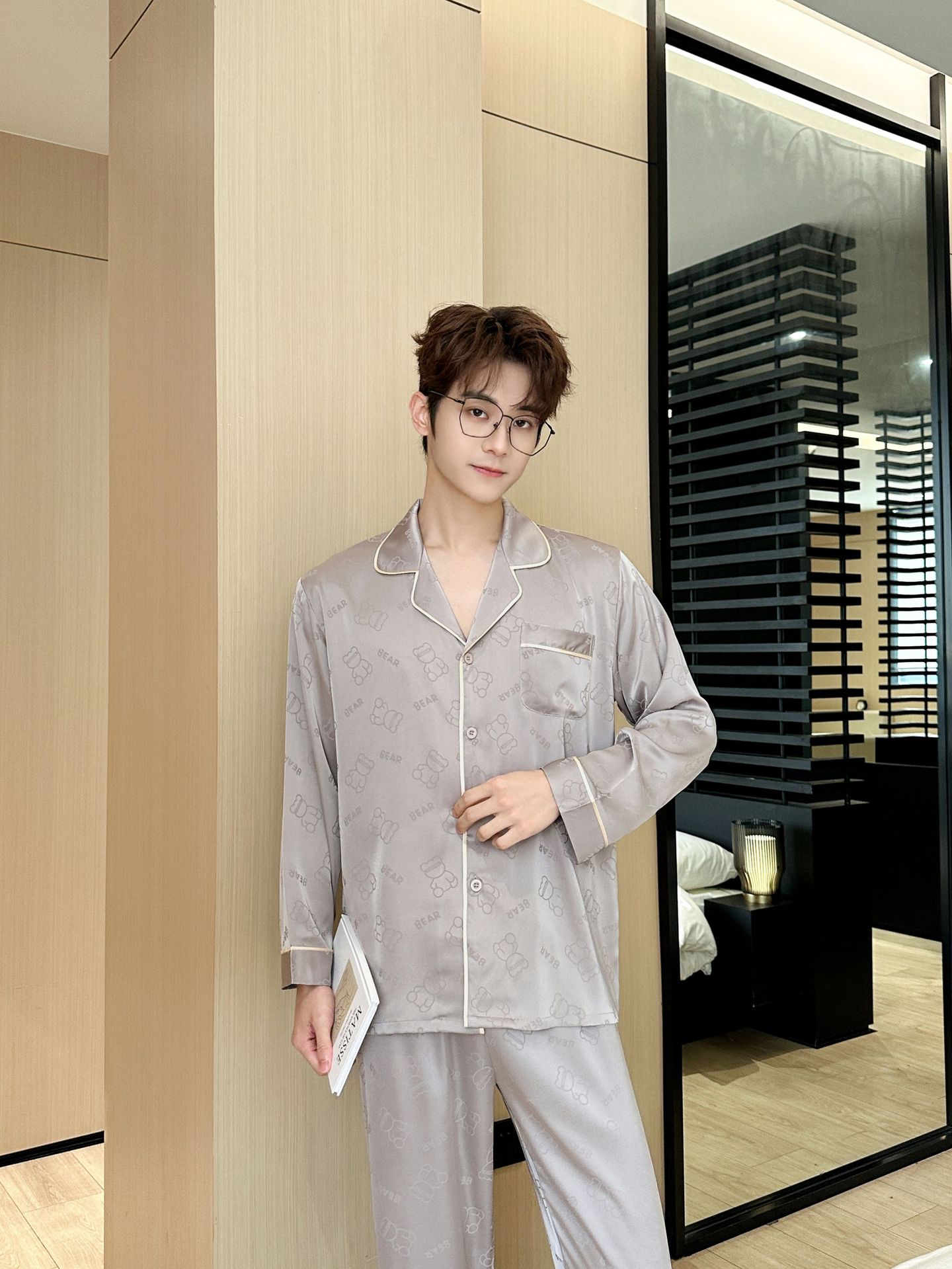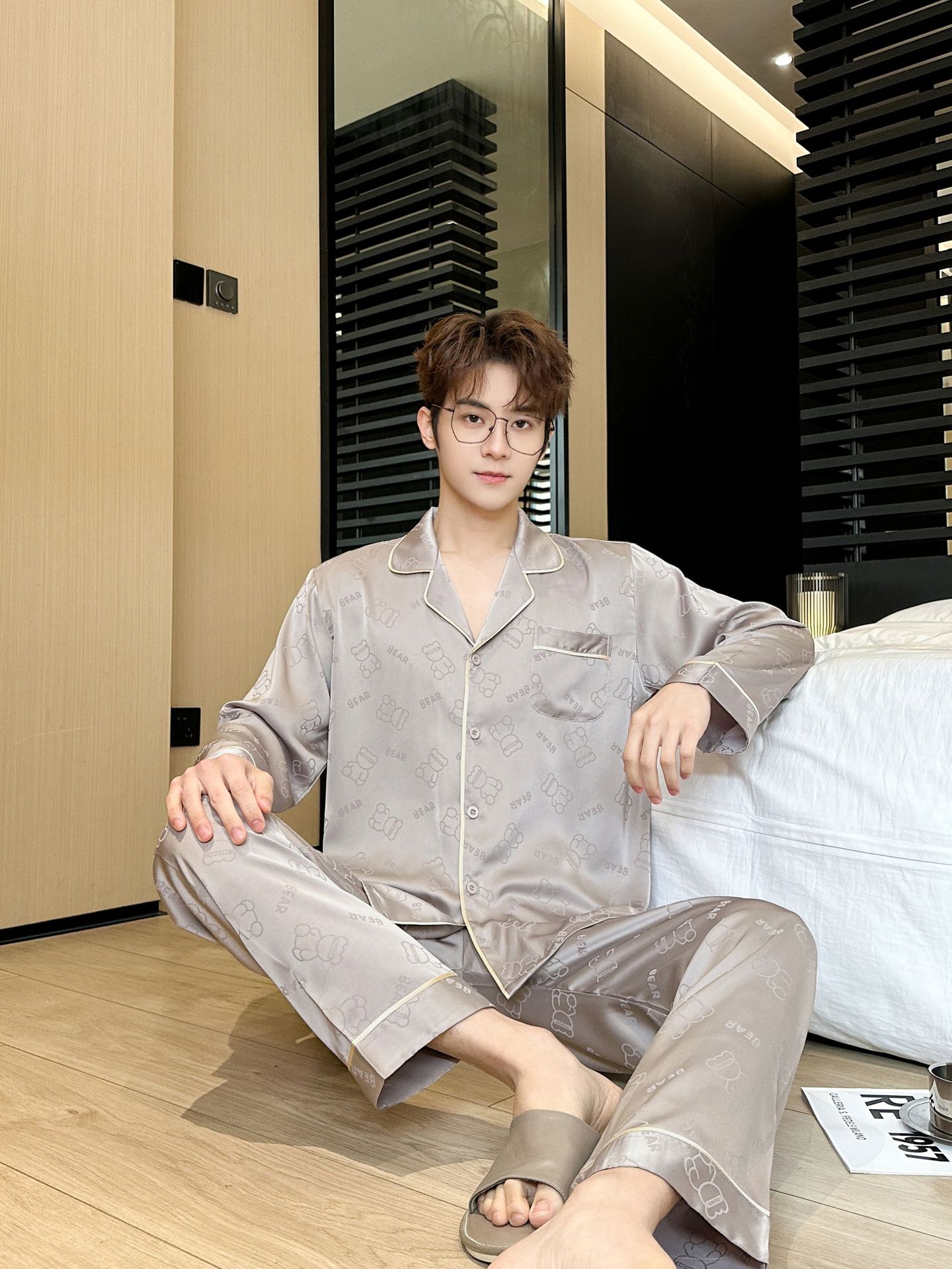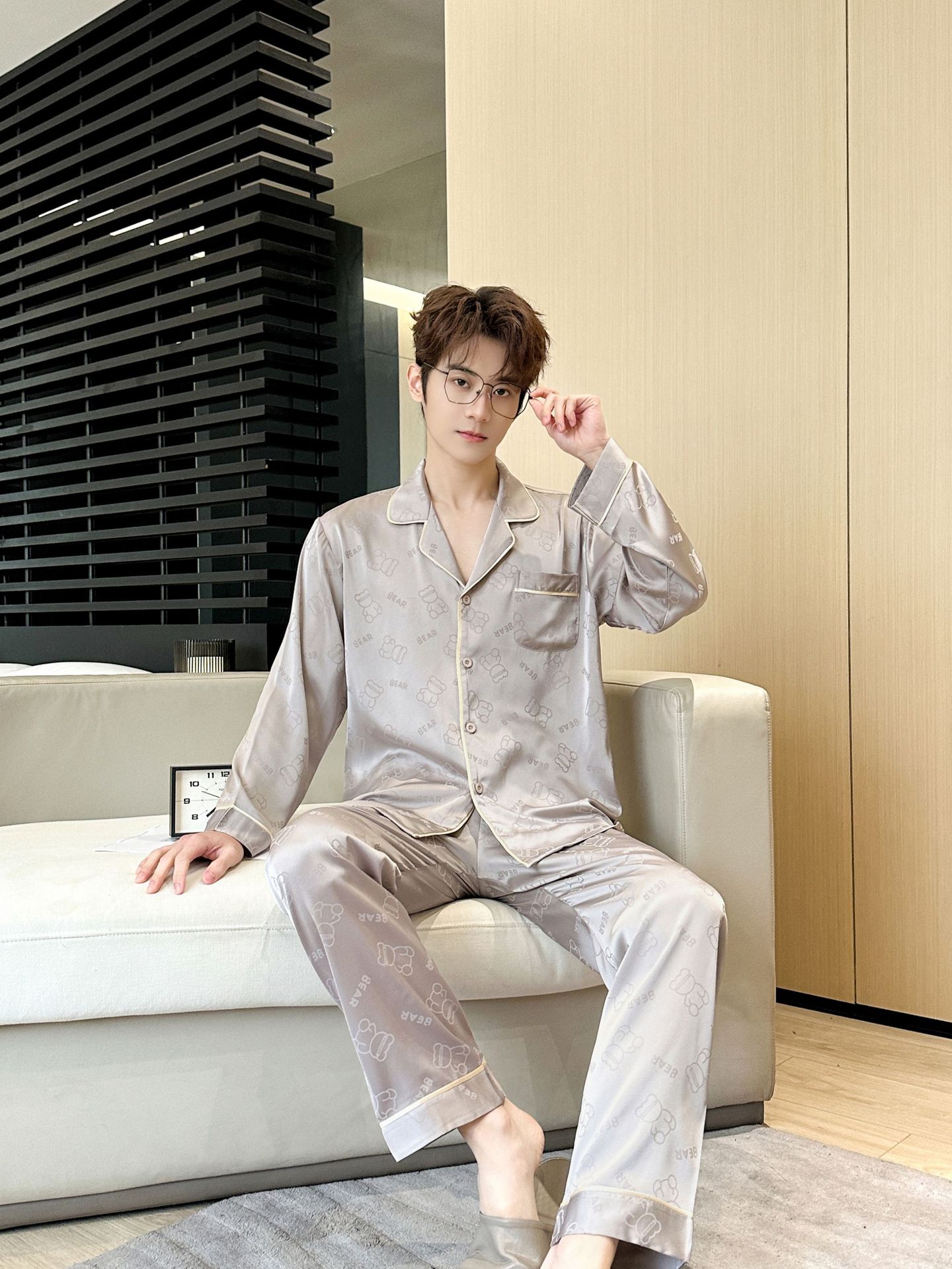 [큰 크기] 2024 봄 새 잠옷 남자 긴팔 얇은 얼음 실크 고급 자카드 대형 가정용 옷스토어 가기