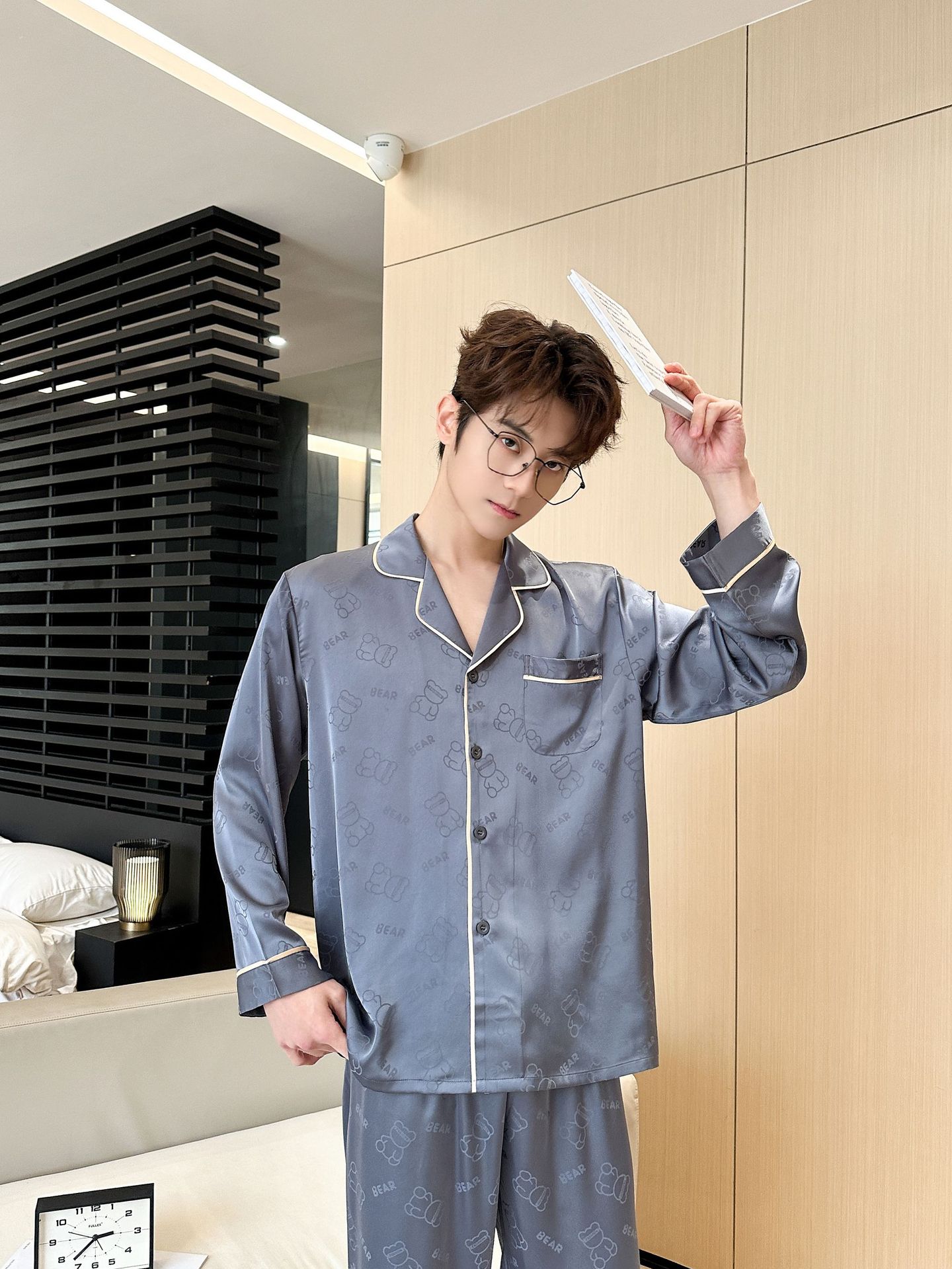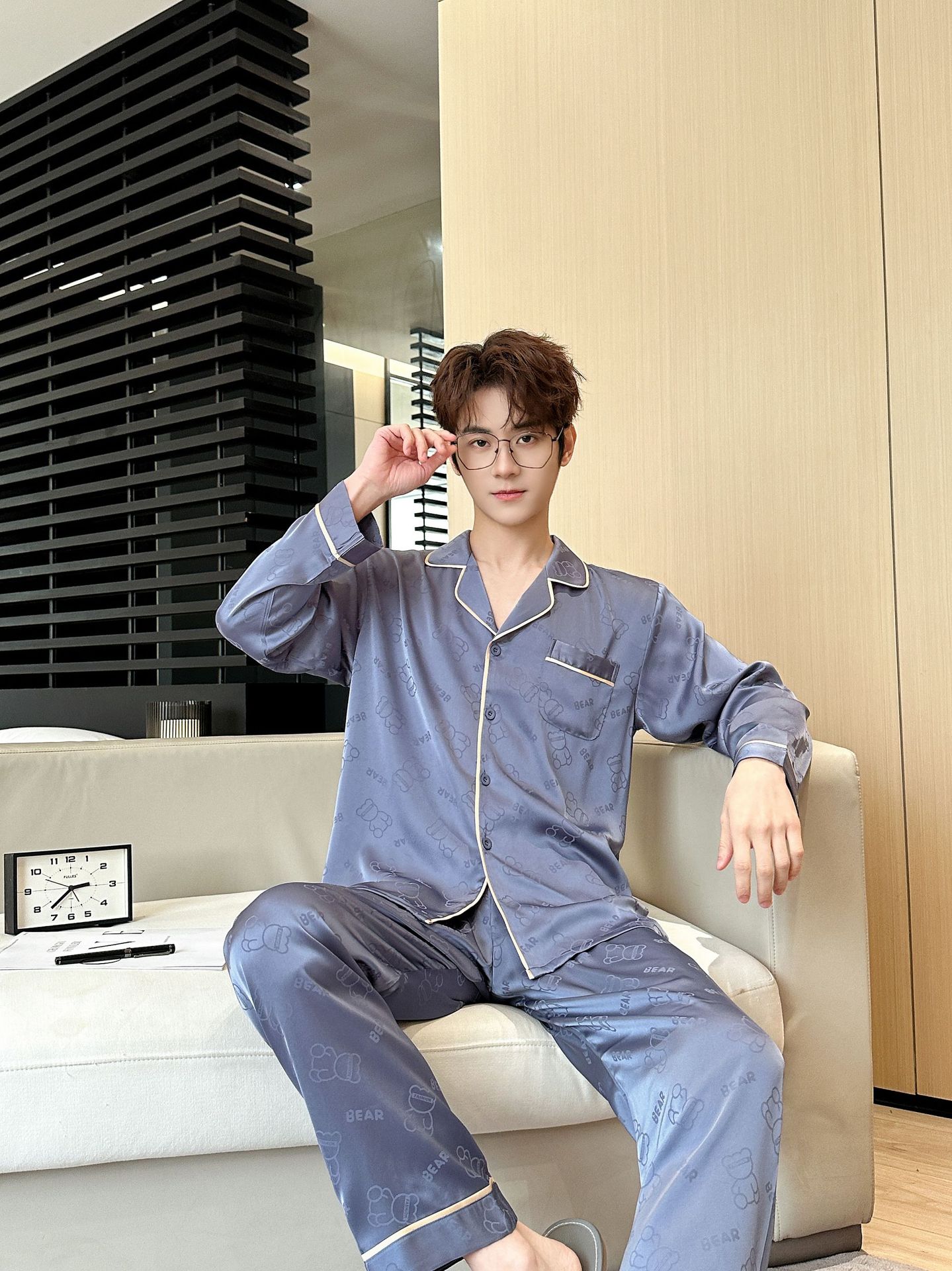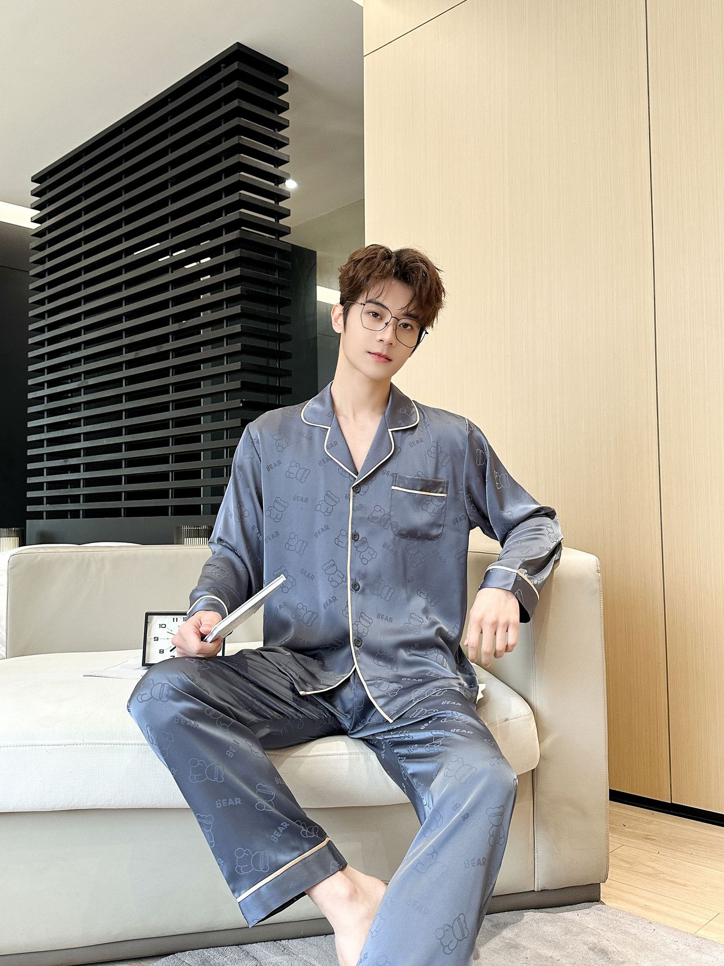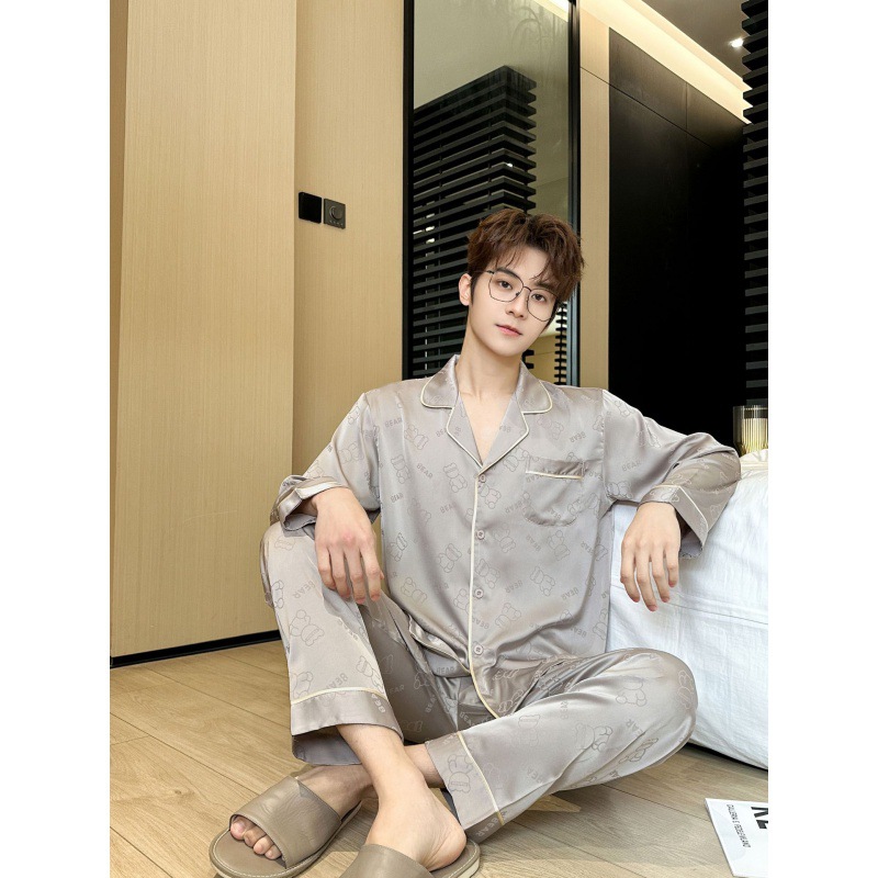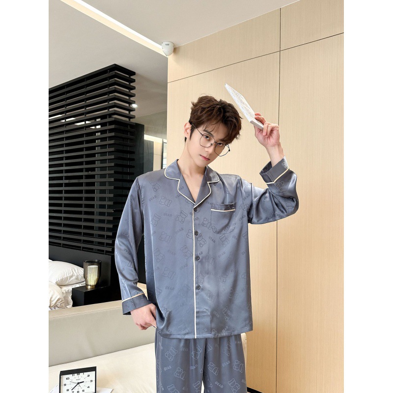 [큰 크기] 2024 봄 새 잠옷 남자 긴팔 얇은 얼음 실크 고급 자카드 대형 가정용 옷