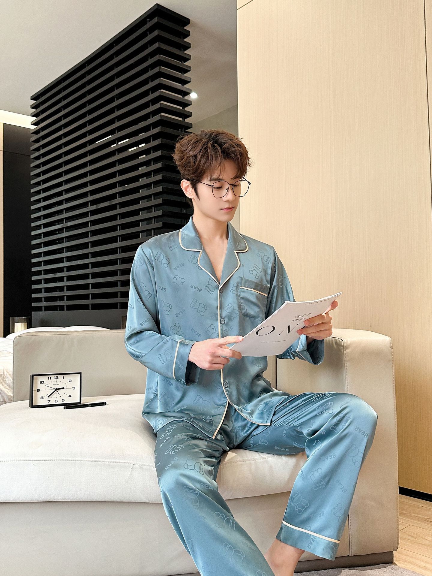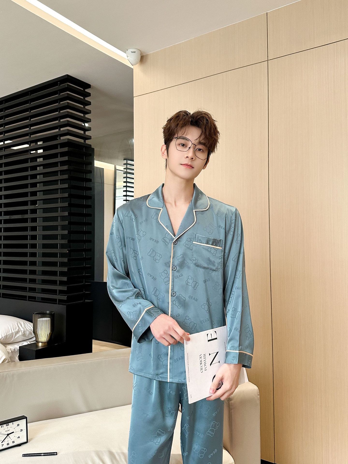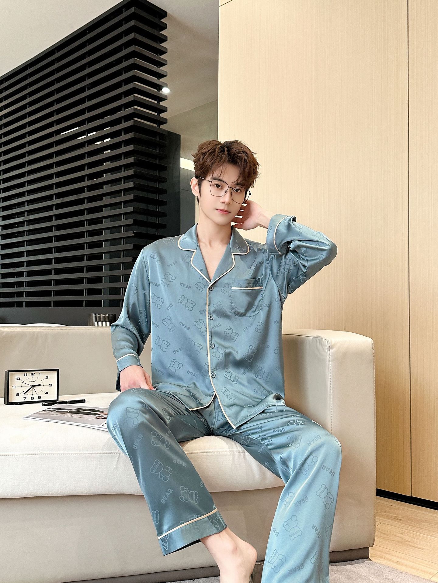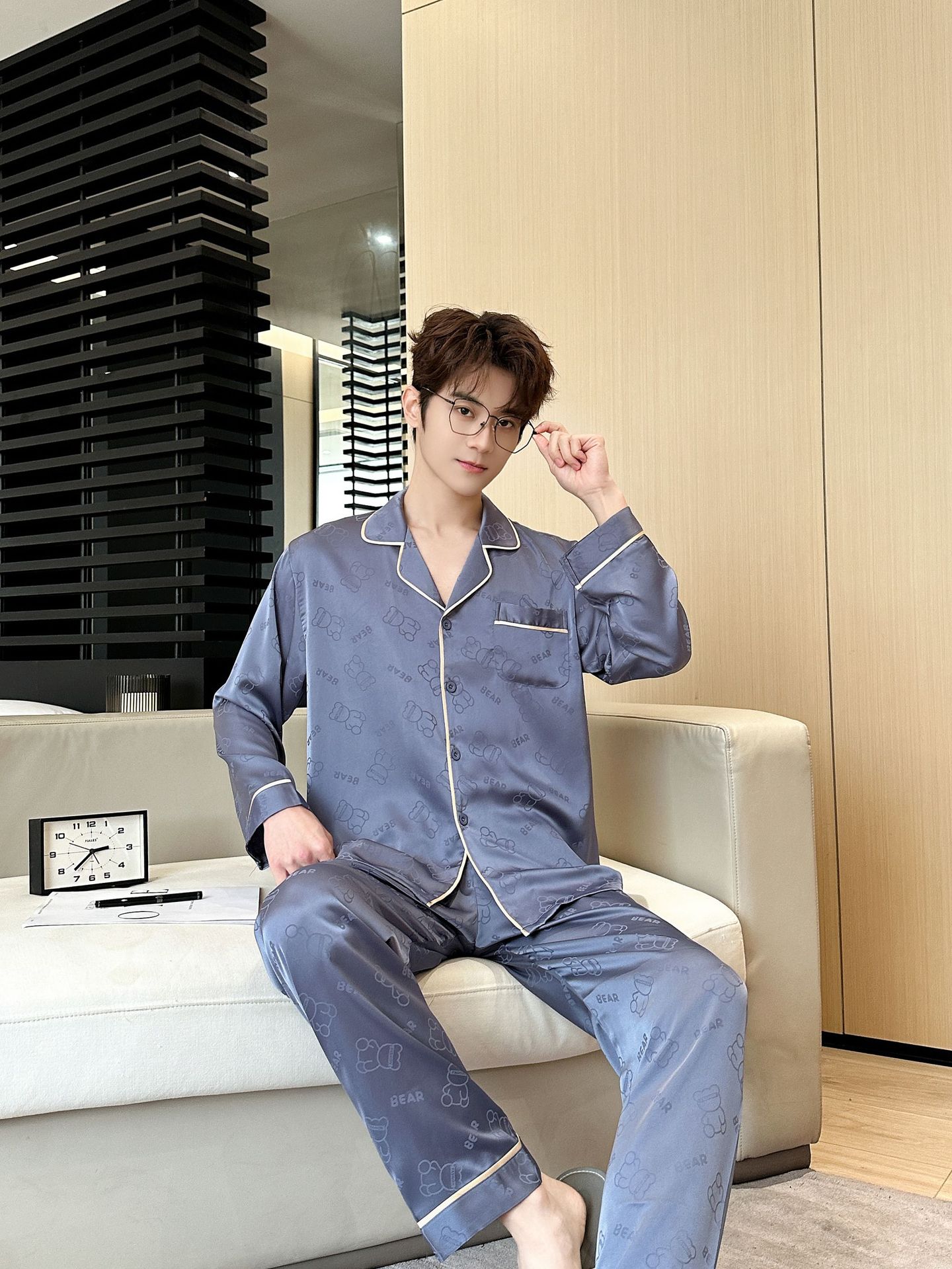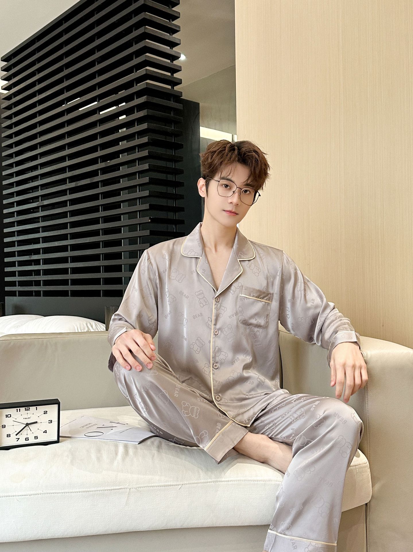 [큰 크기] 2024 봄 새 잠옷 남자 긴팔 얇은 얼음 실크 고급 자카드 대형 가정용 옷