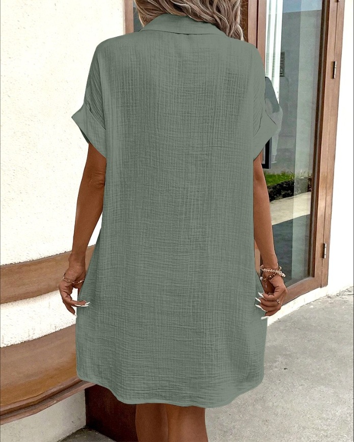 2024 아마존 유럽과 미국 국경 간 캐주얼 솔리드 컬러 싱글 브레스트 중간 길이 반팔 느슨한 캐주얼 원피스 여성 의류