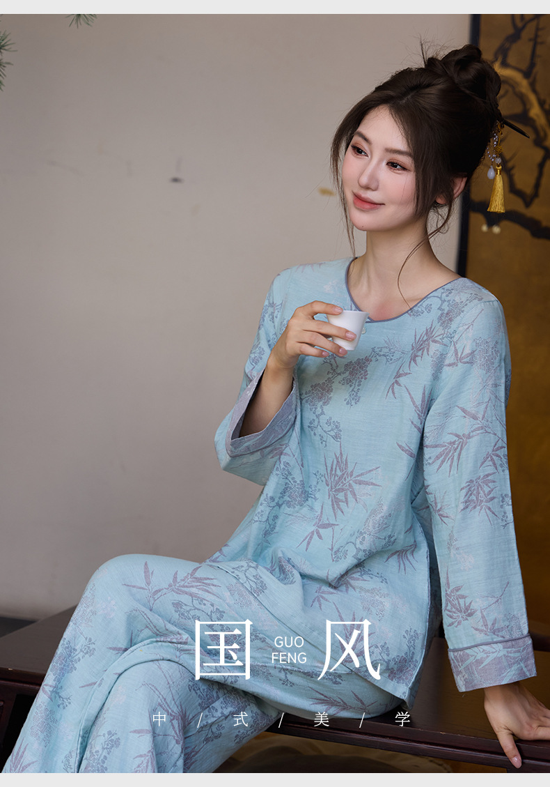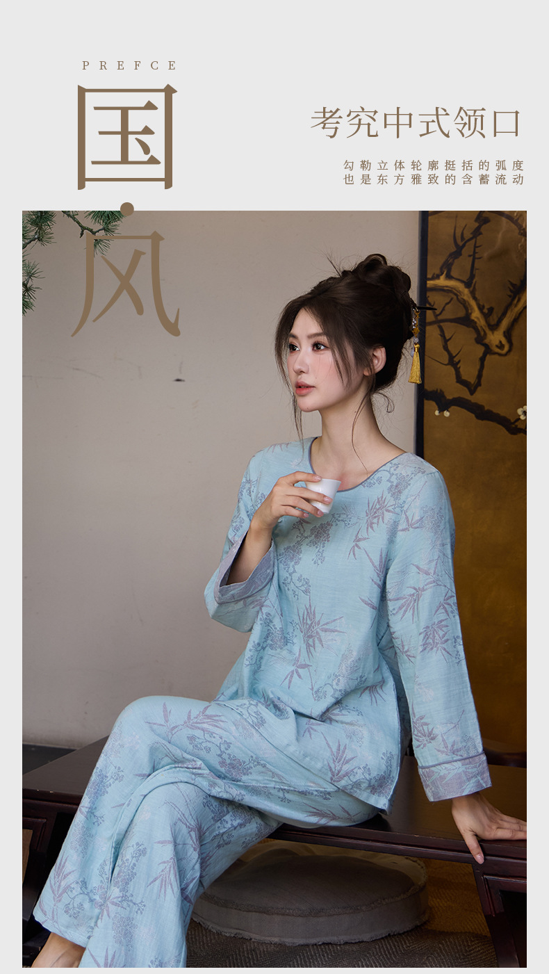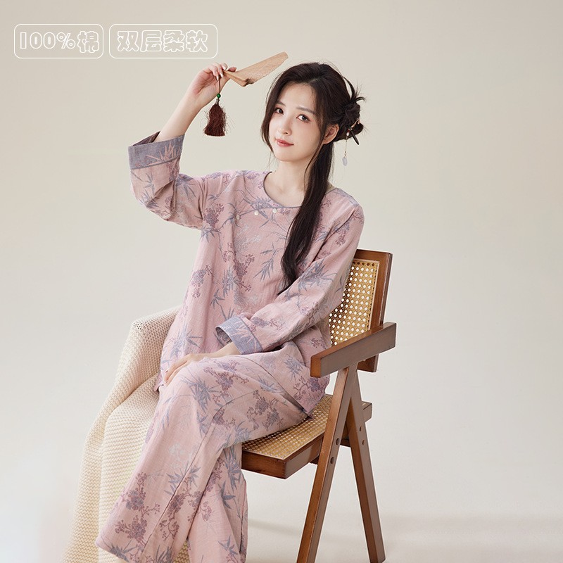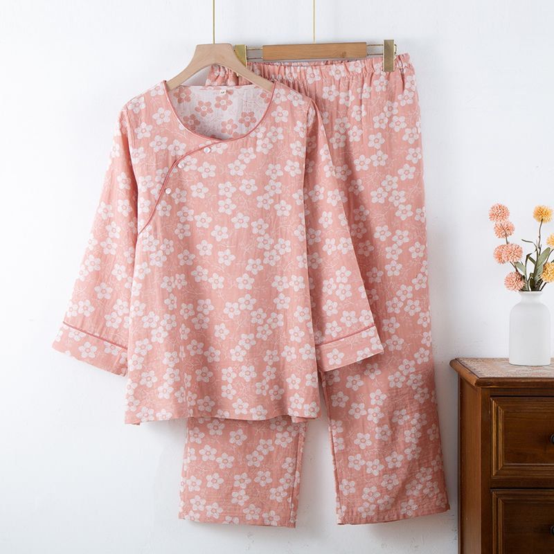 새로운 면 더블 레이어 원사 염색 자카드 거즈 여성 잠옷 봄과 가을 얇은 7 점 소매 라운드 넥 홈 세트스토어 가기