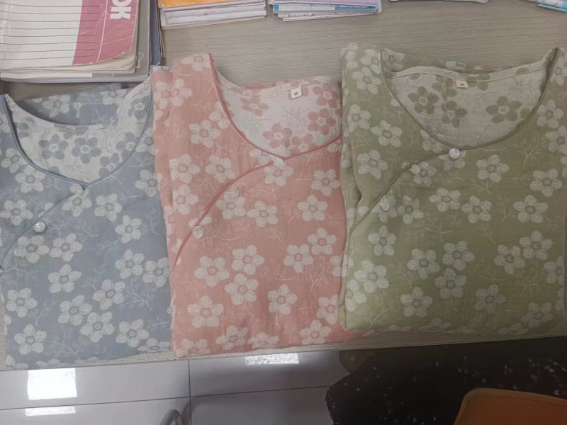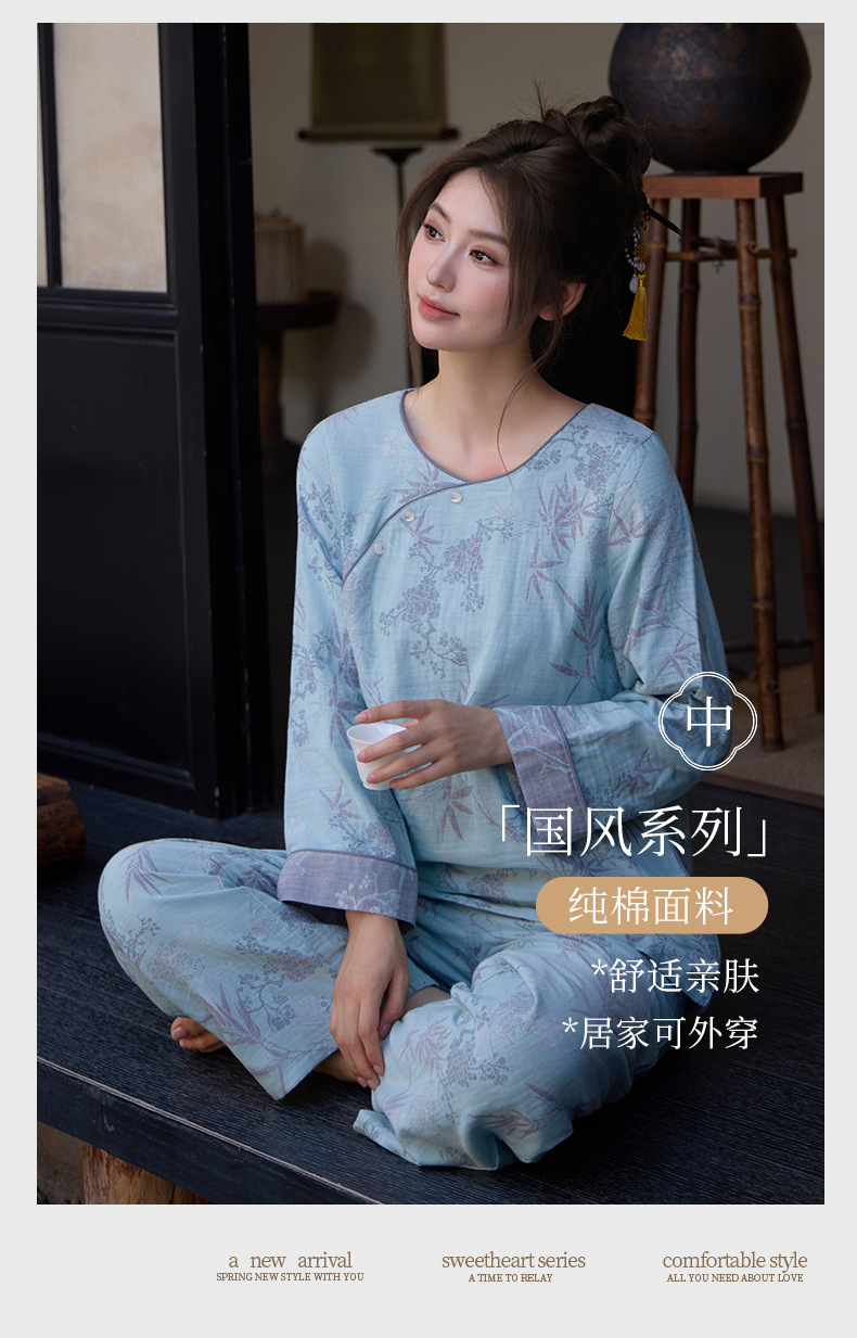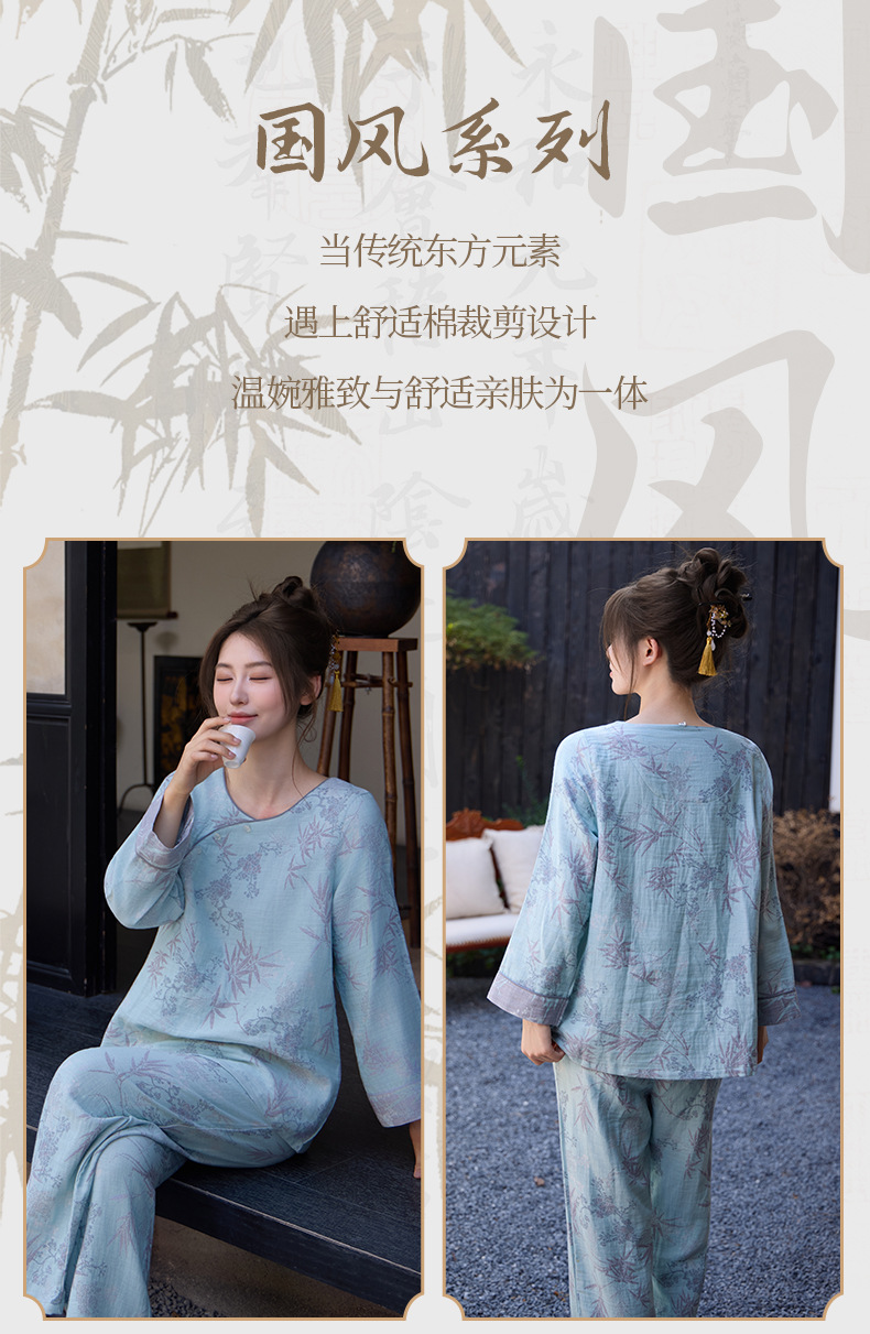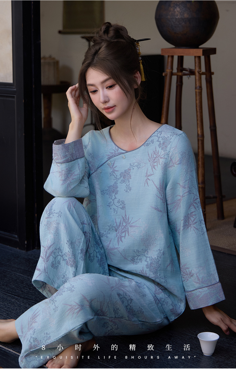 새로운 면 더블 레이어 원사 염색 자카드 거즈 여성 잠옷 봄과 가을 얇은 7 점 소매 라운드 넥 홈 세트스토어 가기