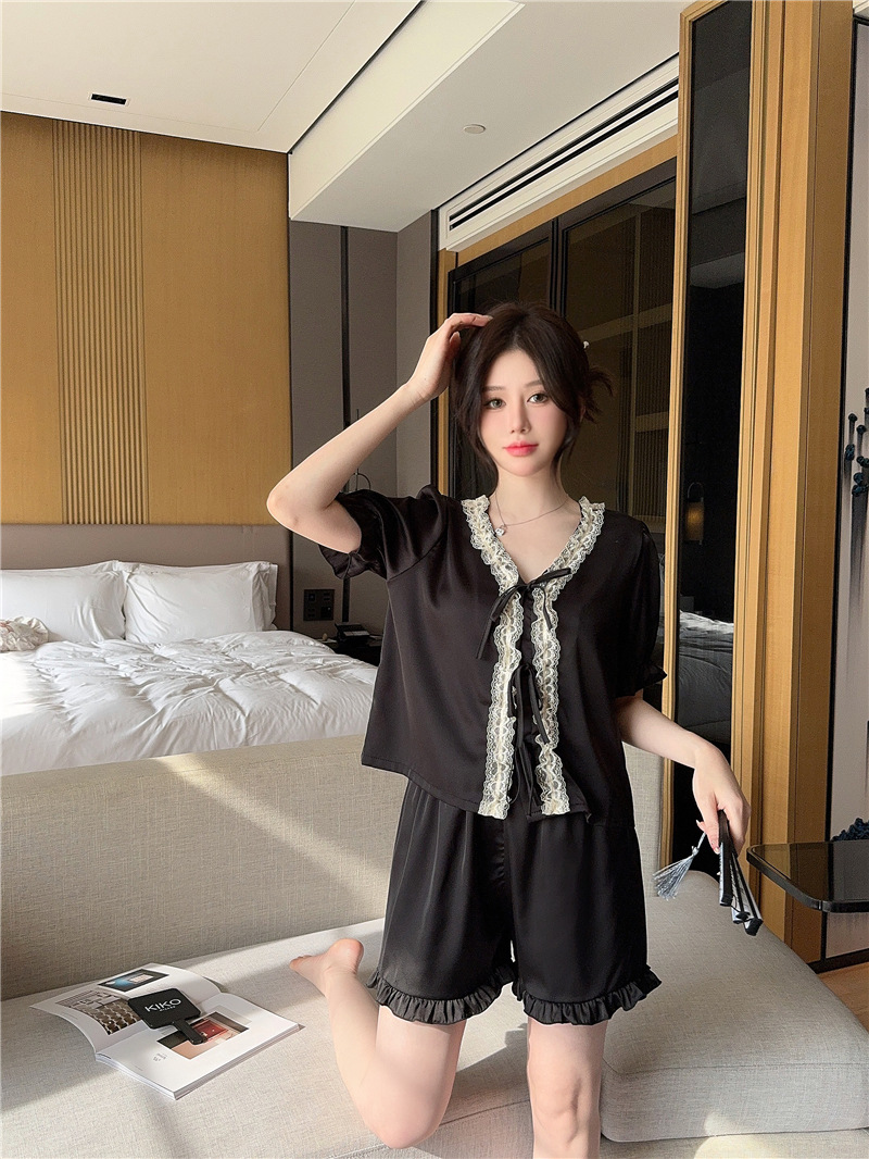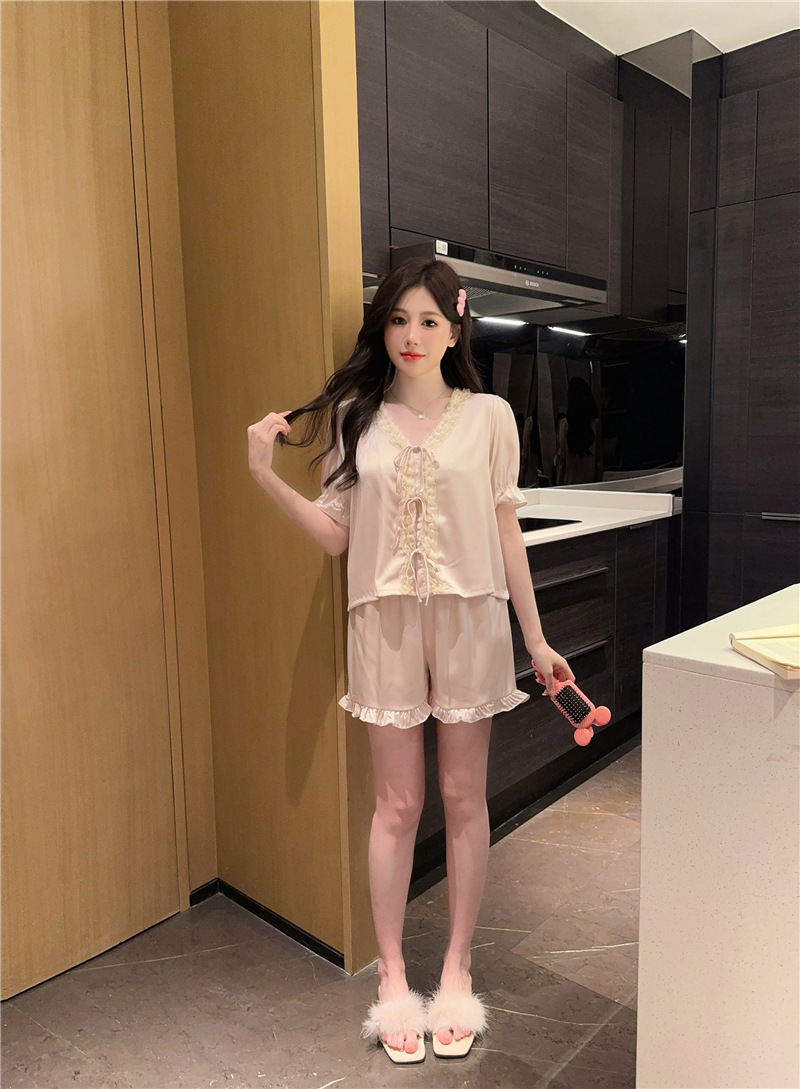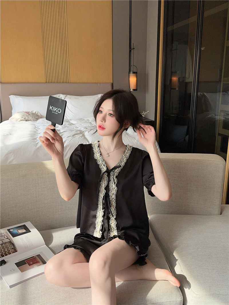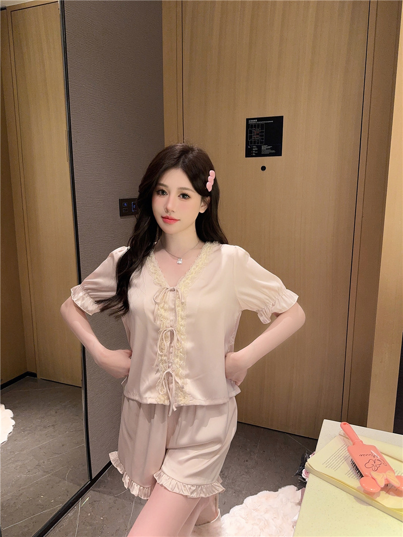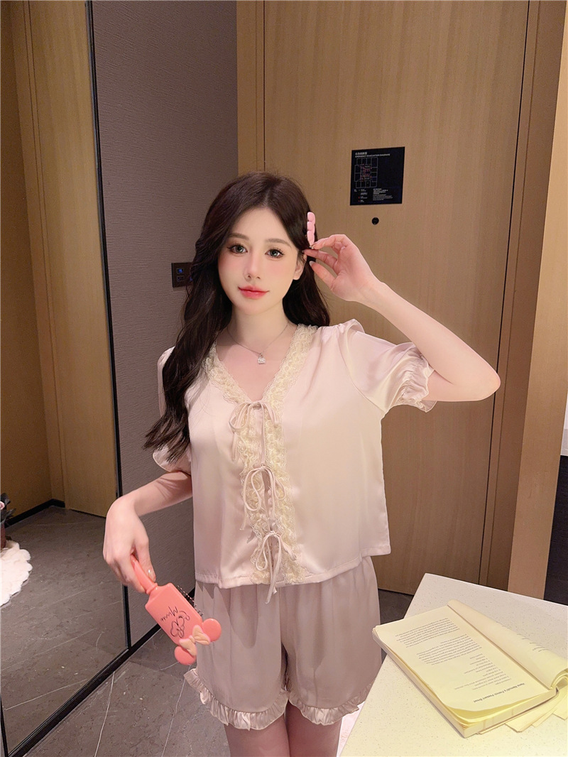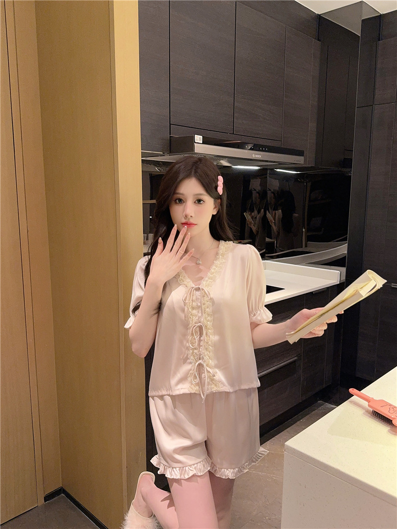 클리어런스 세일, 우아한 아이스 실크 리본 레이스 프릴 반팔 반바지 달콤한 홈웨어 잠옷 세트 여성용스토어 가기