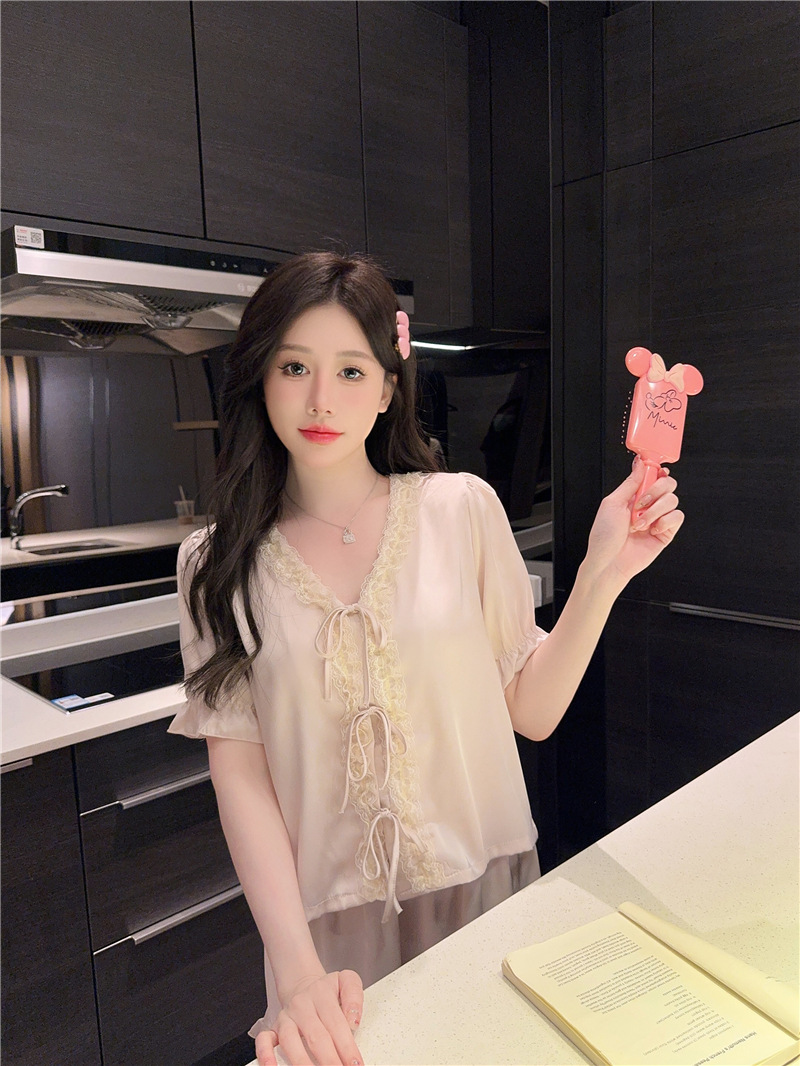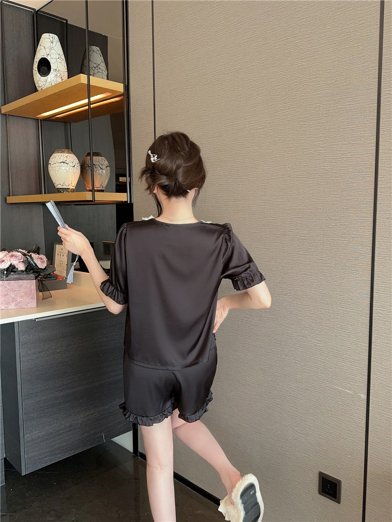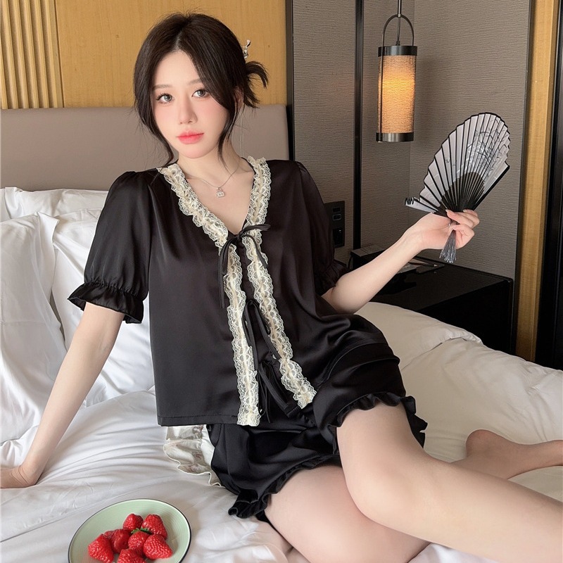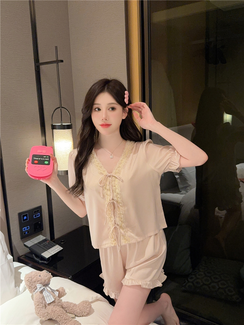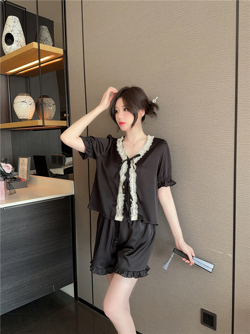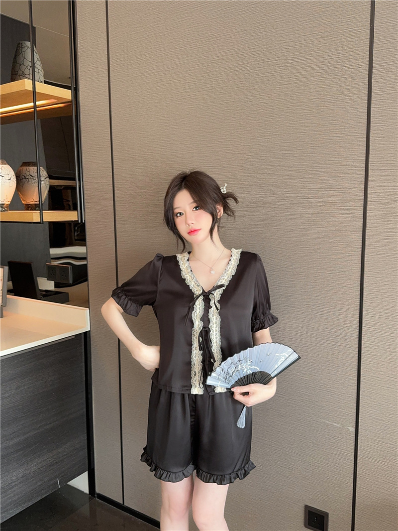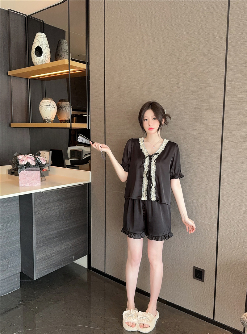 클리어런스 세일, 우아한 아이스 실크 리본 레이스 프릴 반팔 반바지 달콤한 홈웨어 잠옷 세트 여성용스토어 가기