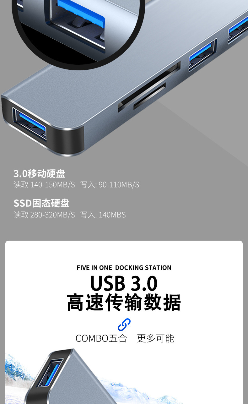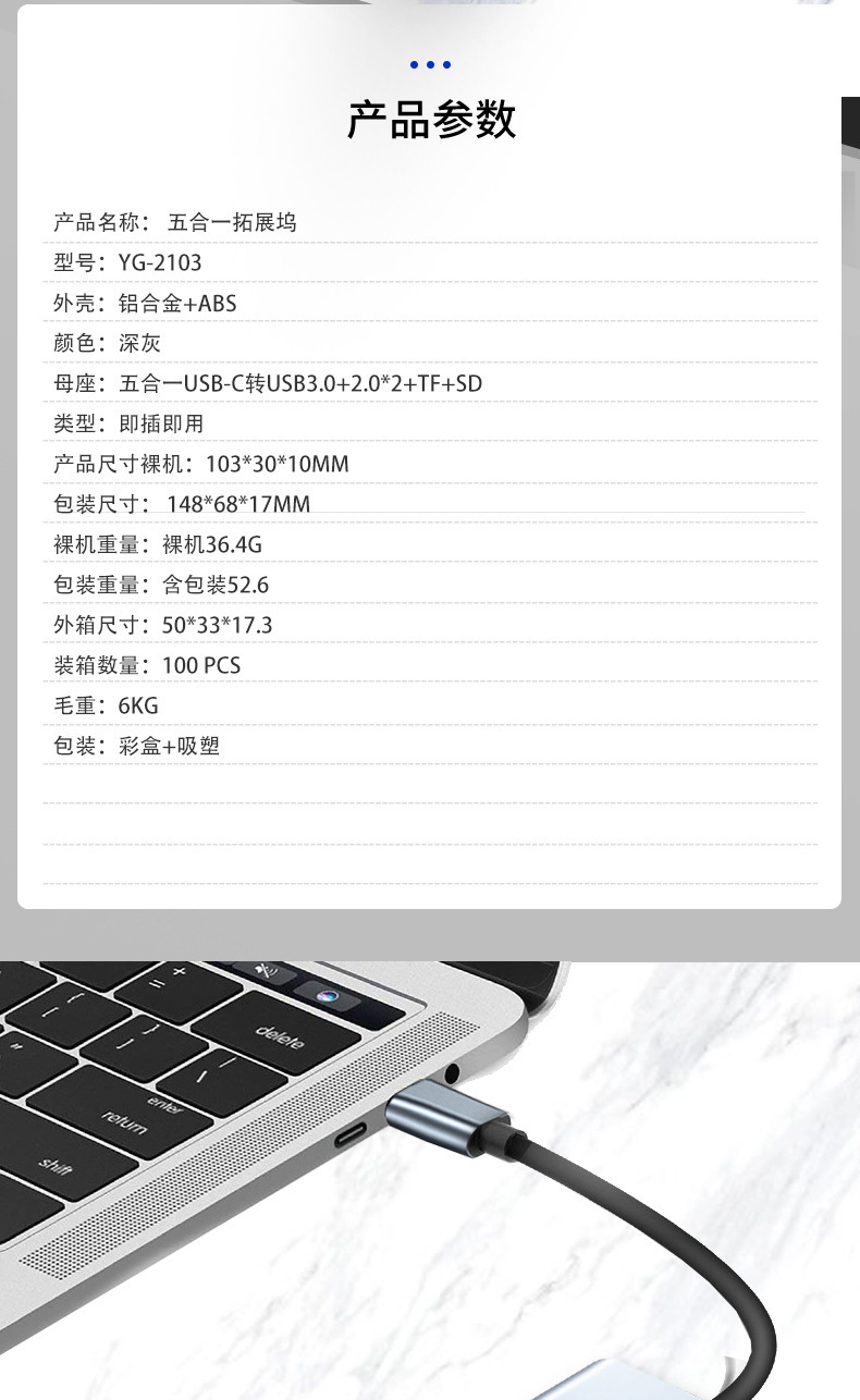 | 接口类型 | USB-C+USB转USB3.0*1+2.0*2+TF+SD | |||