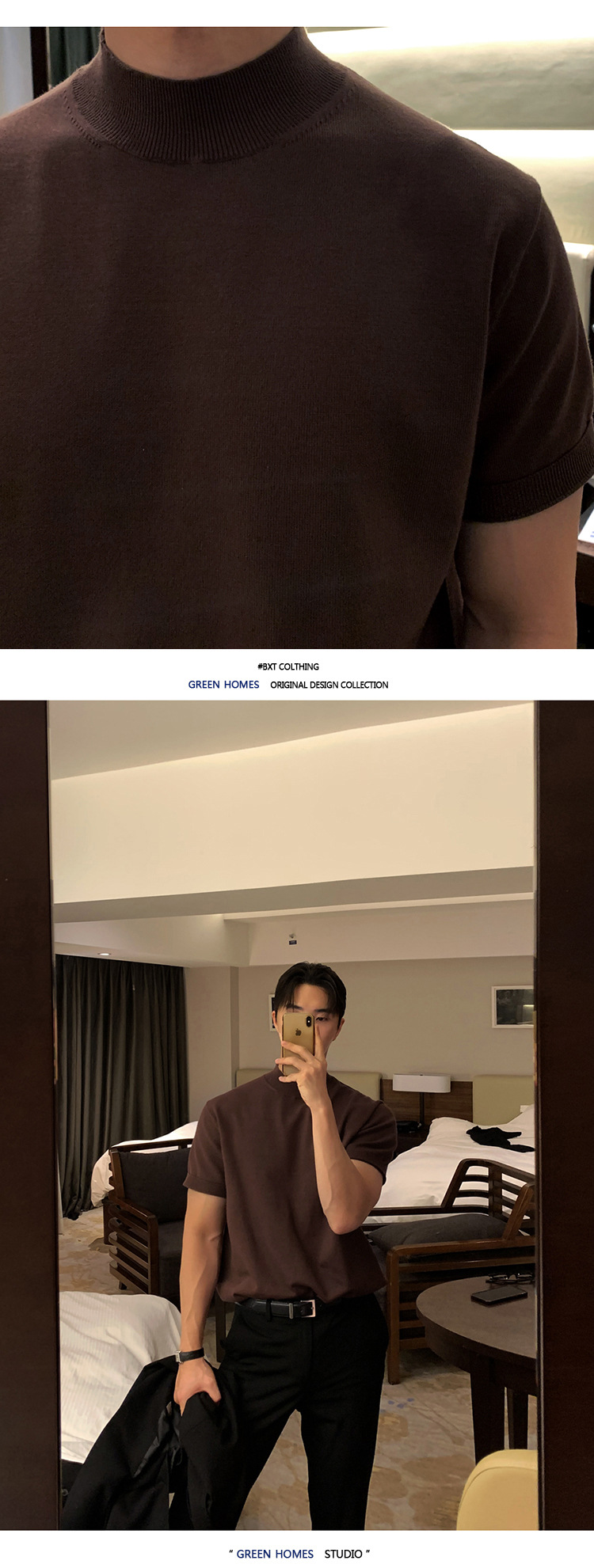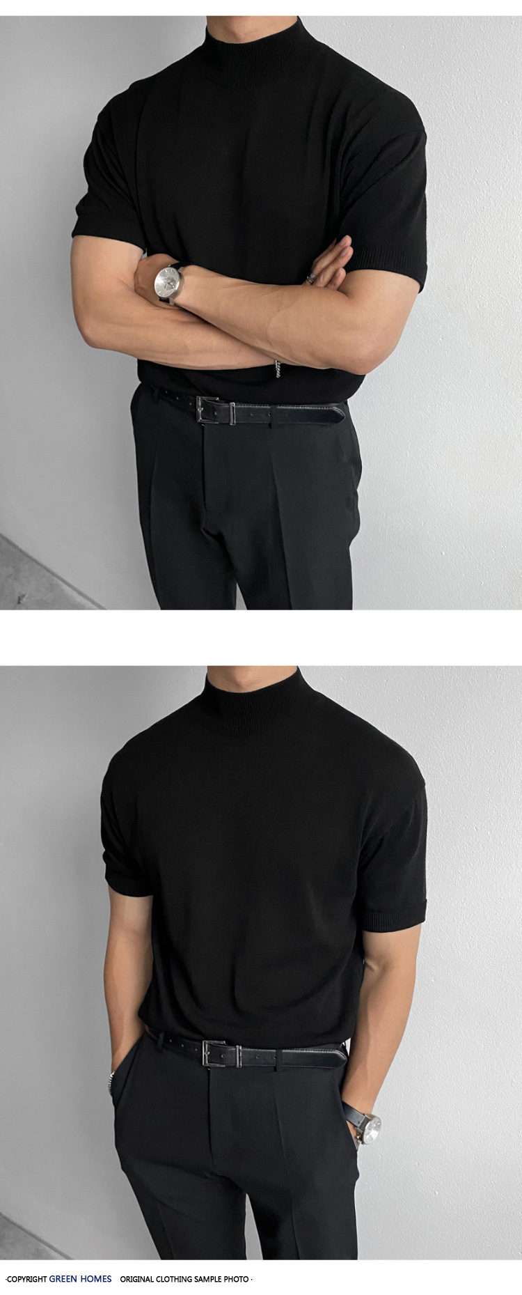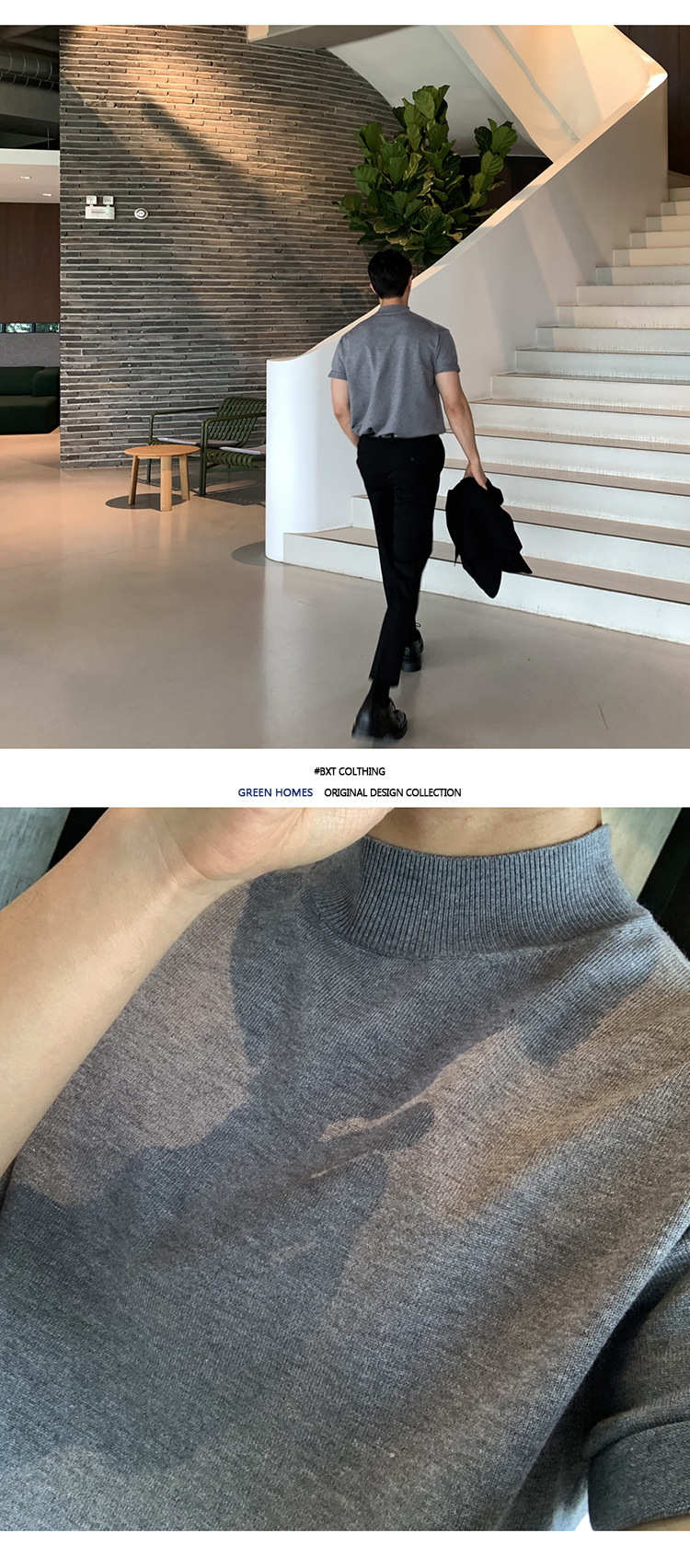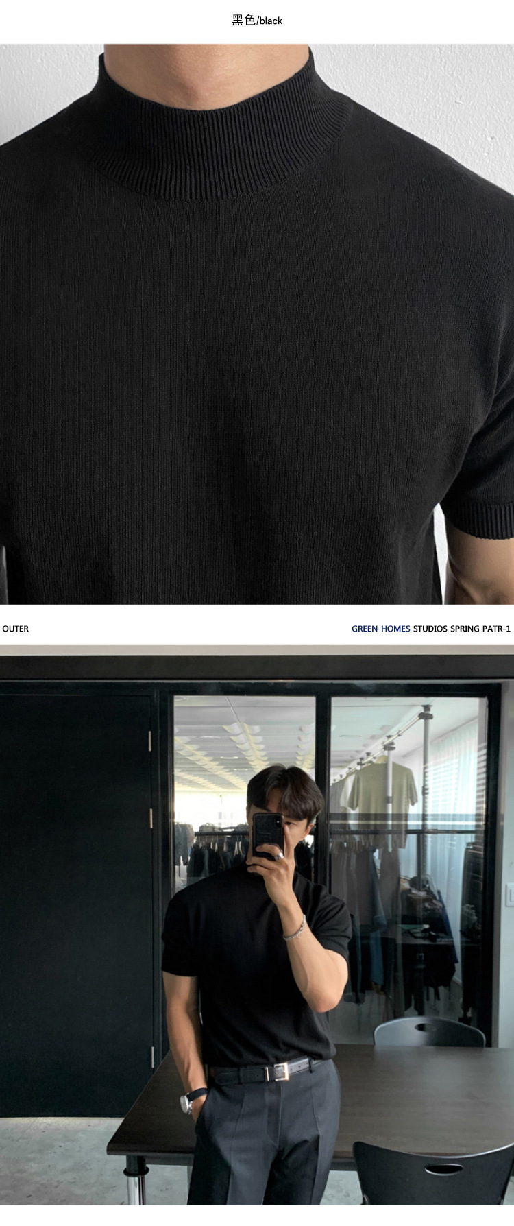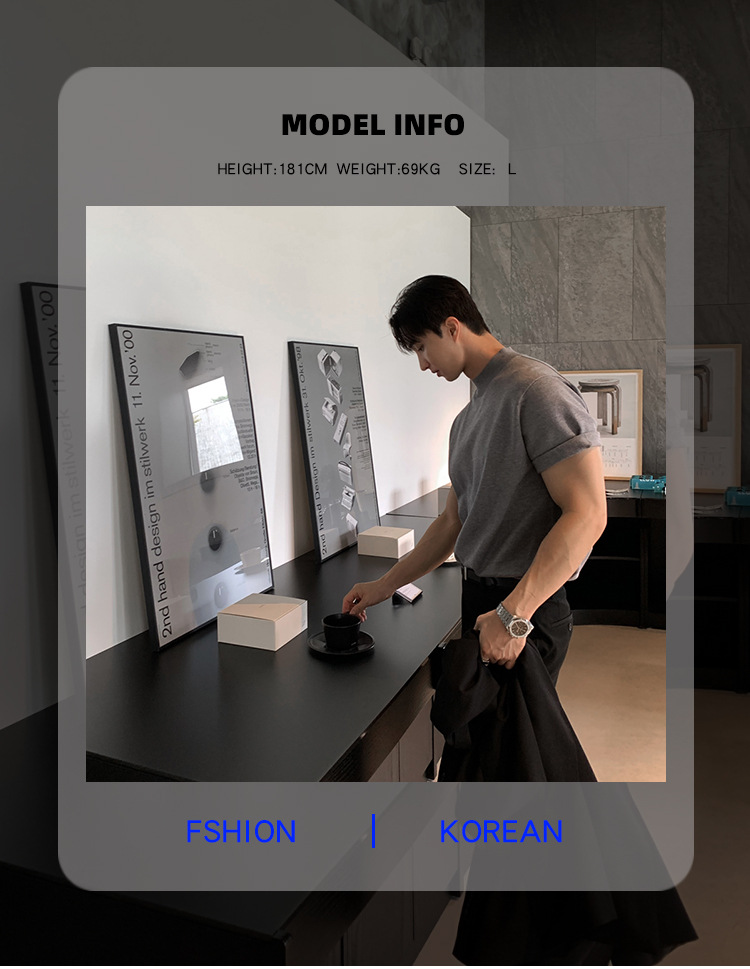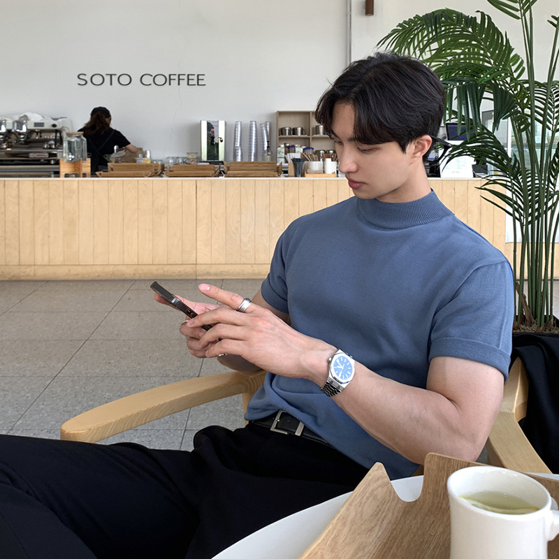 ASCLO 한국식 하이 엔드 스웨터 티셔츠 남성용 캐주얼 느슨한 올 매치 반팔 통기성 라이트 익은 세미 터틀넥 탑스토어 가기
