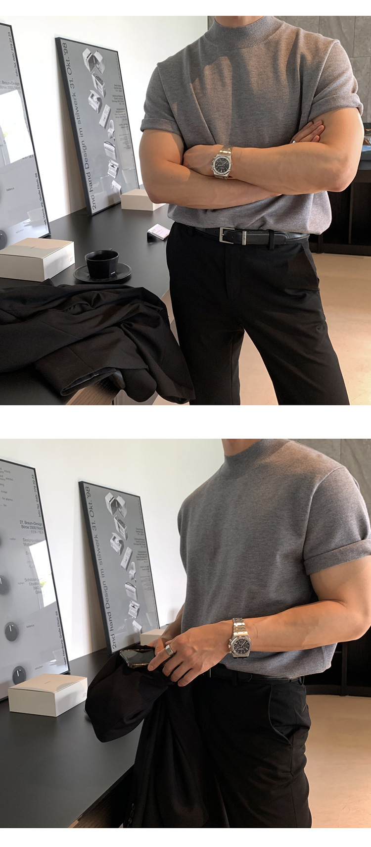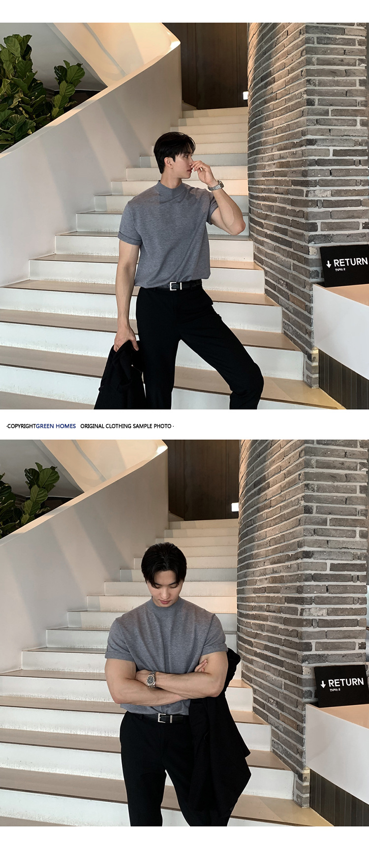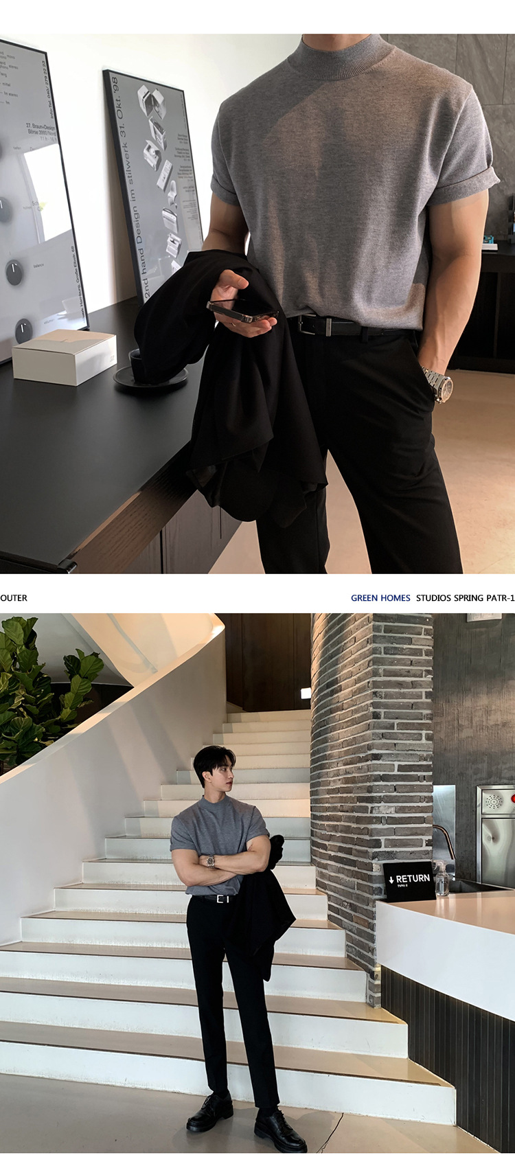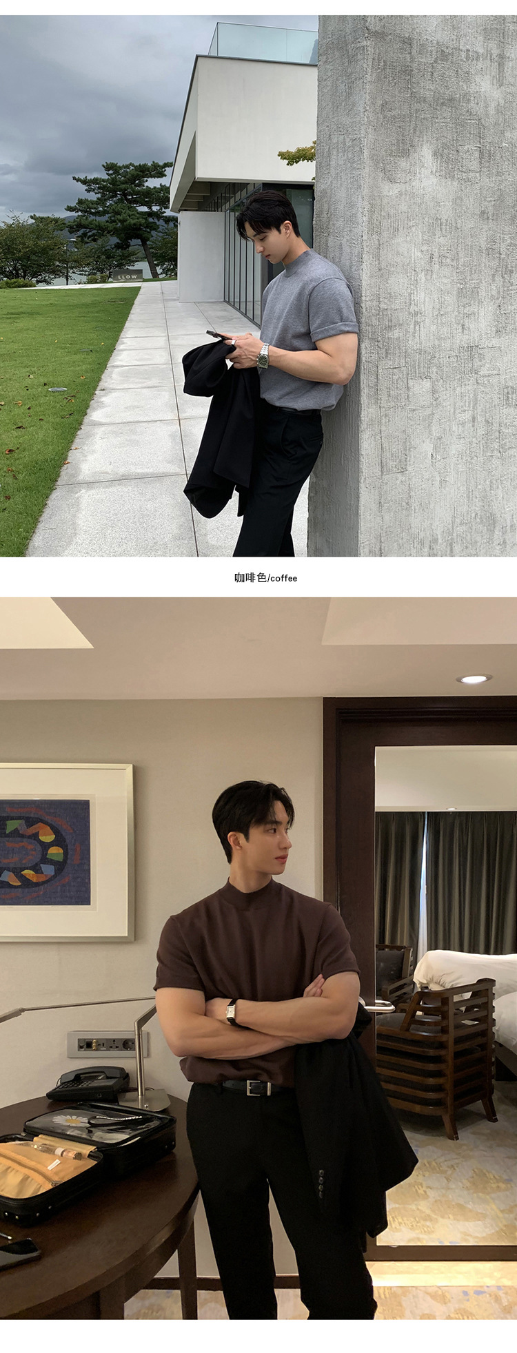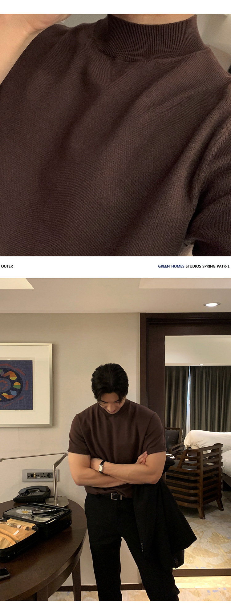 ASCLO 한국식 하이 엔드 스웨터 티셔츠 남성용 캐주얼 느슨한 올 매치 반팔 통기성 라이트 익은 세미 터틀넥 탑스토어 가기