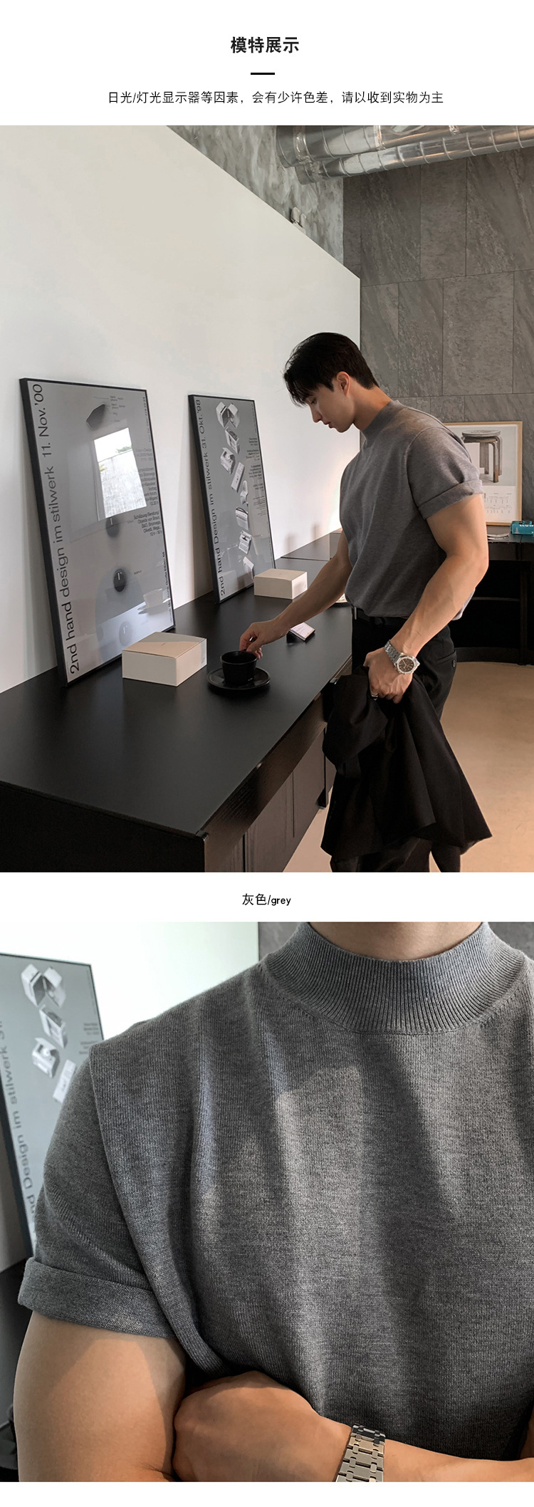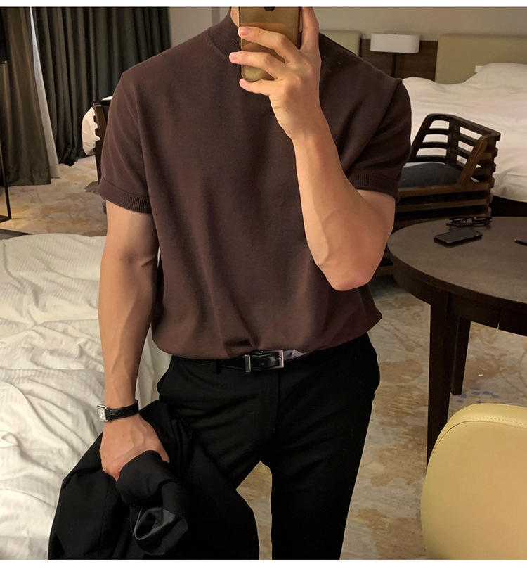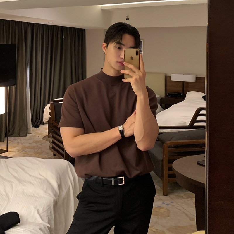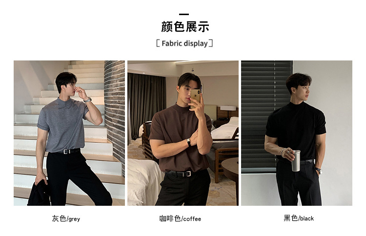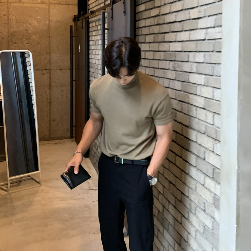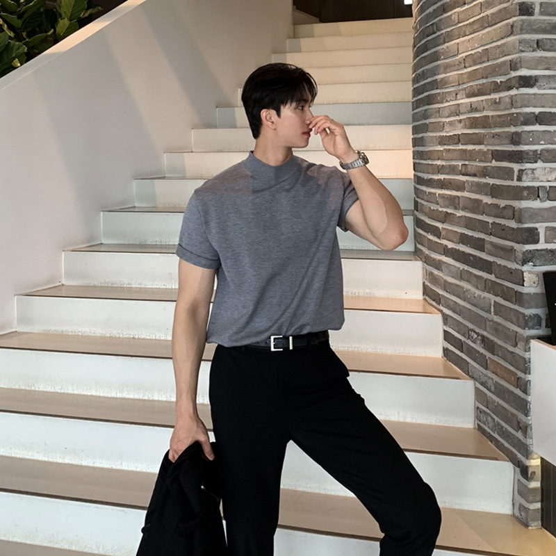 ASCLO 한국식 하이 엔드 스웨터 티셔츠 남성용 캐주얼 느슨한 올 매치 반팔 통기성 라이트 익은 세미 터틀넥 탑