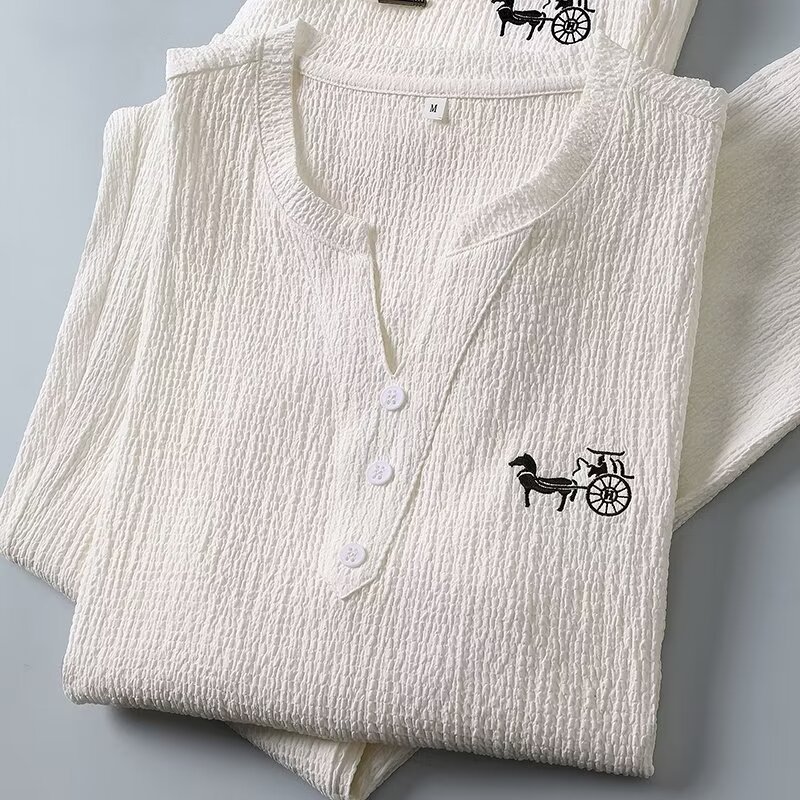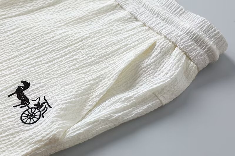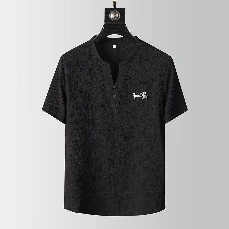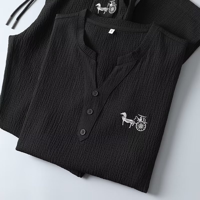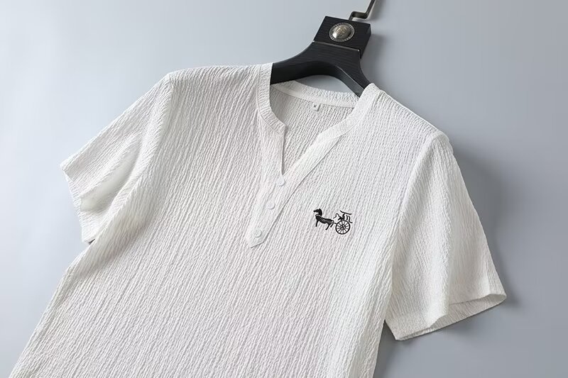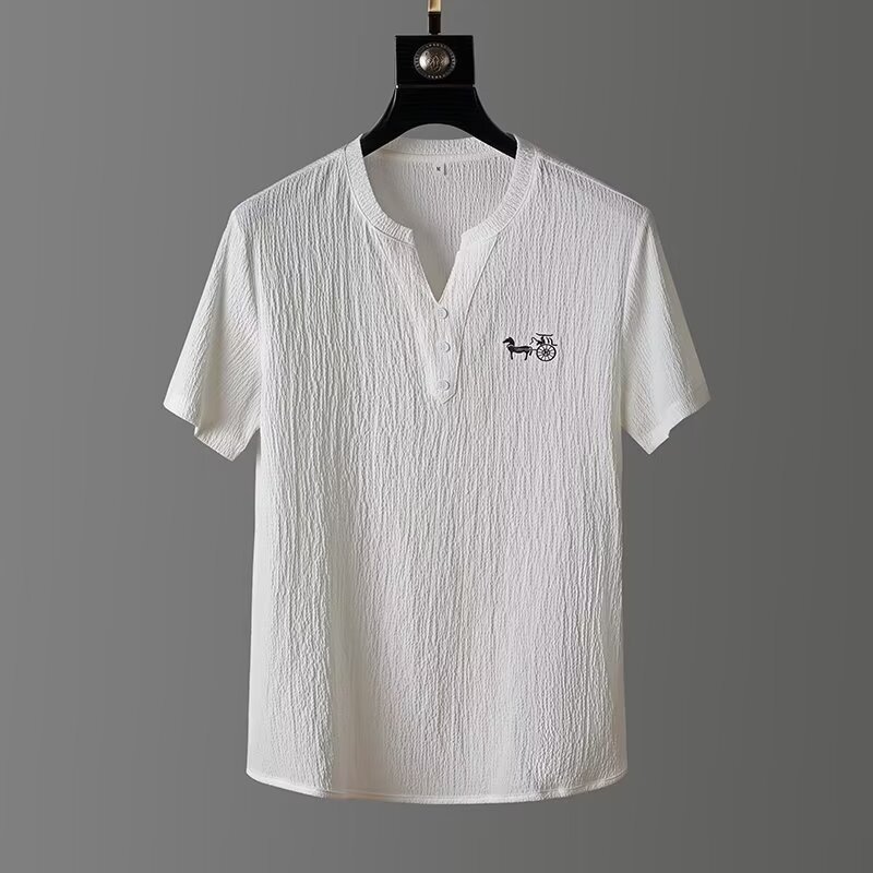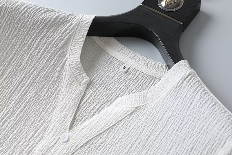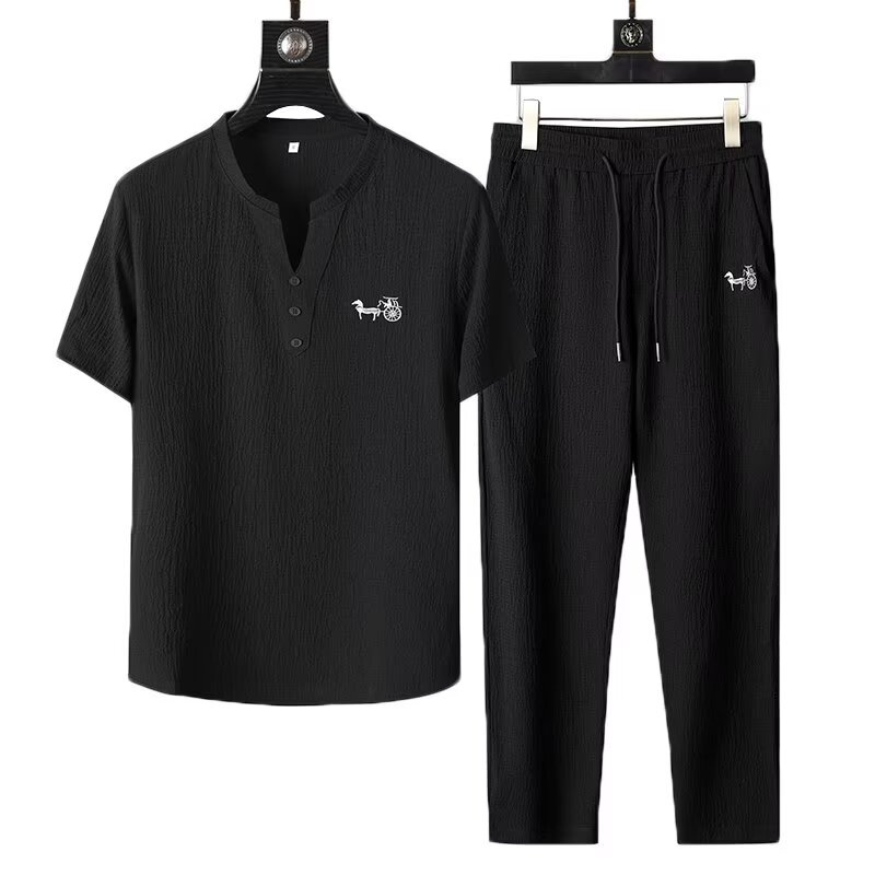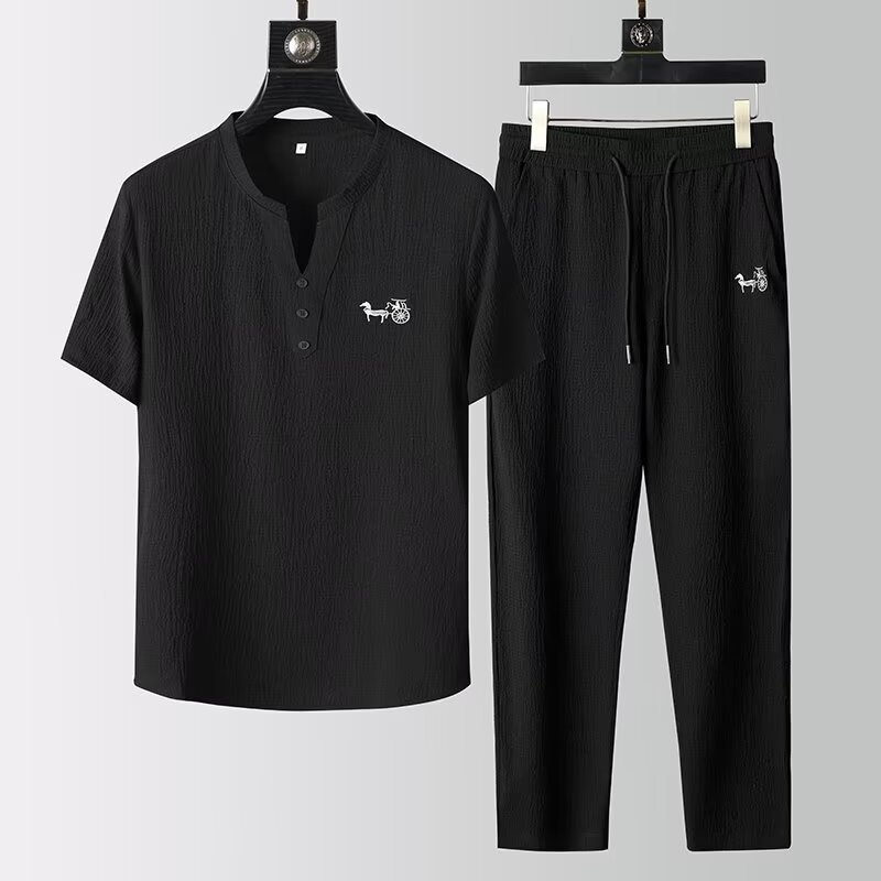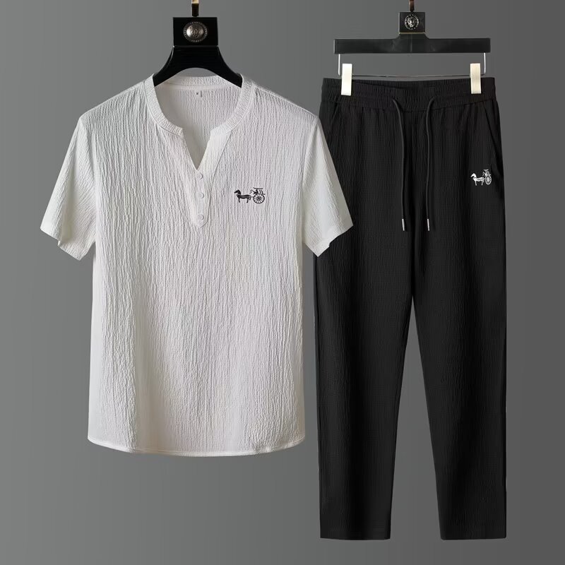 여름 새로운 대형 2 피스 세트 남성면 및 리넨 반팔 티셔츠 중국 스타일 V 넥 화이트 캐주얼 스포츠웨어 남성 의류스토어 가기
