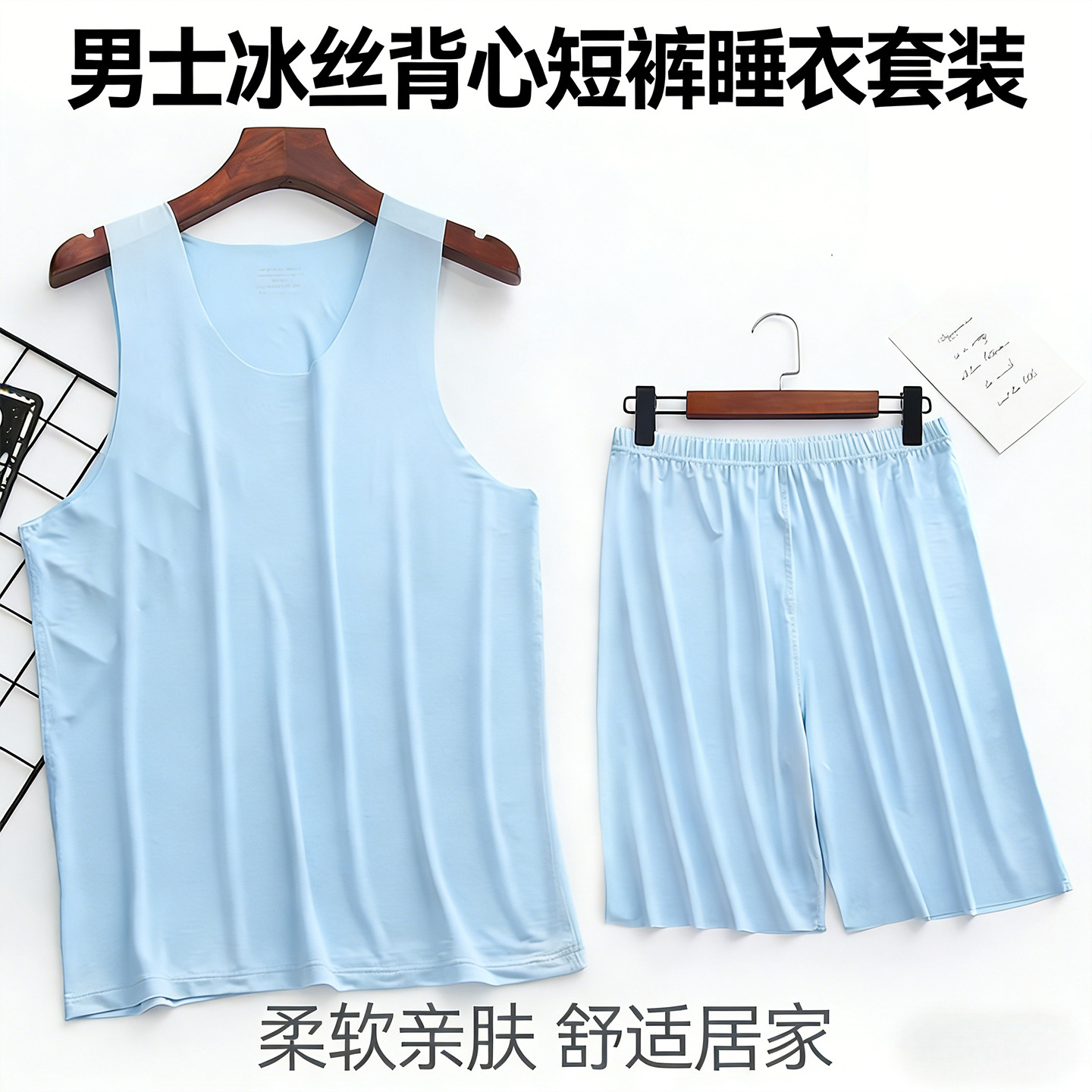 남성용 아이스 실크 홈웨어 세트, 무봉제 조끼와 반바지, 여름철 시원한 민소매 남성용 초박형 잠옷스토어 가기