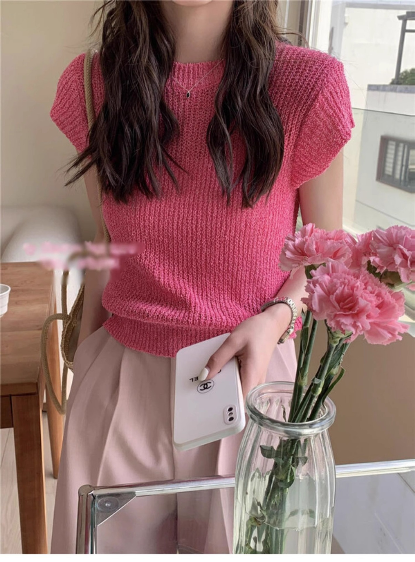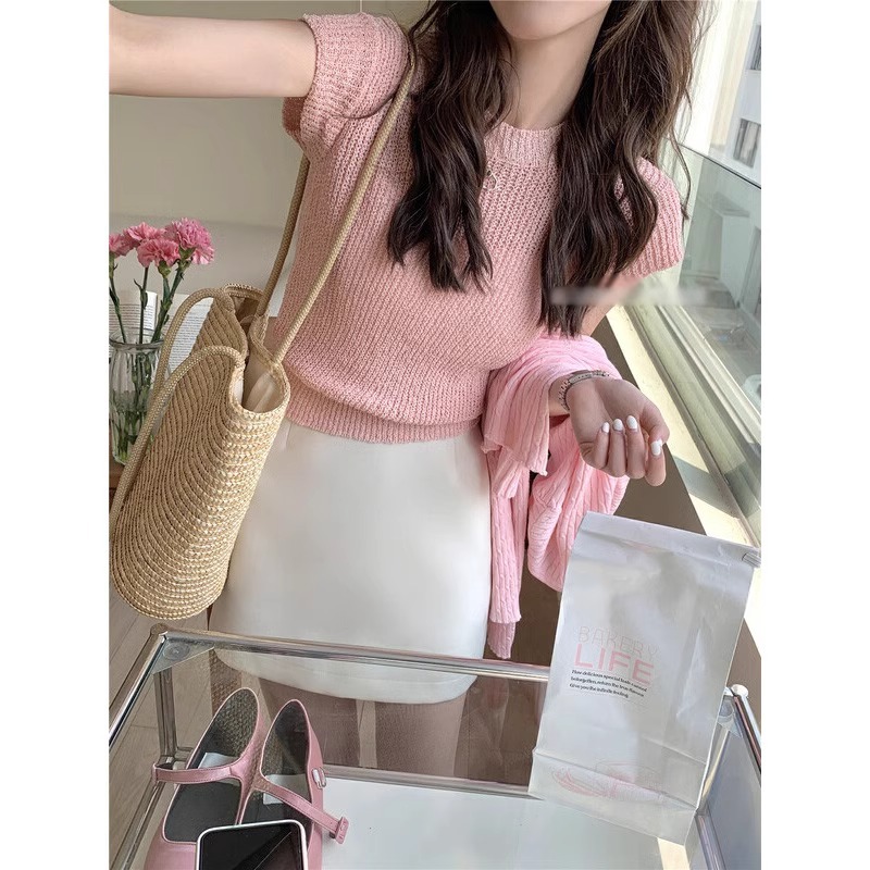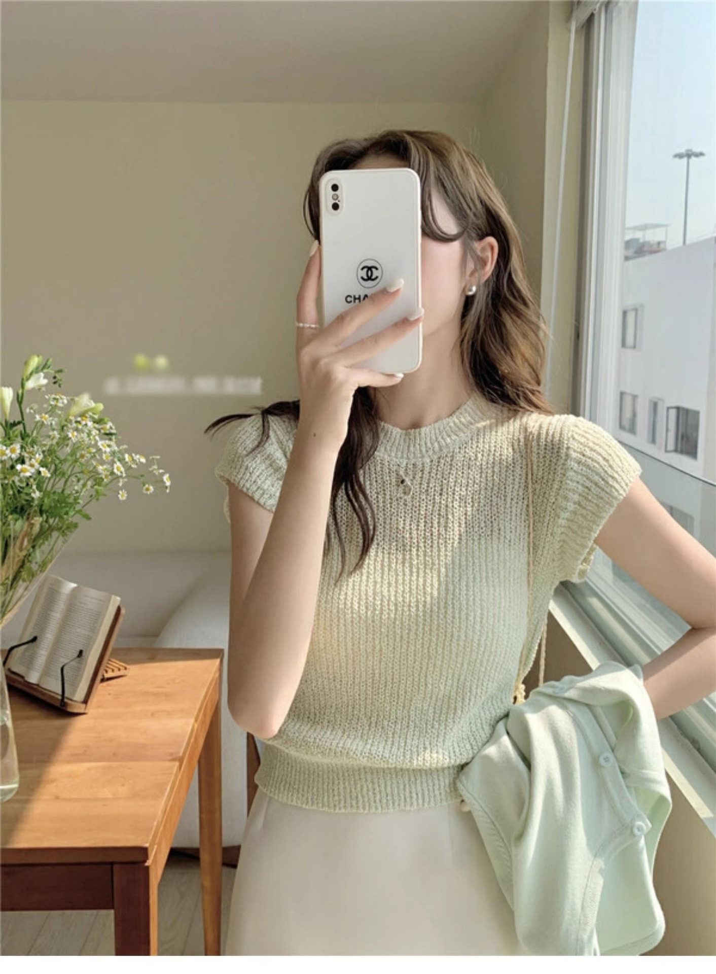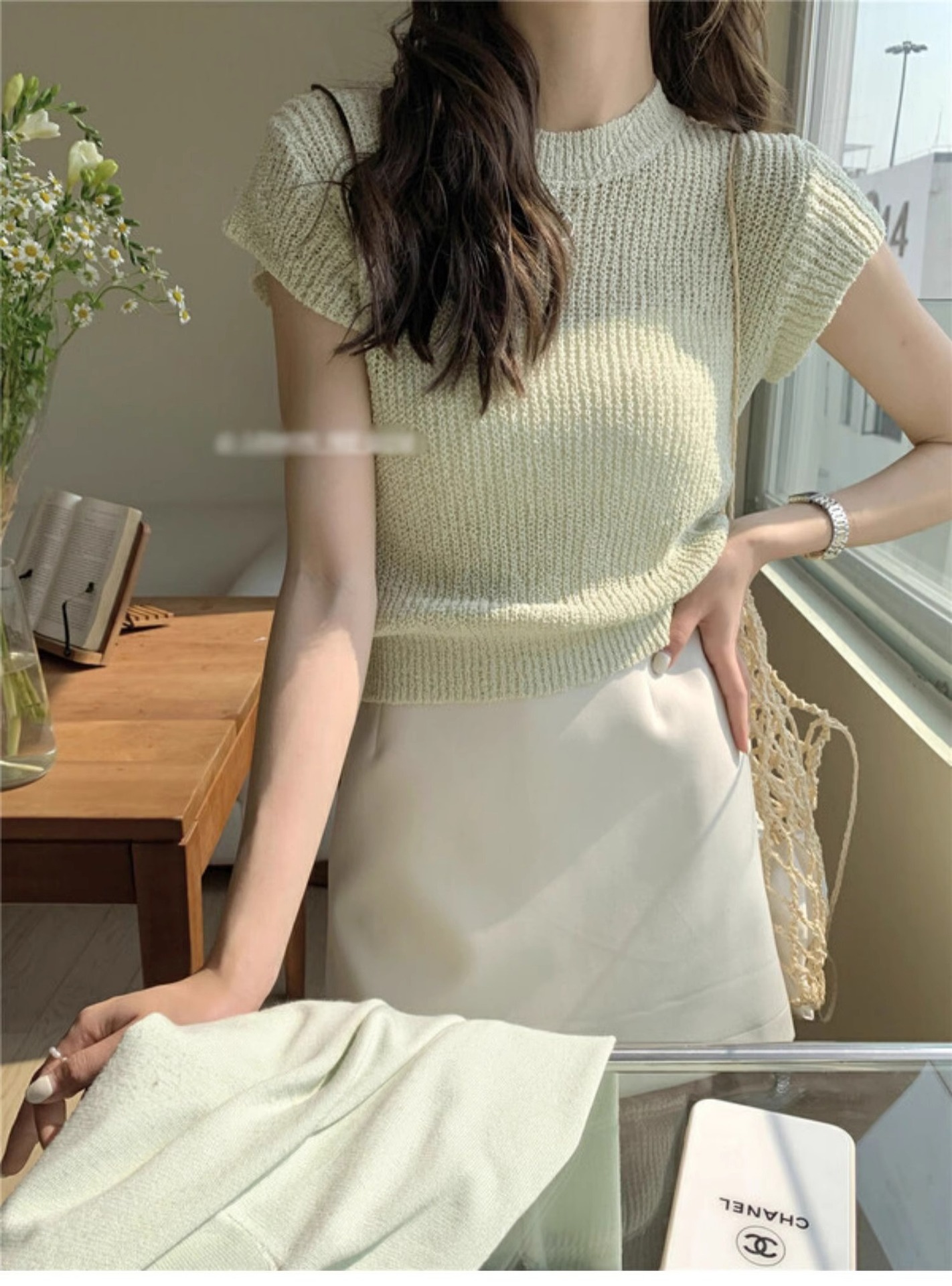 그린 아이스 실크 니트 반팔 어깨 티셔츠 여성용 봄과 여름 부드러운 간단한 캐주얼 슬림 핏 프렌치 쇼트 탑