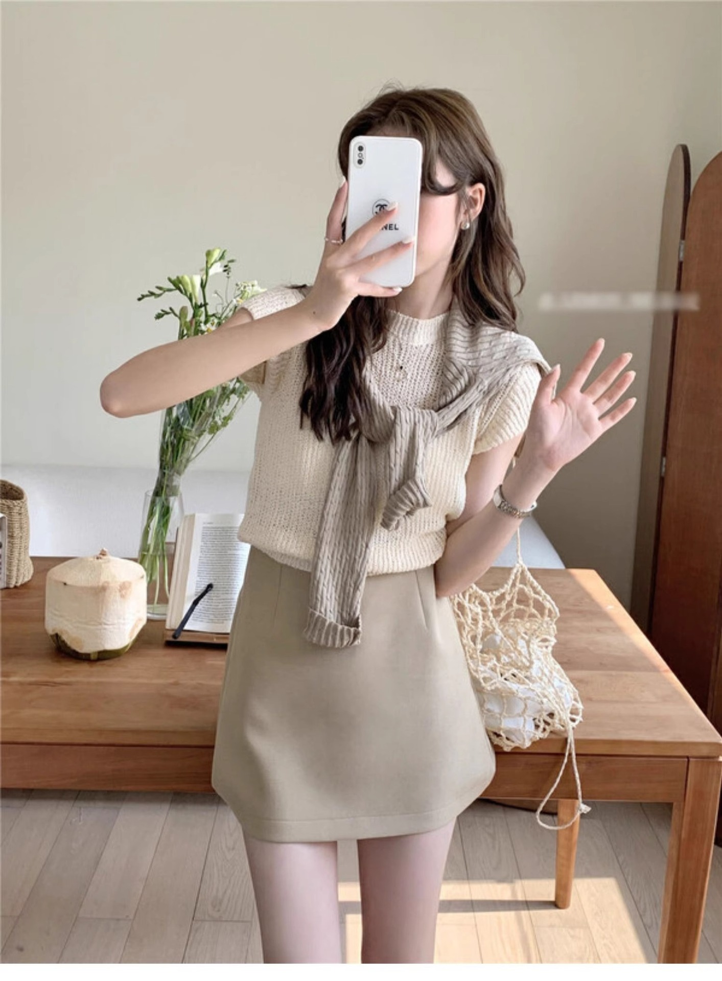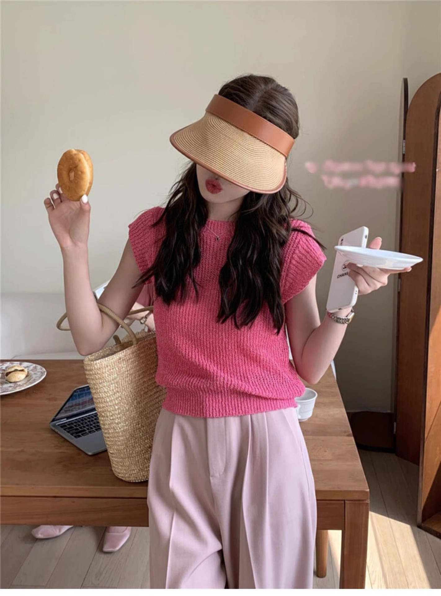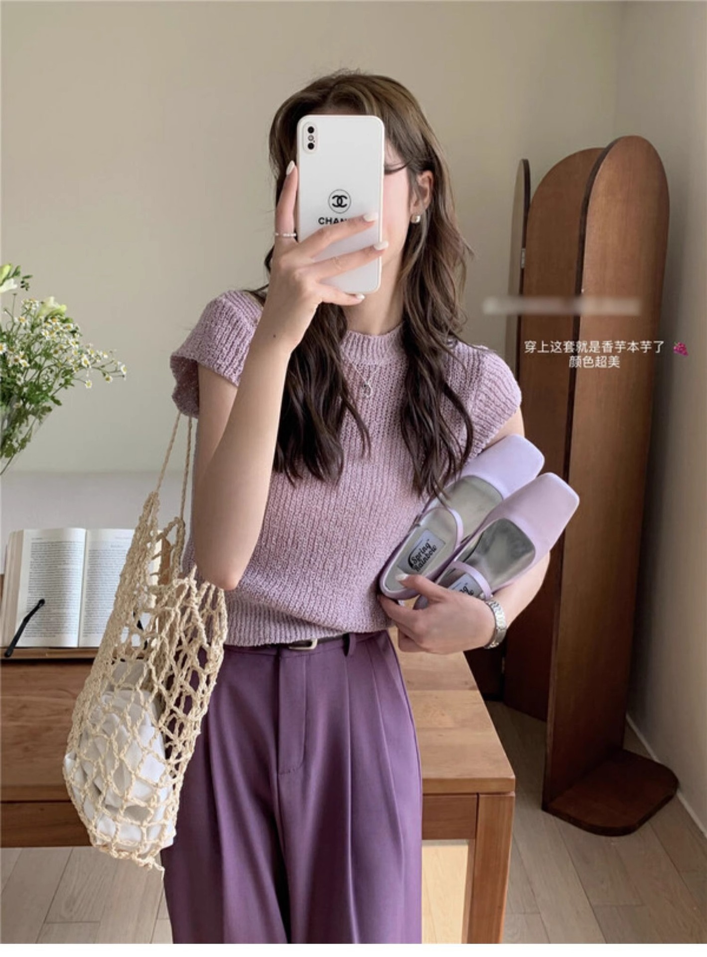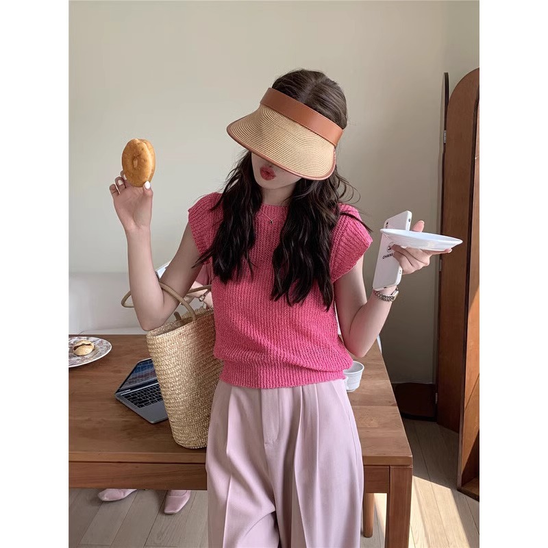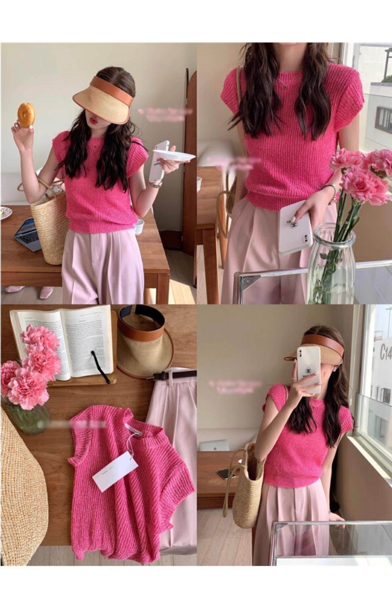 그린 아이스 실크 니트 반팔 어깨 티셔츠 여성용 봄과 여름 부드러운 간단한 캐주얼 슬림 핏 프렌치 쇼트 탑