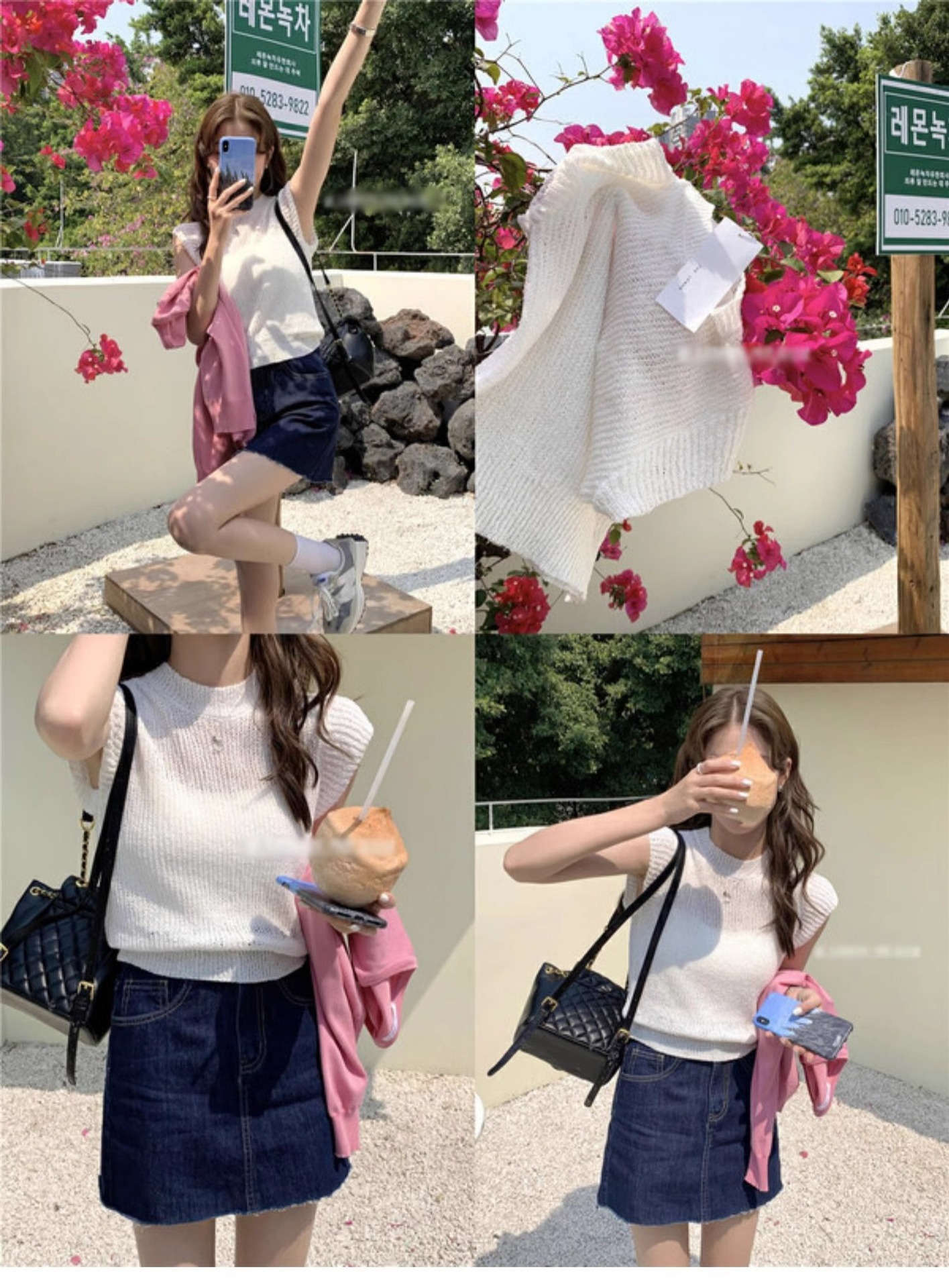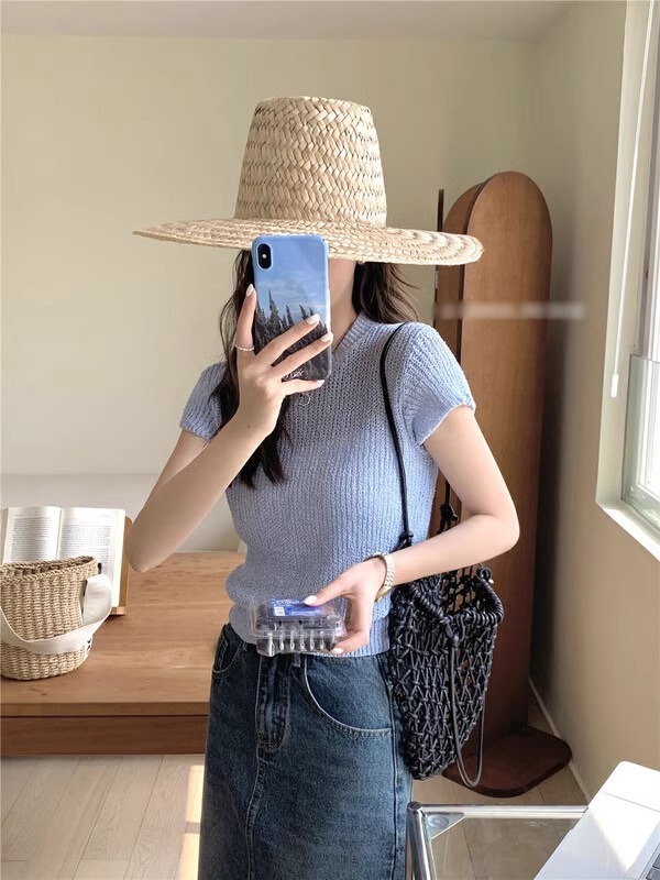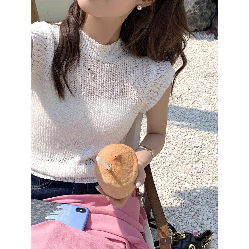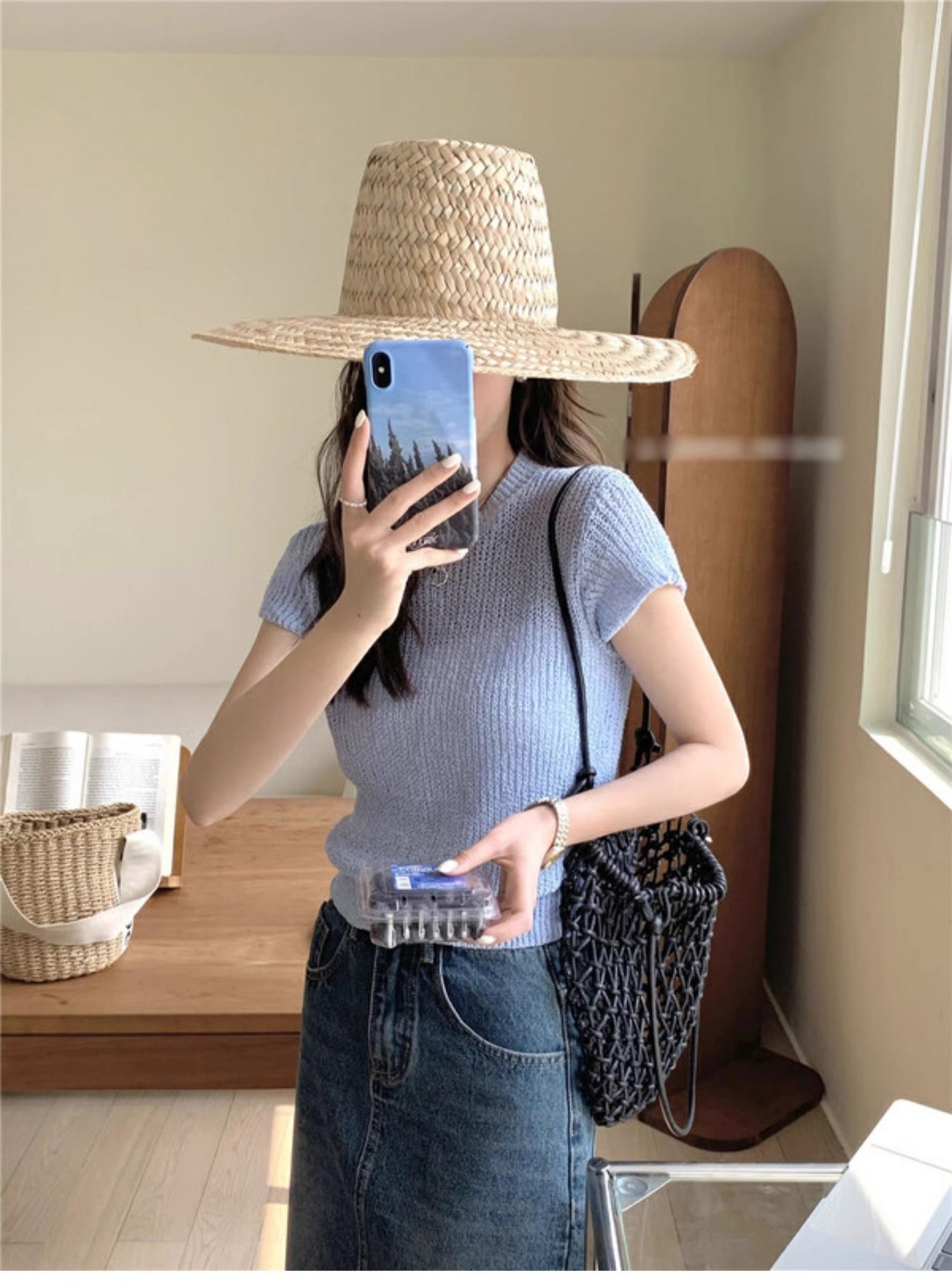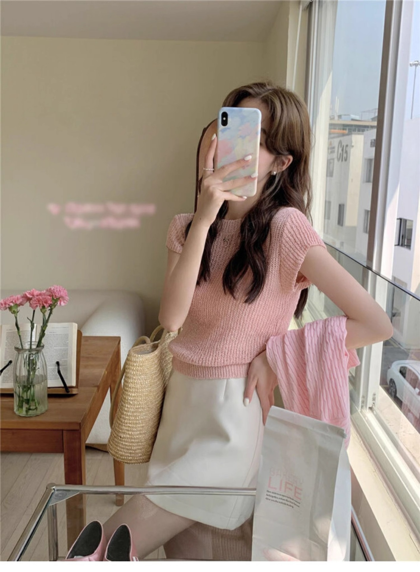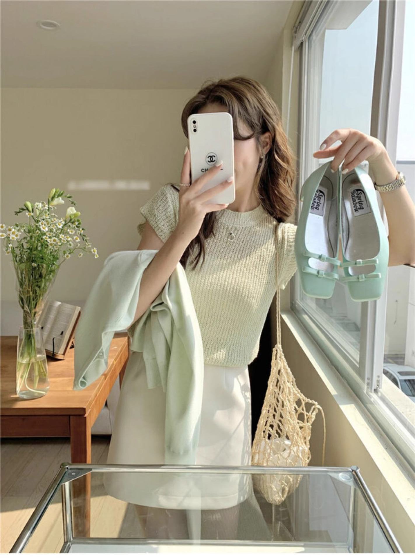 그린 아이스 실크 니트 반팔 어깨 티셔츠 여성용 봄과 여름 부드러운 간단한 캐주얼 슬림 핏 프렌치 쇼트 탑스토어 가기