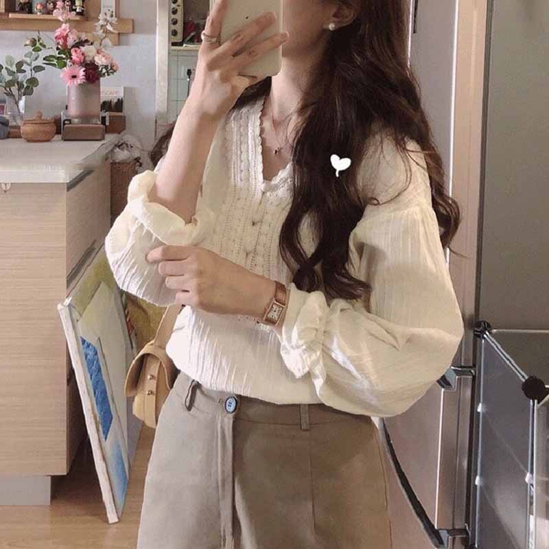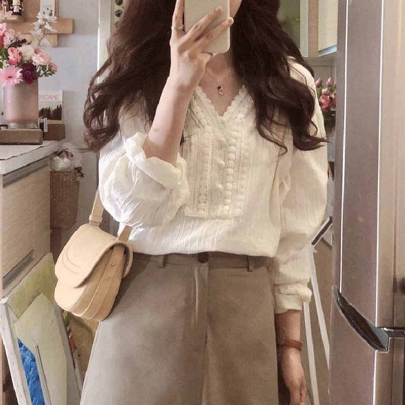 프랑스 스타일의 세련된 살구색 V 넥 긴팔 셔츠 여성의 2024 봄과 여름 레이스 탑 디자인 틈새 셔츠스토어 가기