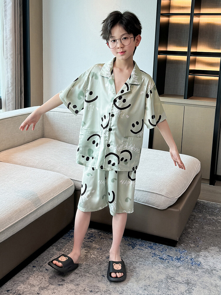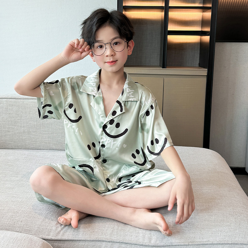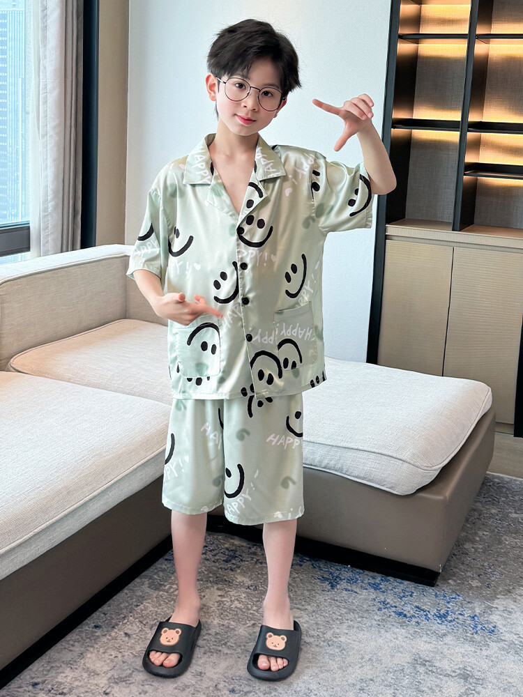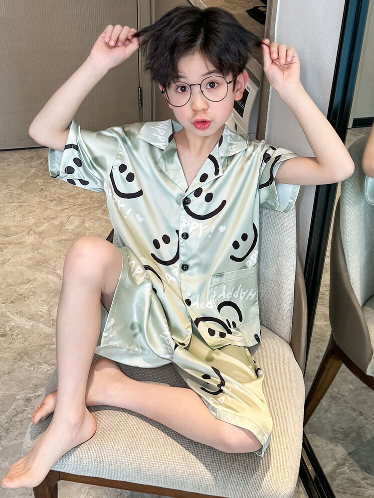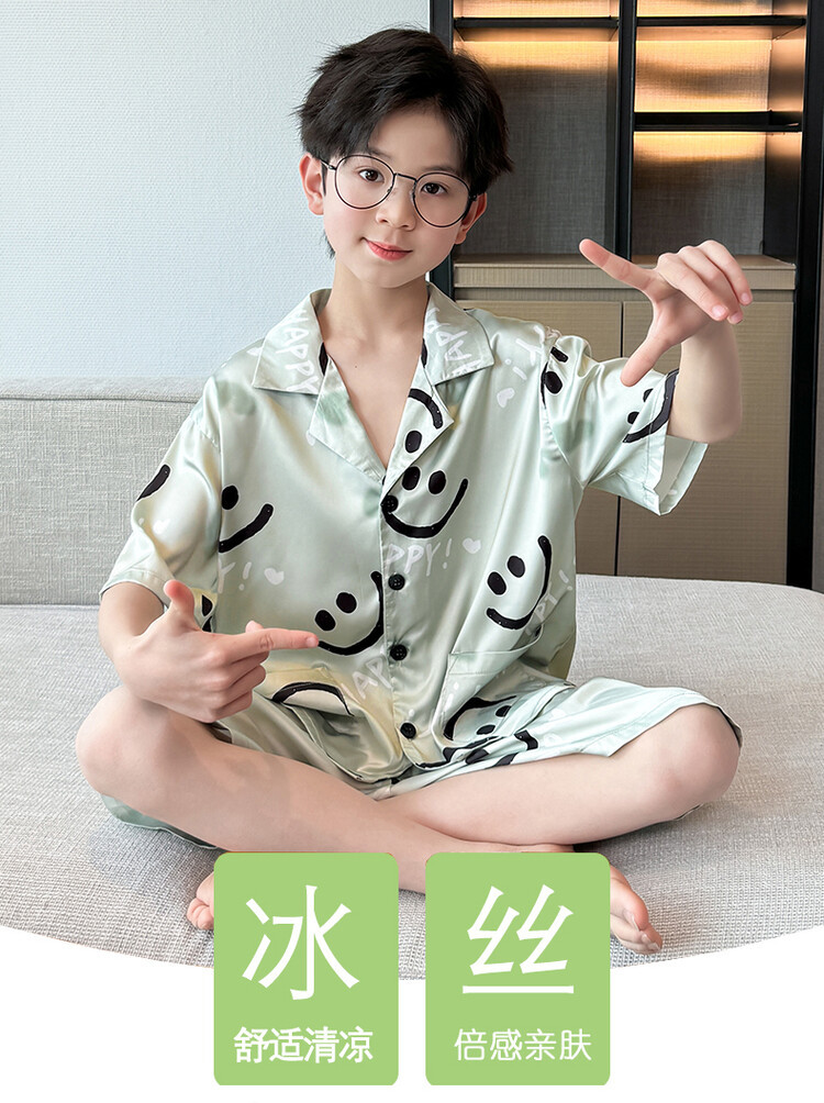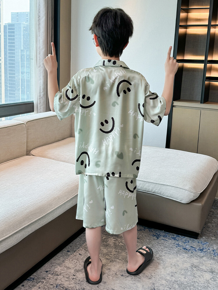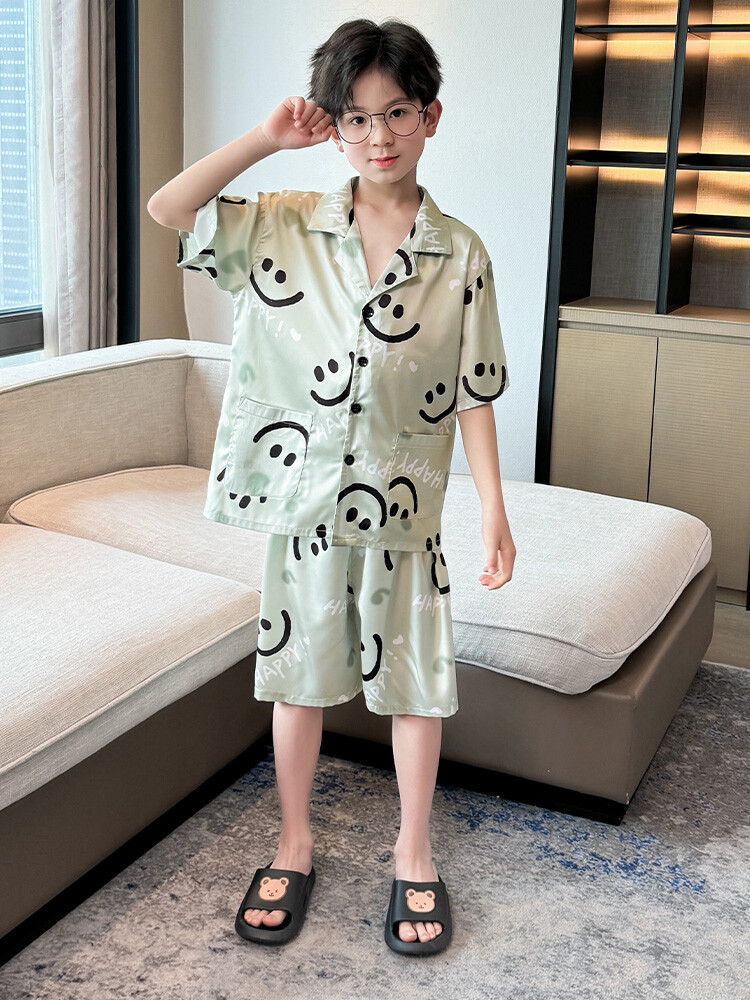 남학생 웃는 얼굴 홈 세트 여름 대형 어린이 얇은 에어컨 세트 반팔 반바지 아이스 실크 파자마 투피스 세트