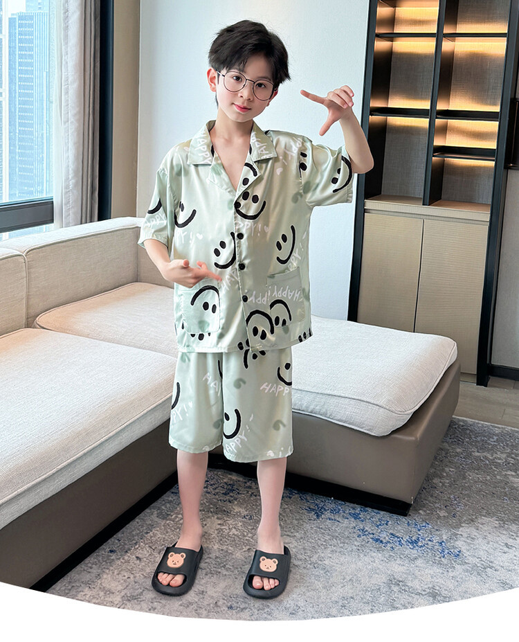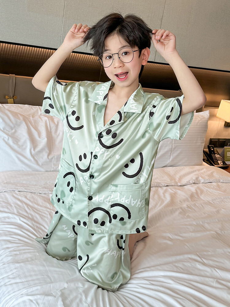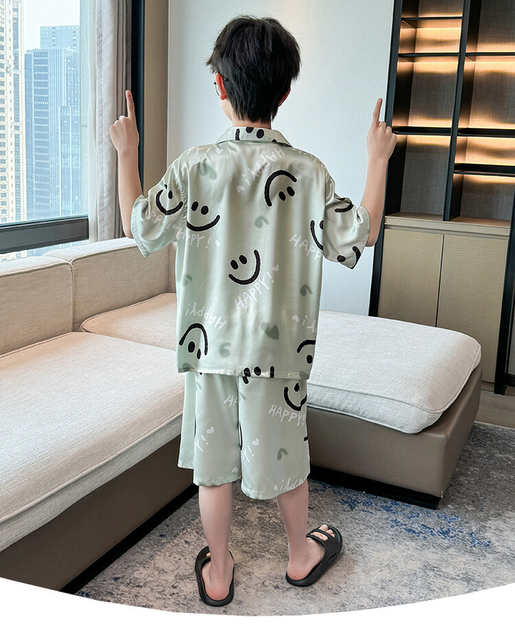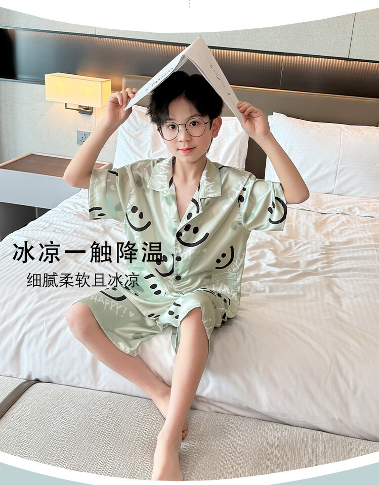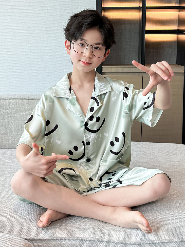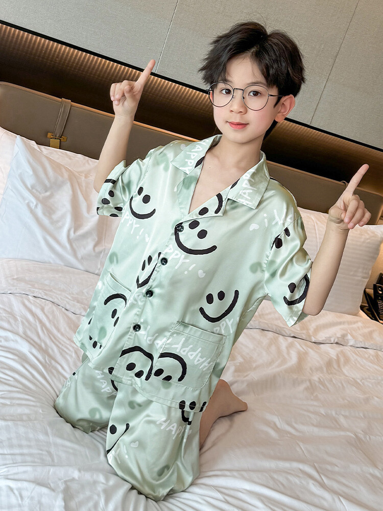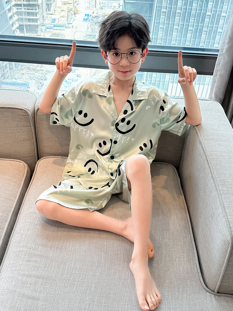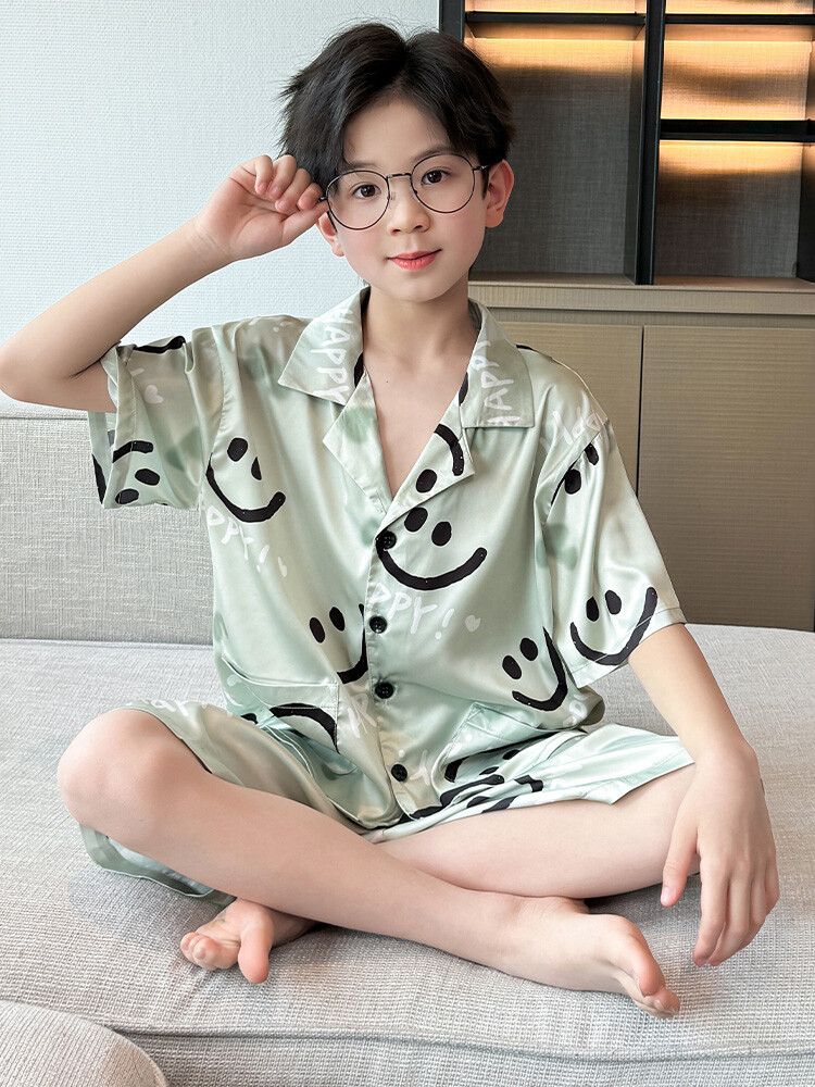 남학생 웃는 얼굴 홈 세트 여름 대형 어린이 얇은 에어컨 세트 반팔 반바지 아이스 실크 파자마 투피스 세트