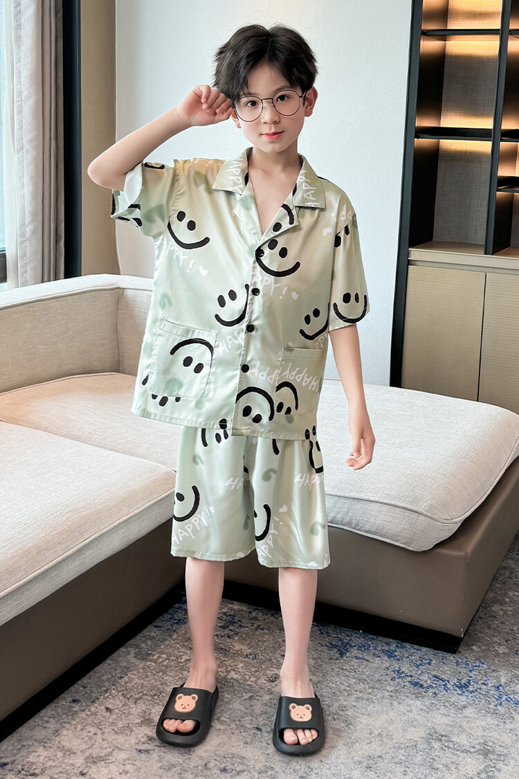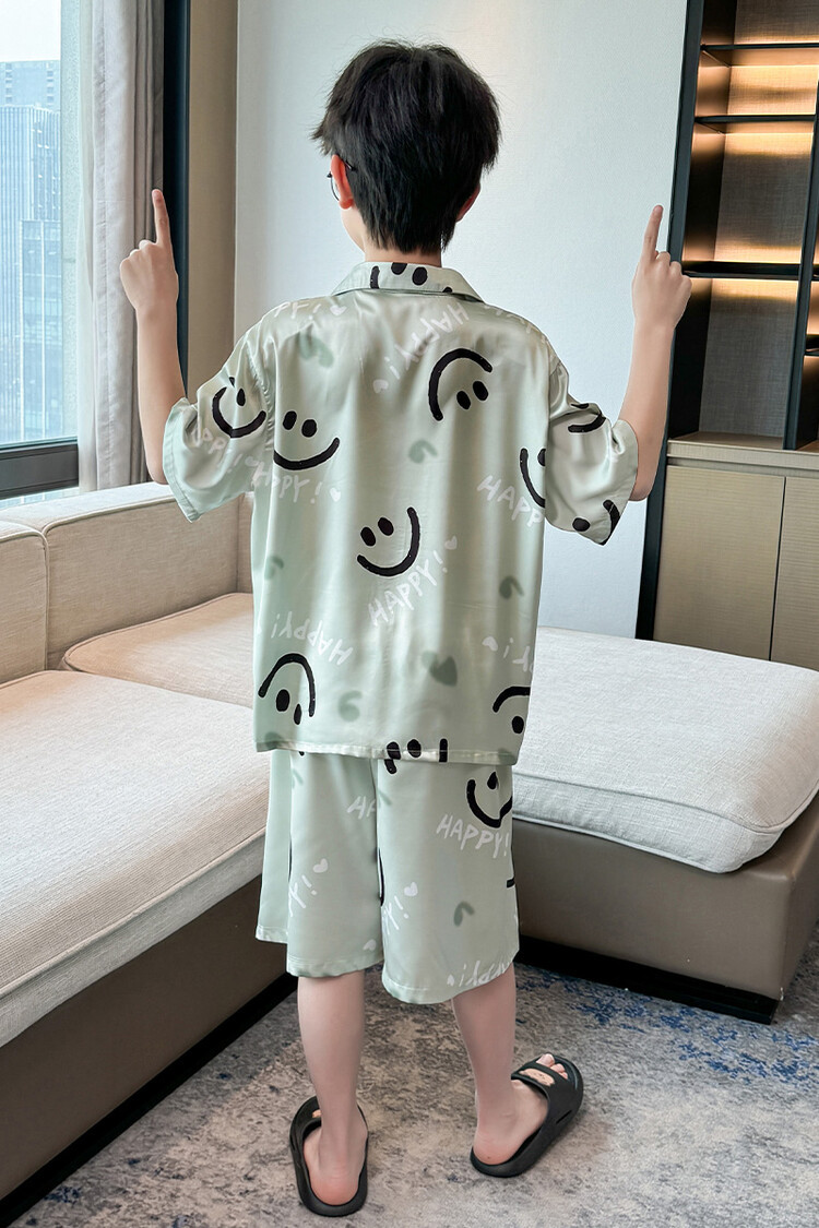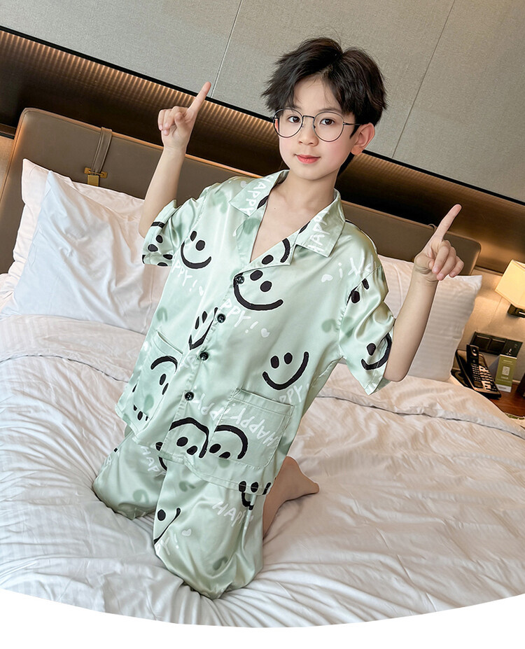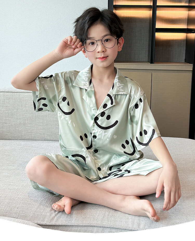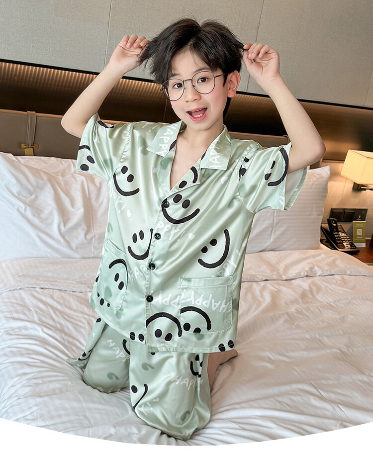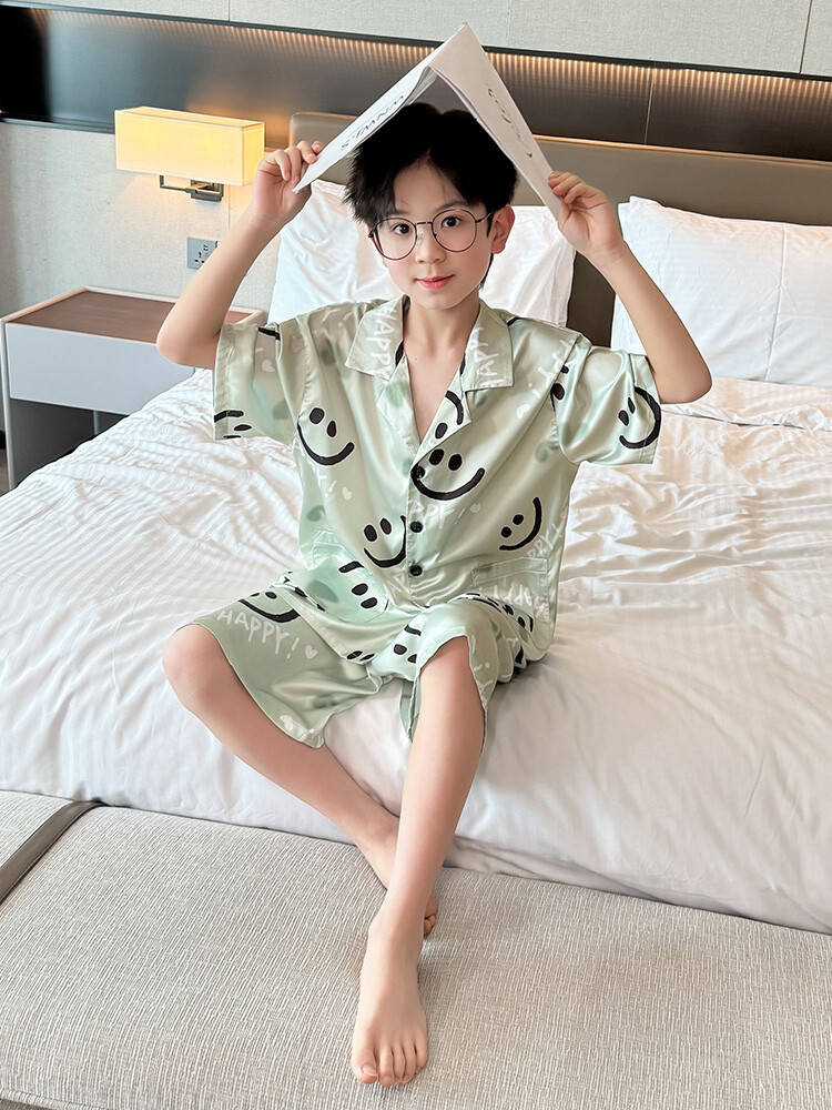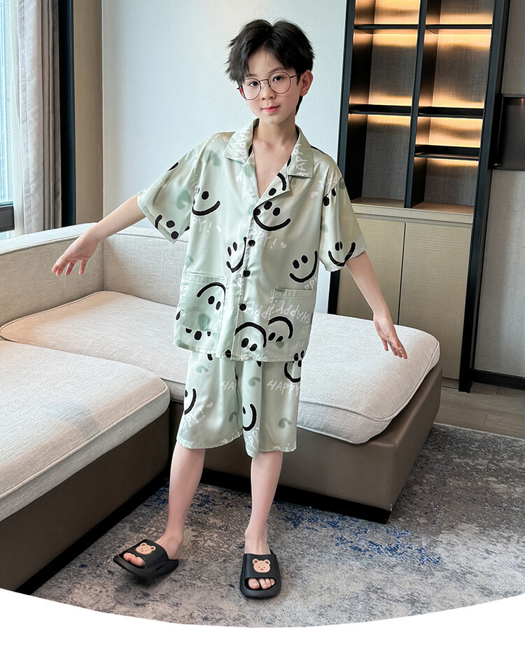 남학생 웃는 얼굴 홈 세트 여름 대형 어린이 얇은 에어컨 세트 반팔 반바지 아이스 실크 파자마 투피스 세트