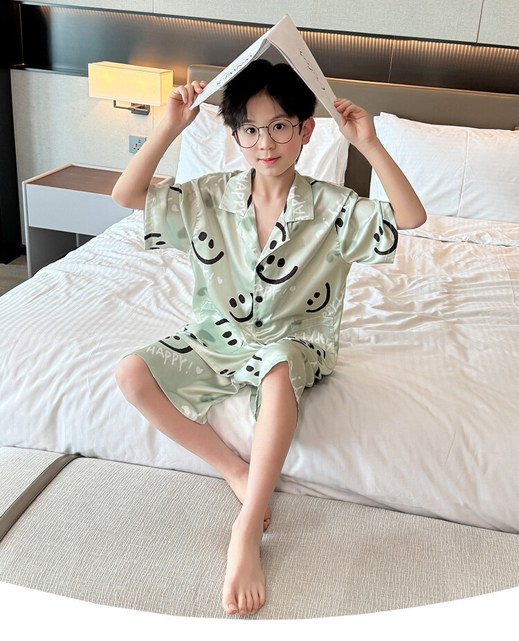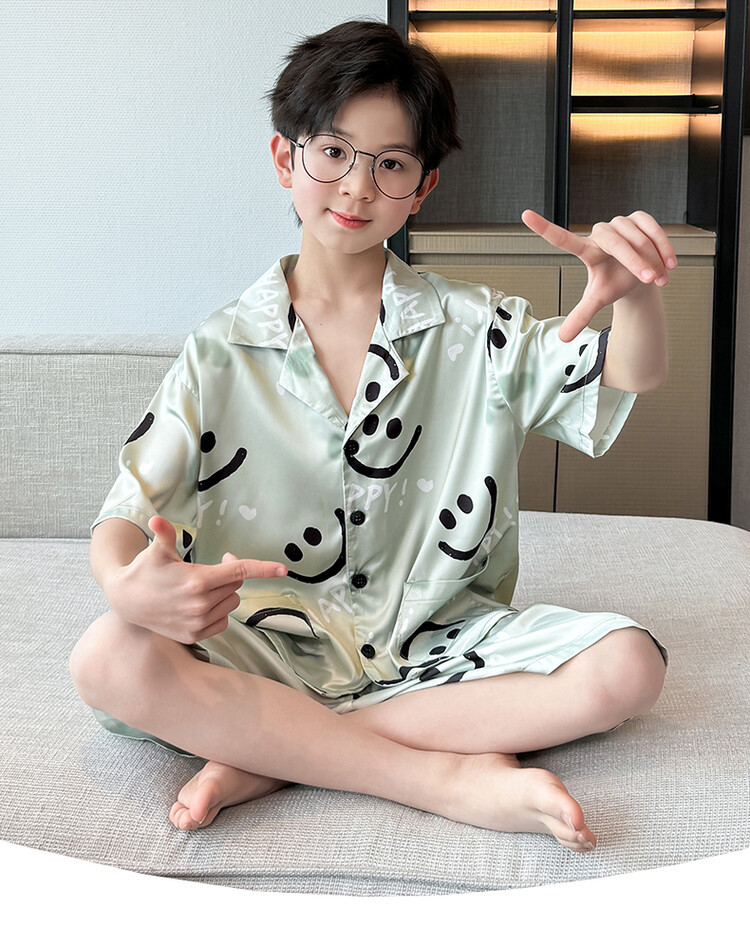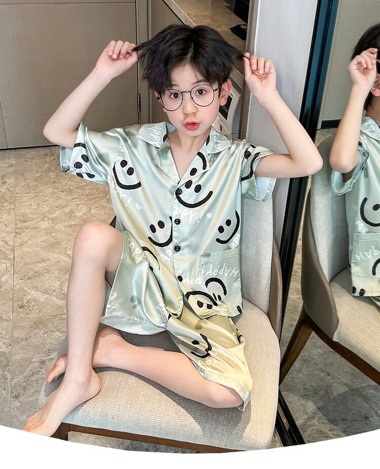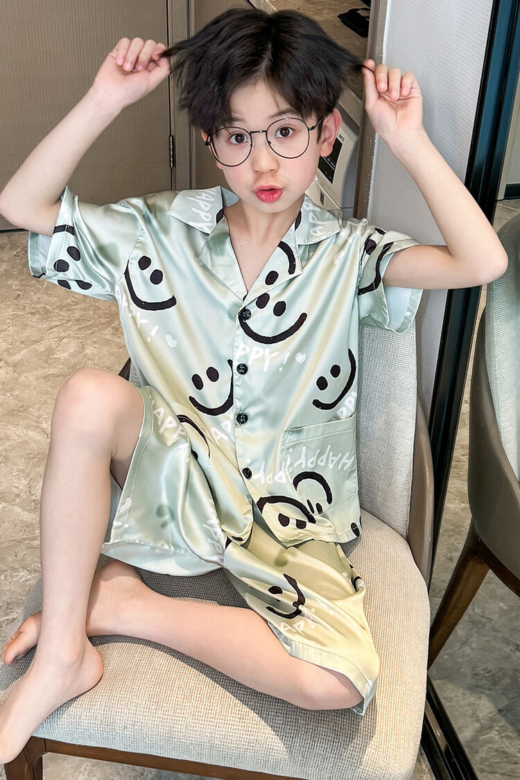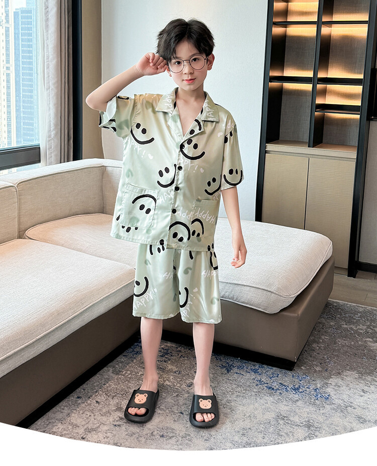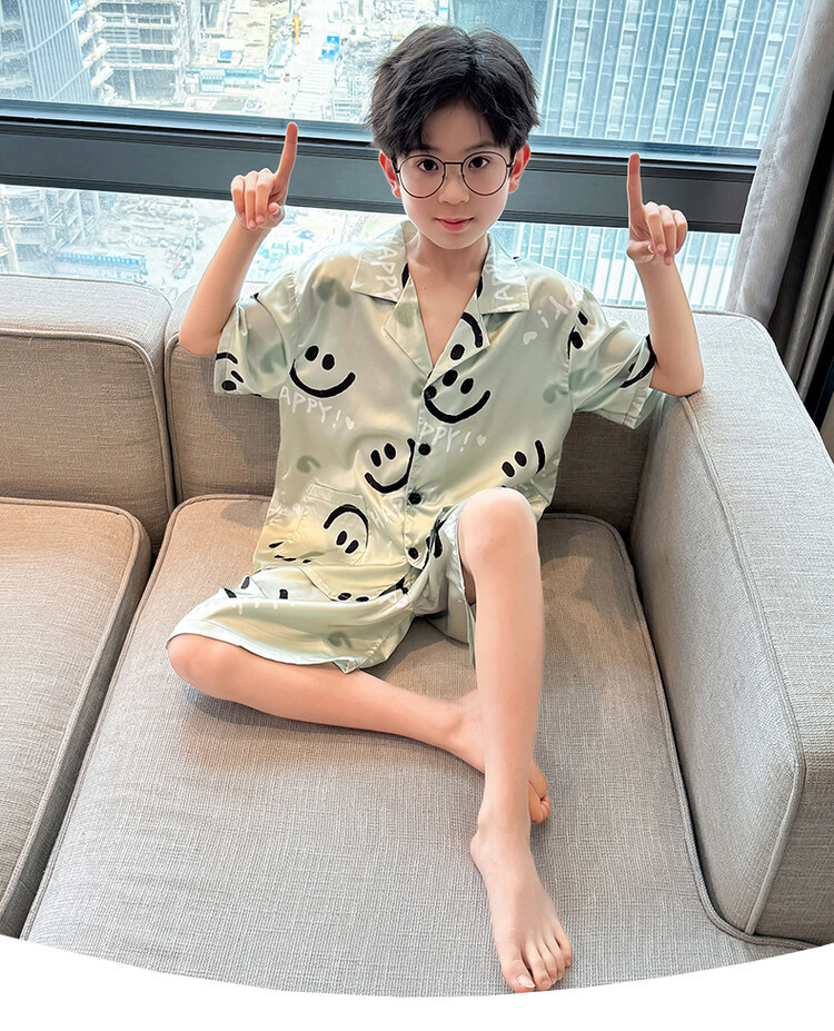 남학생 웃는 얼굴 홈 세트 여름 대형 어린이 얇은 에어컨 세트 반팔 반바지 아이스 실크 파자마 투피스 세트스토어 가기