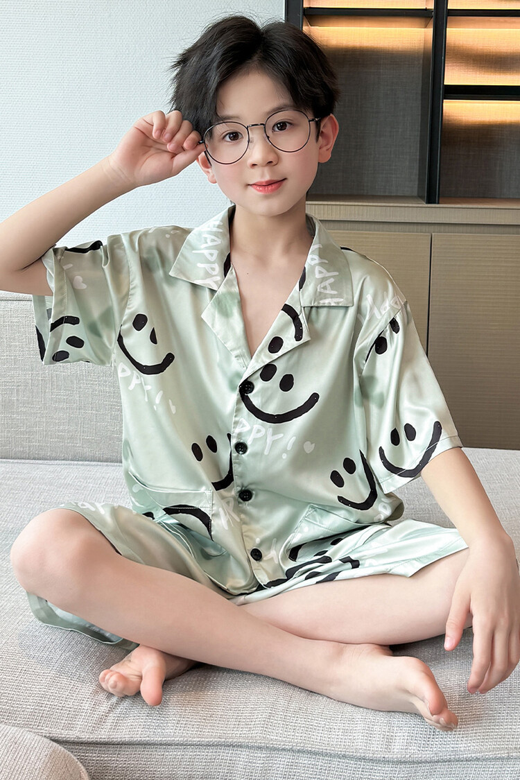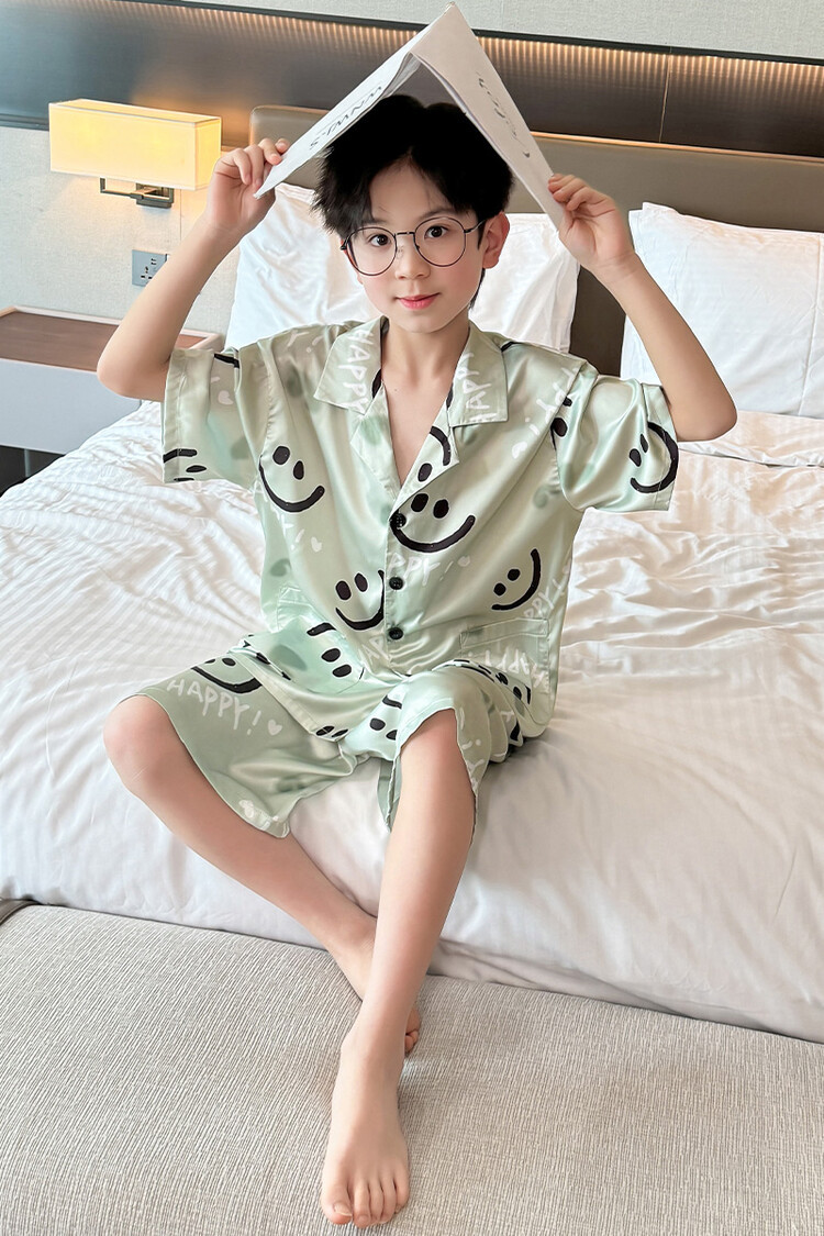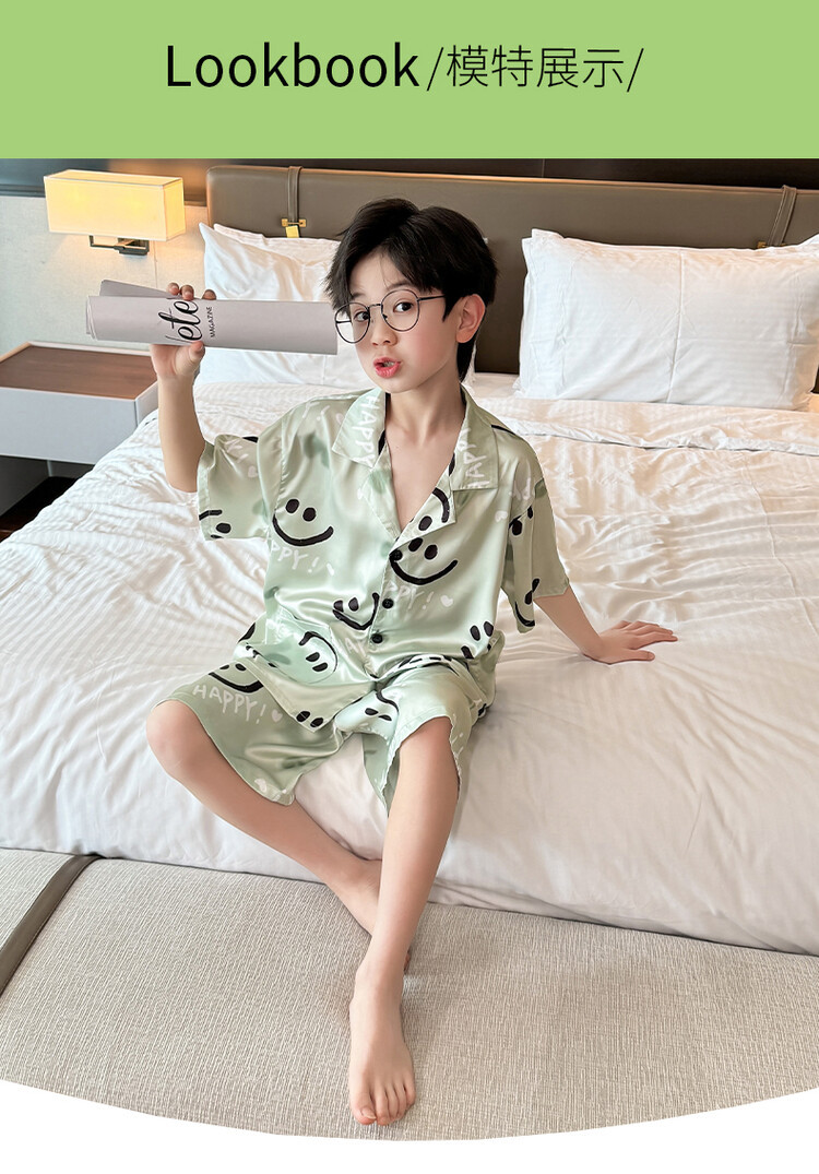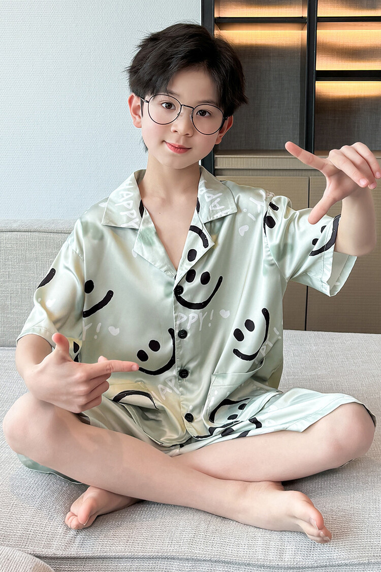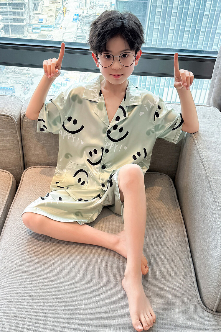 남학생 웃는 얼굴 홈 세트 여름 대형 어린이 얇은 에어컨 세트 반팔 반바지 아이스 실크 파자마 투피스 세트스토어 가기