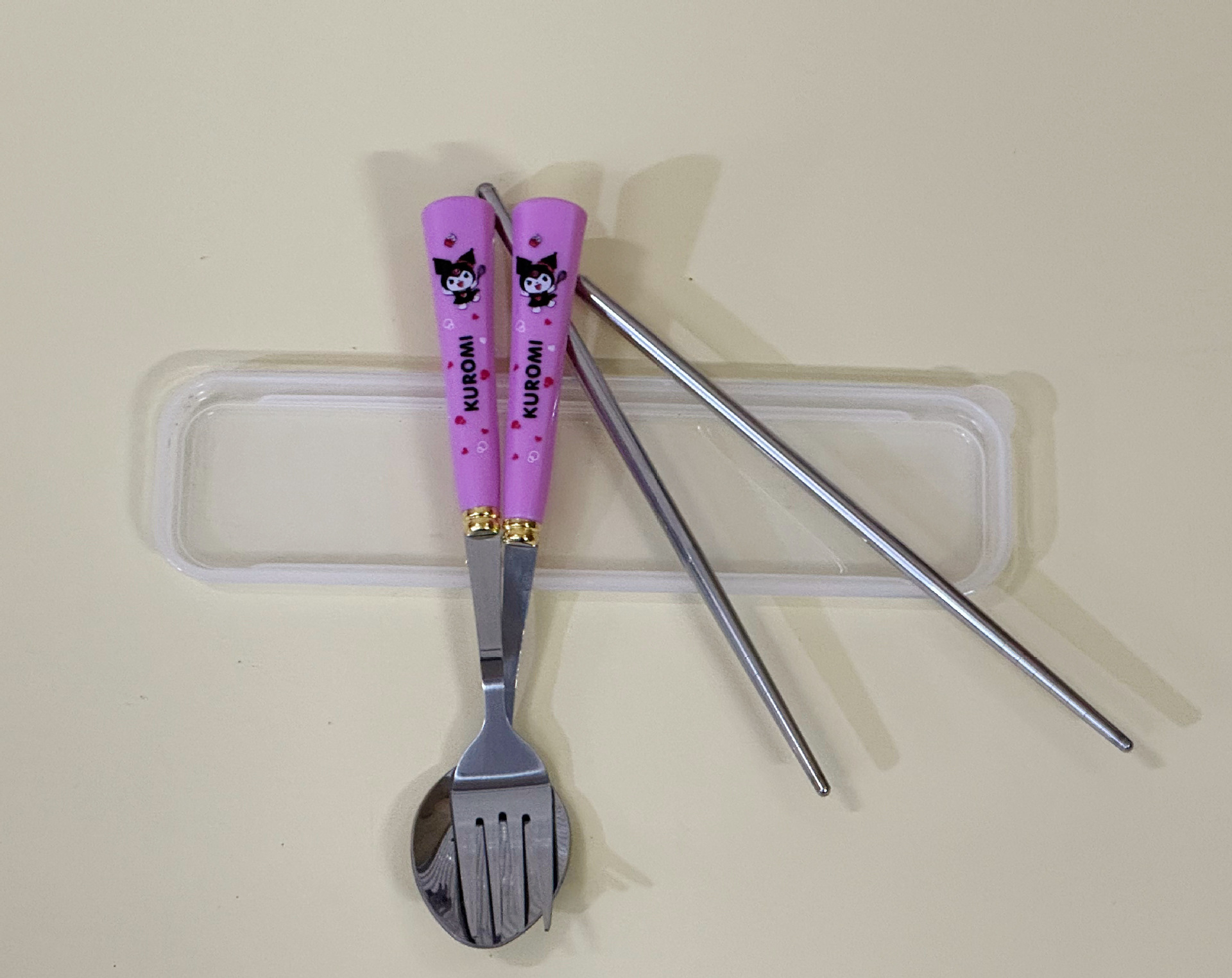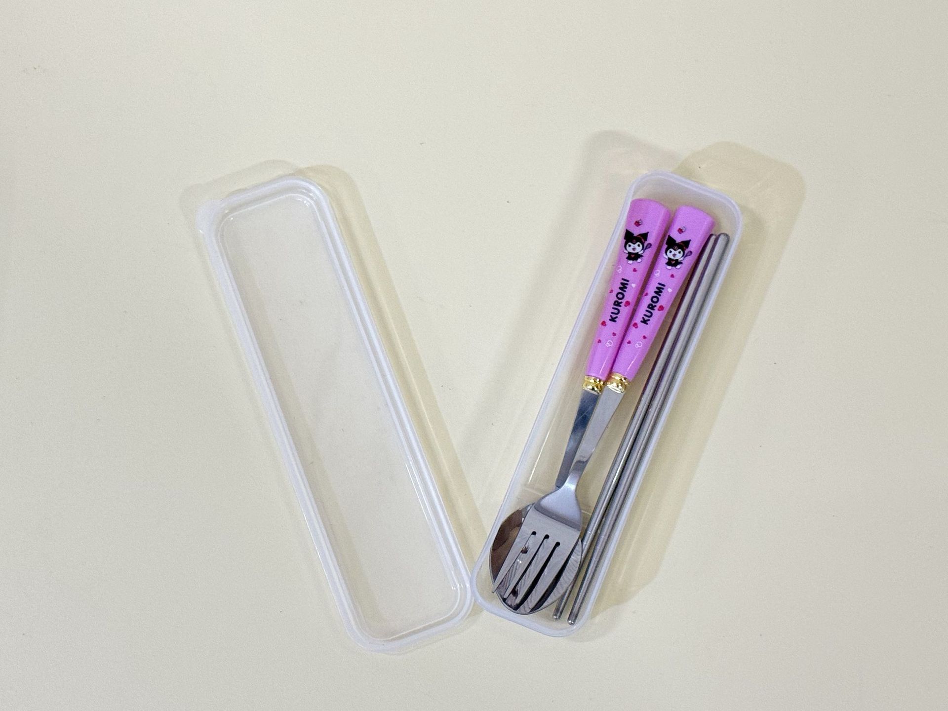 Youzhi 공장 직접 ZC-8869 Sanrio 스타일 플라스틱 손잡이 숟가락 젓가락 포크 조합은 뒤집을 수 있습니다스토어 가기