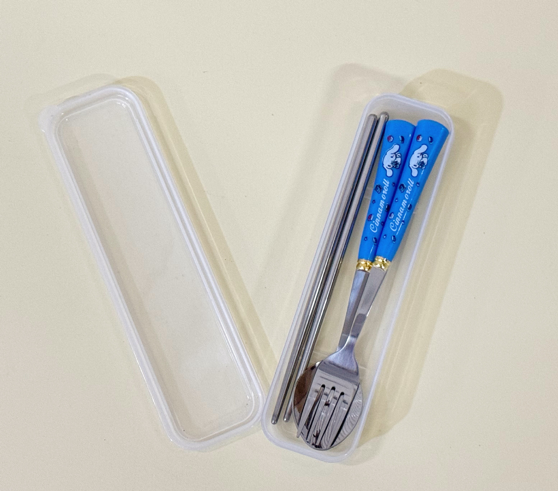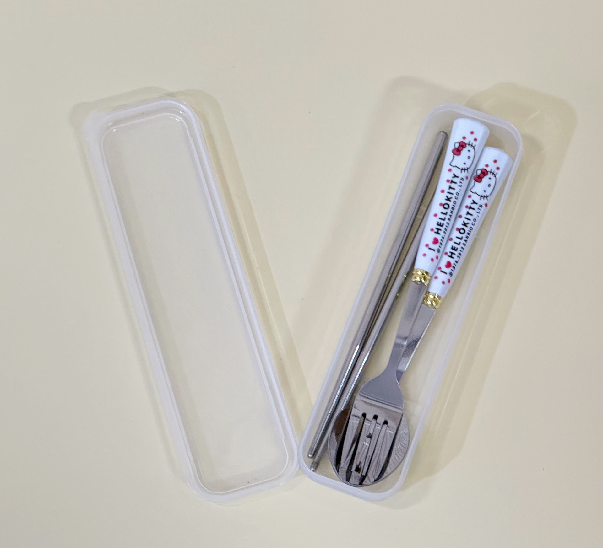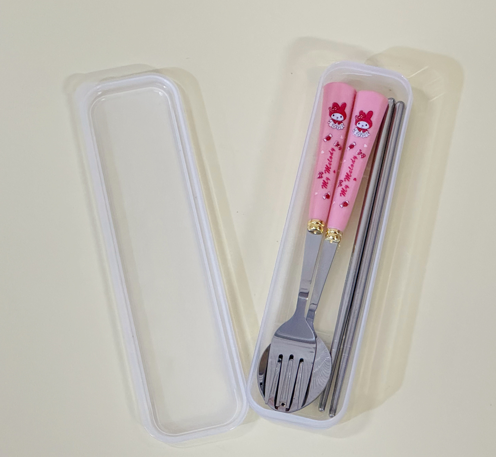 Youzhi 공장 직접 ZC-8869 Sanrio 스타일 플라스틱 손잡이 숟가락 젓가락 포크 조합은 뒤집을 수 있습니다