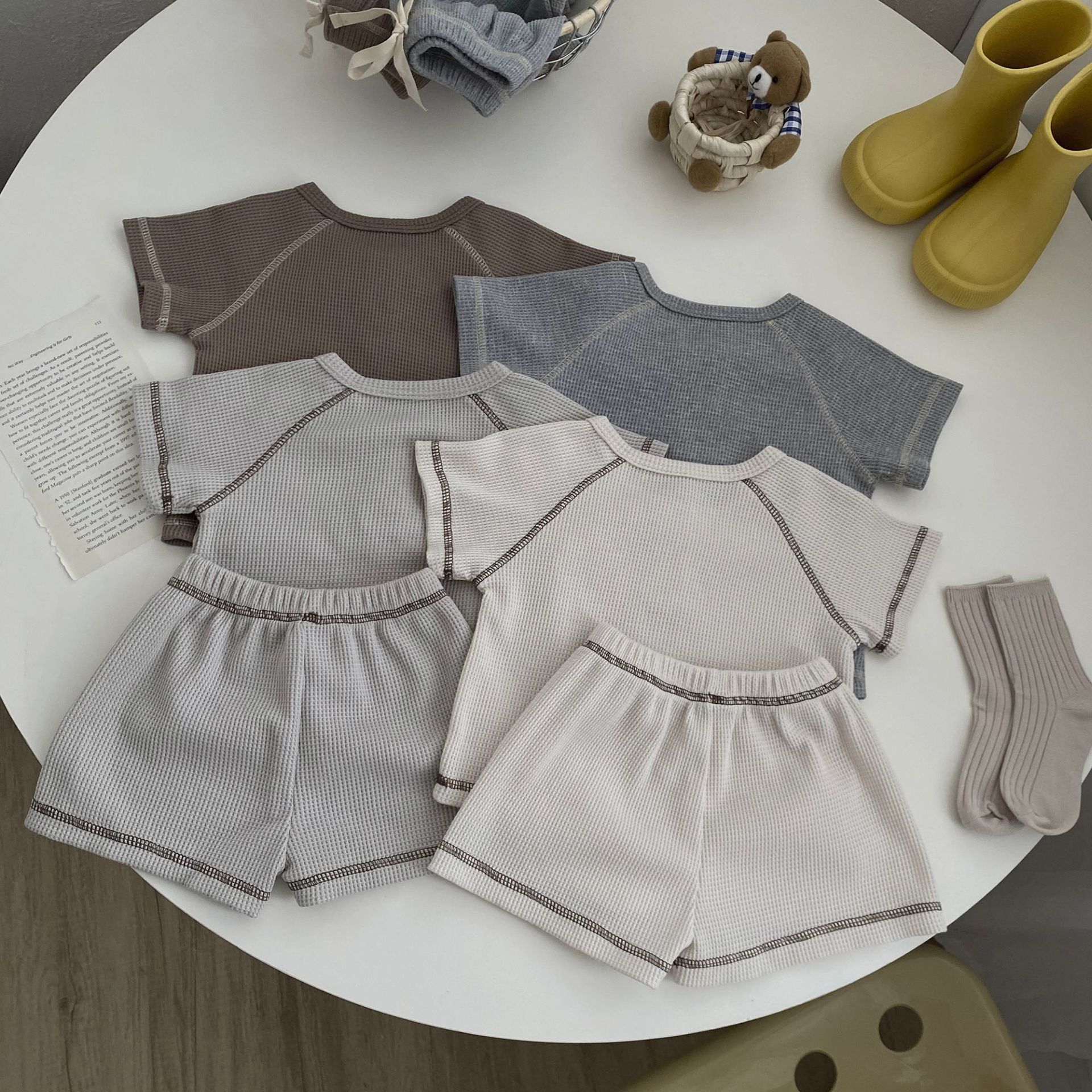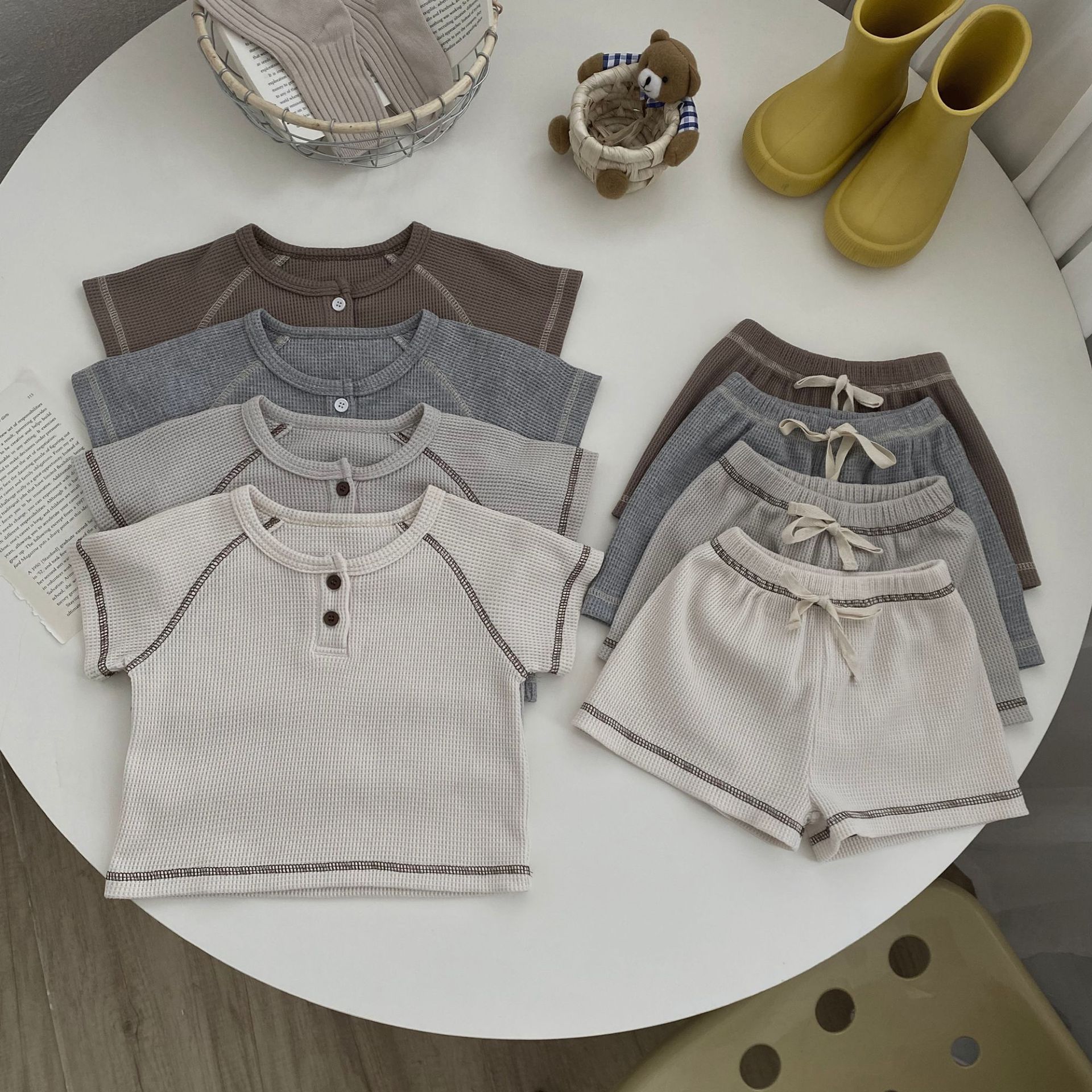 26여름 신상 한국판 아동복 세트 인스타 스타일 유아용 와플 반팔 투피스 세트 아동 여름 스포츠 세트