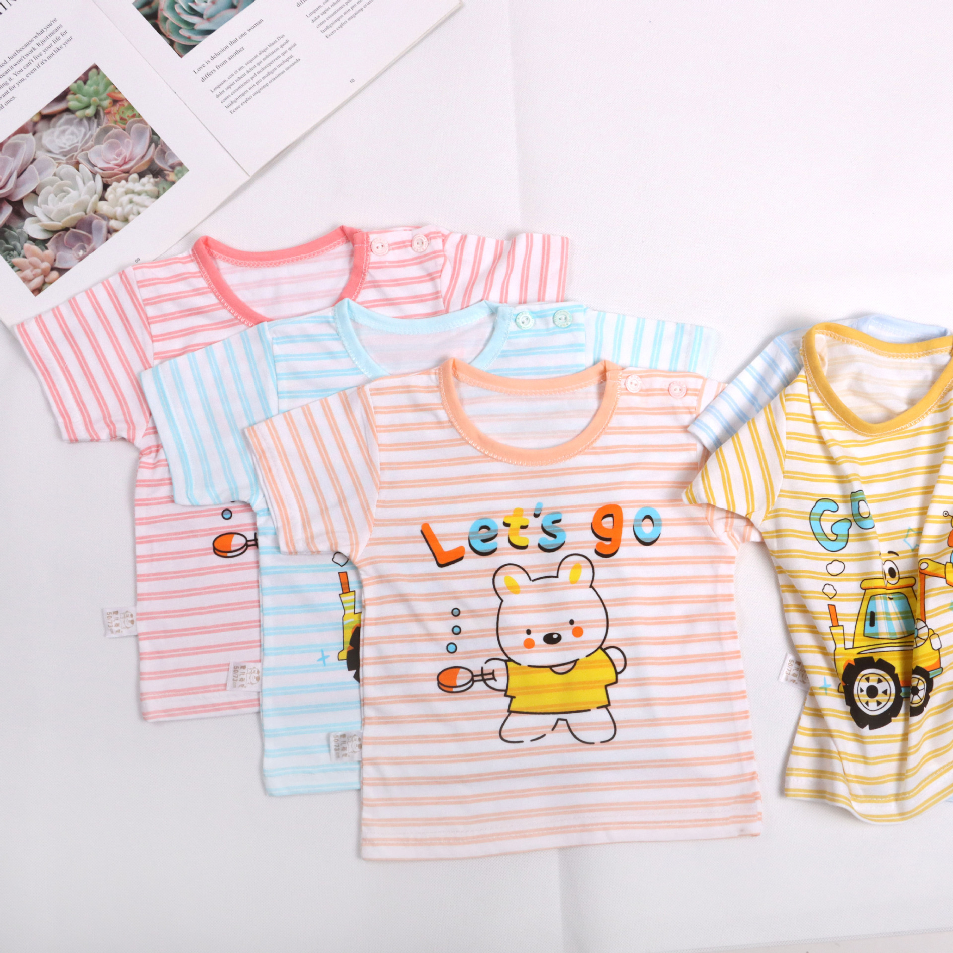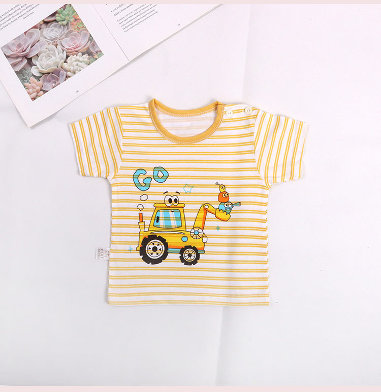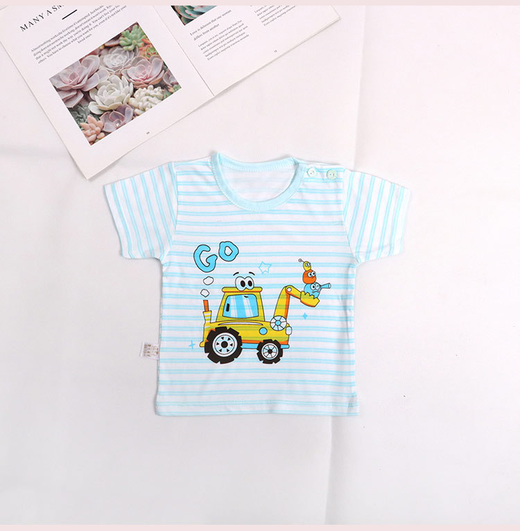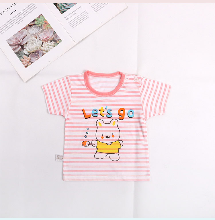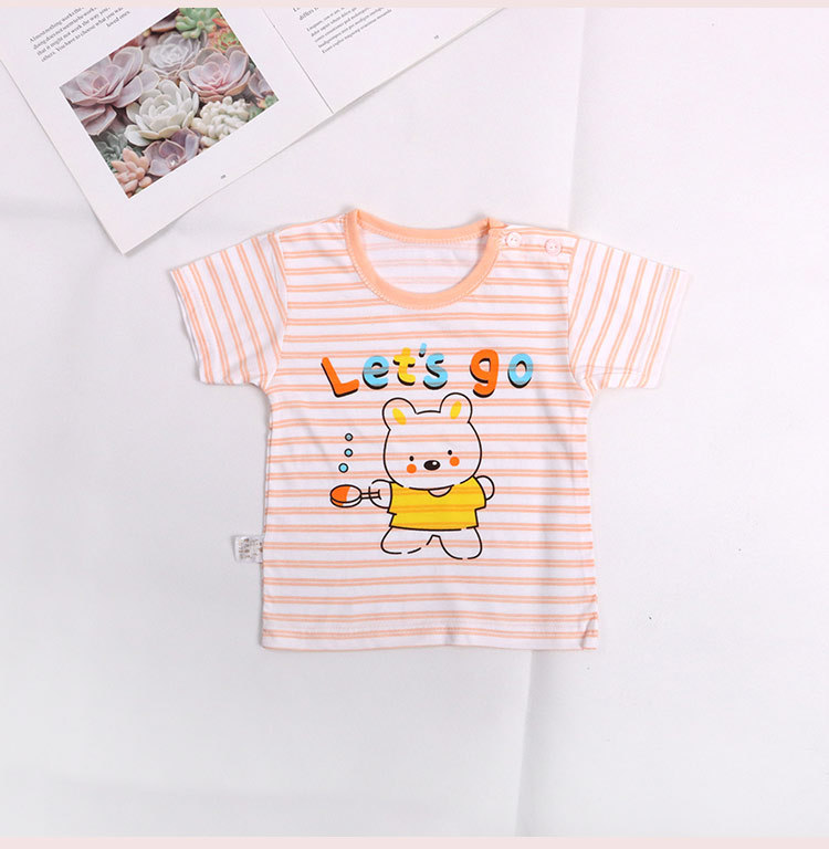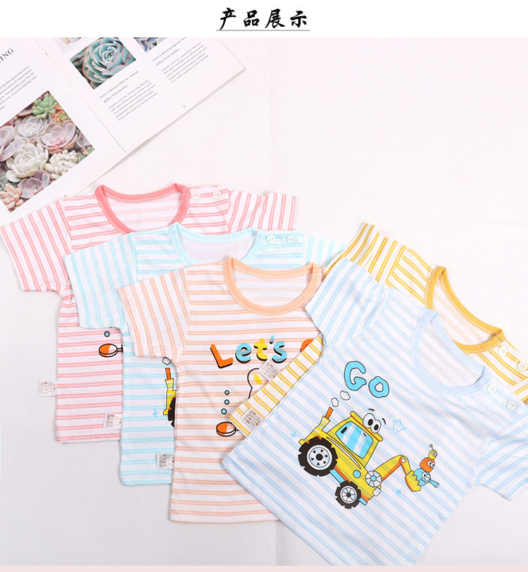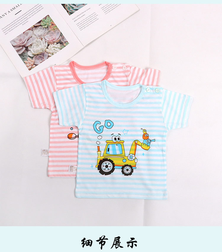 아기의 반소매 티셔츠 여름 얇은 아기 0-3 세 줄무늬 크루 넥 탑 어깨 버클 남녀 반소매 옷스토어 가기