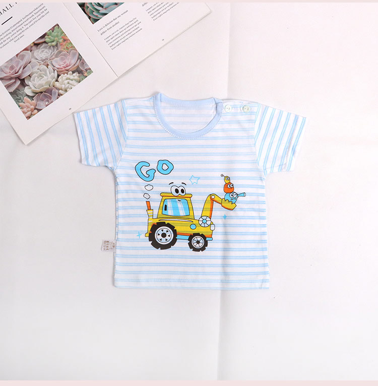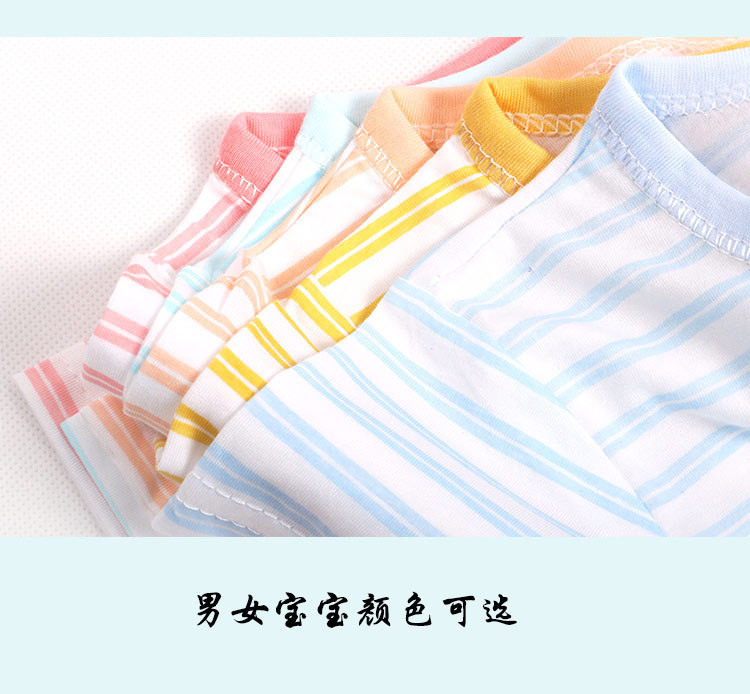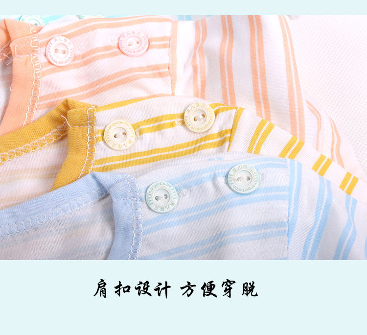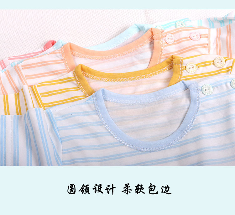 아기의 반소매 티셔츠 여름 얇은 아기 0-3 세 줄무늬 크루 넥 탑 어깨 버클 남녀 반소매 옷