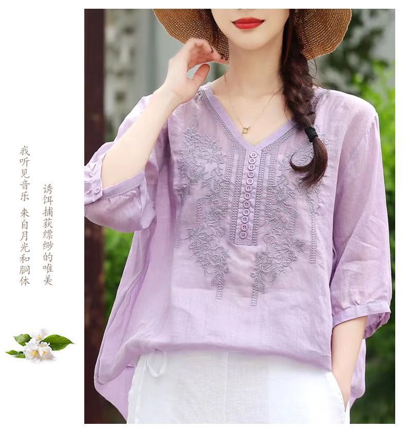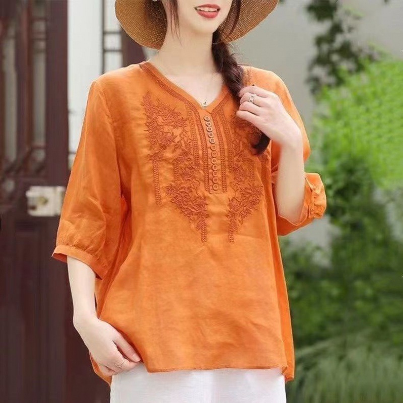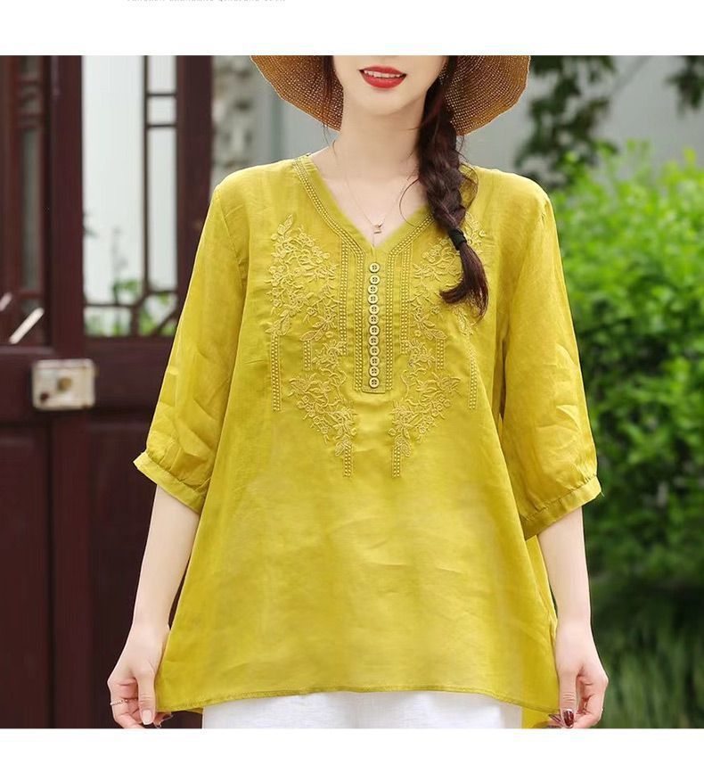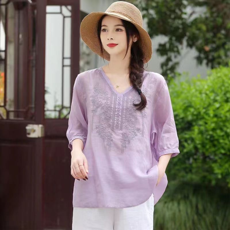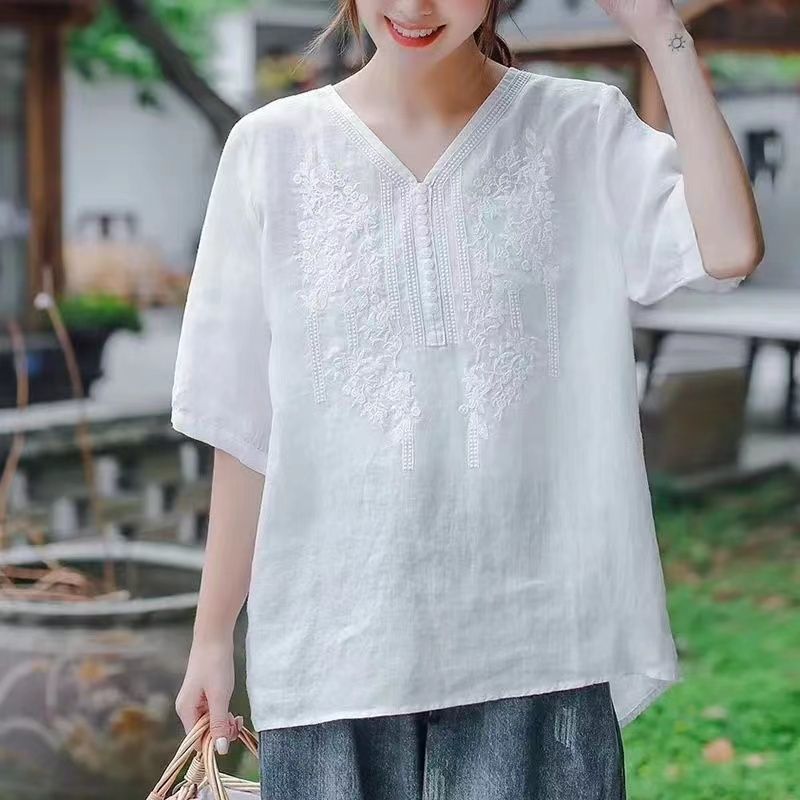 예술적 레트로 여름 새로운 반소매 코튼 및 리넨 티셔츠 느슨한 슬리밍 V 넥 자수 코튼 셔츠 여성용 트렌디 탑