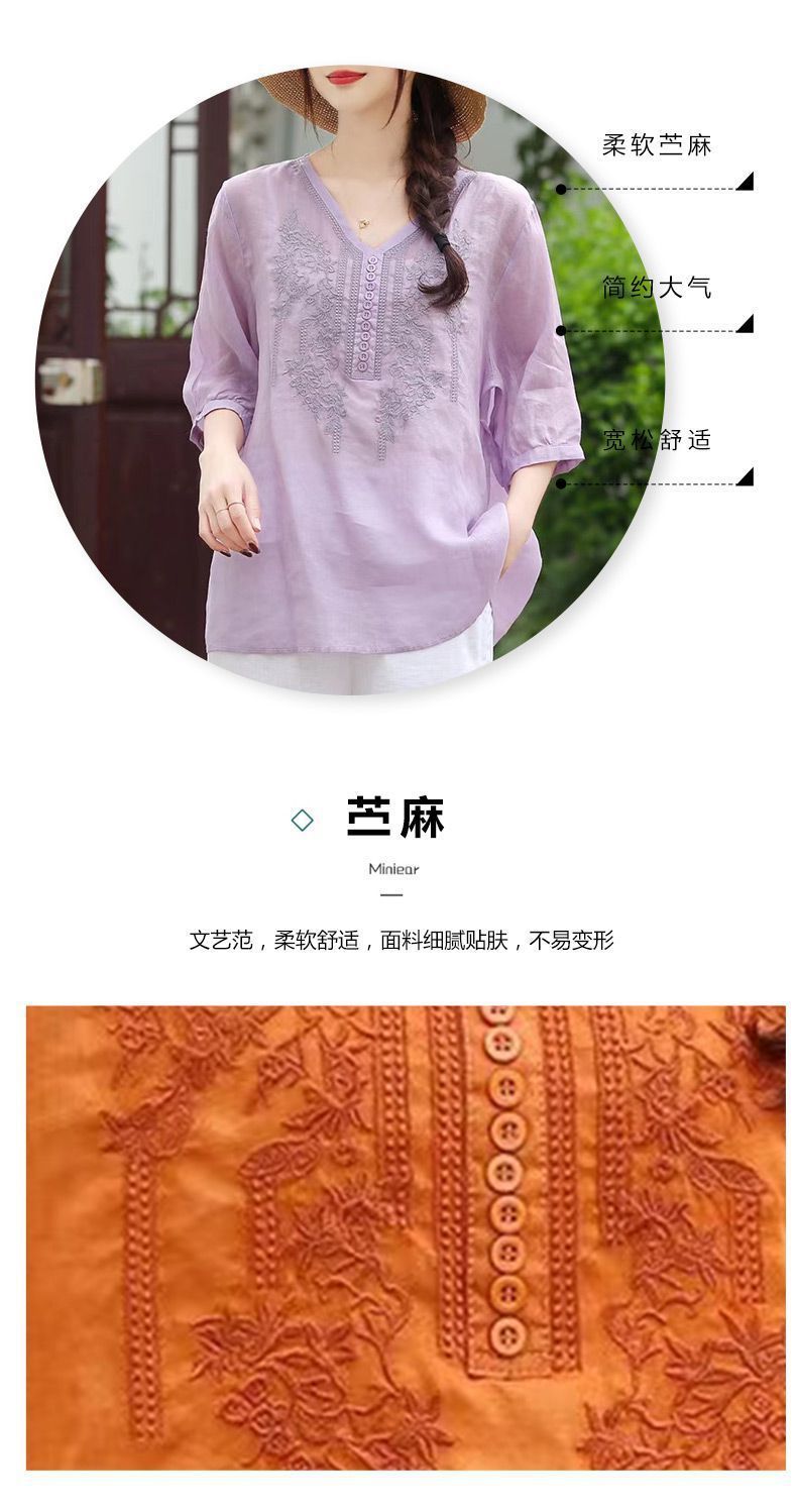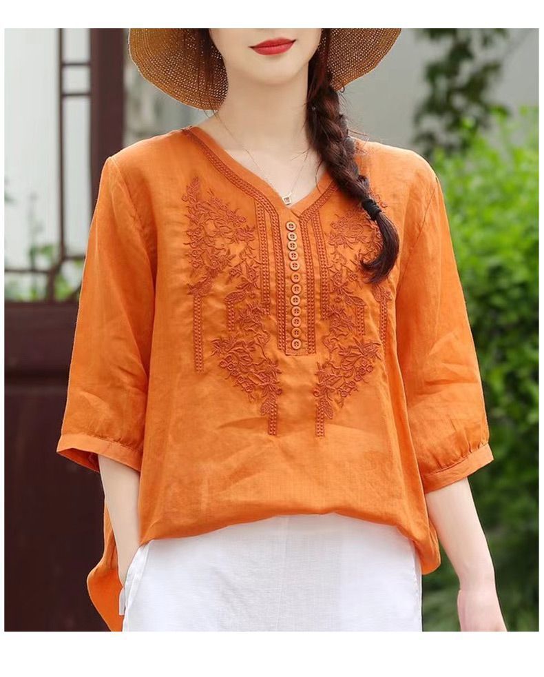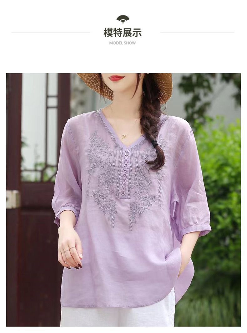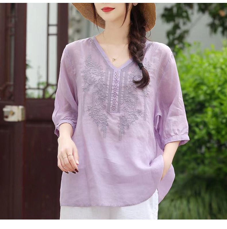 예술적 레트로 여름 새로운 반소매 코튼 및 리넨 티셔츠 느슨한 슬리밍 V 넥 자수 코튼 셔츠 여성용 트렌디 탑