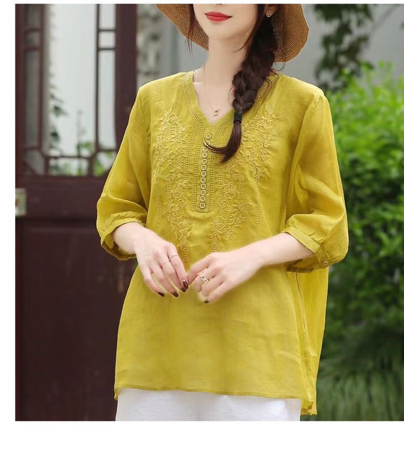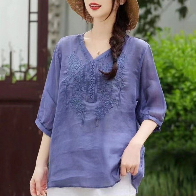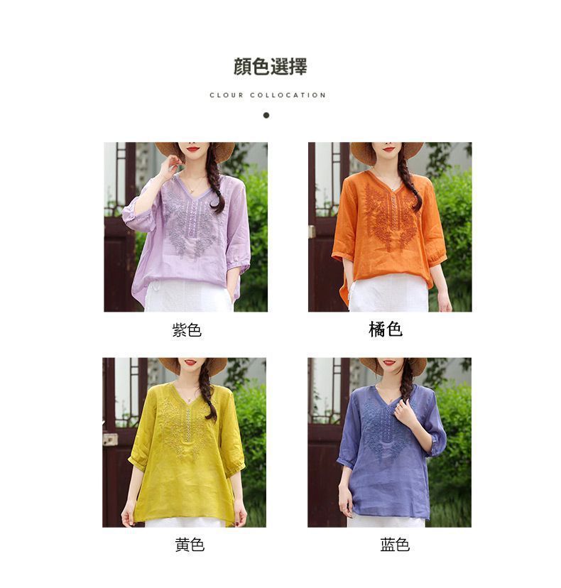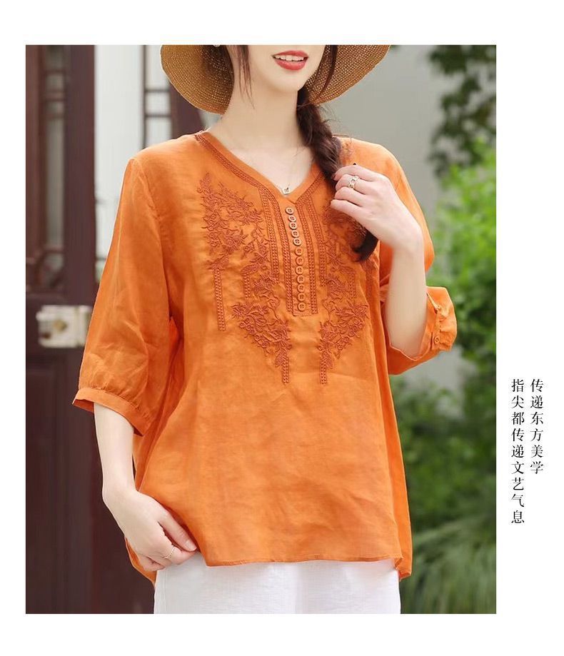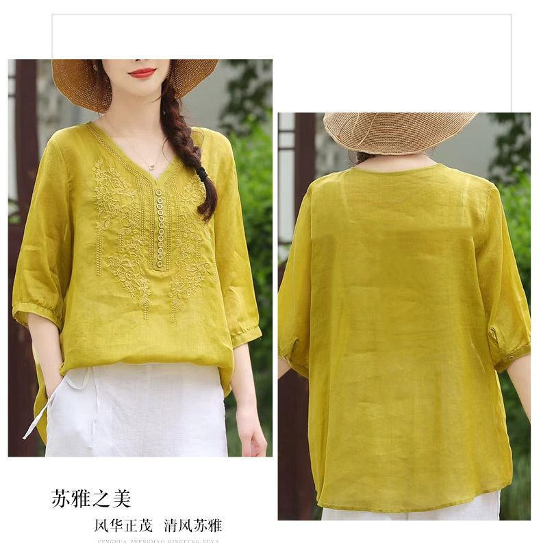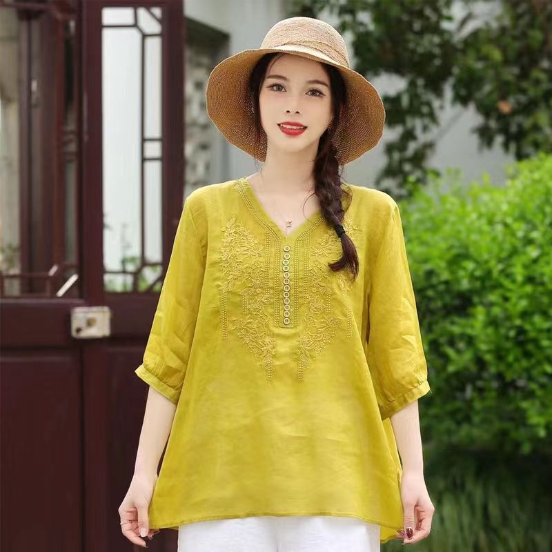 예술적 레트로 여름 새로운 반소매 코튼 및 리넨 티셔츠 느슨한 슬리밍 V 넥 자수 코튼 셔츠 여성용 트렌디 탑스토어 가기