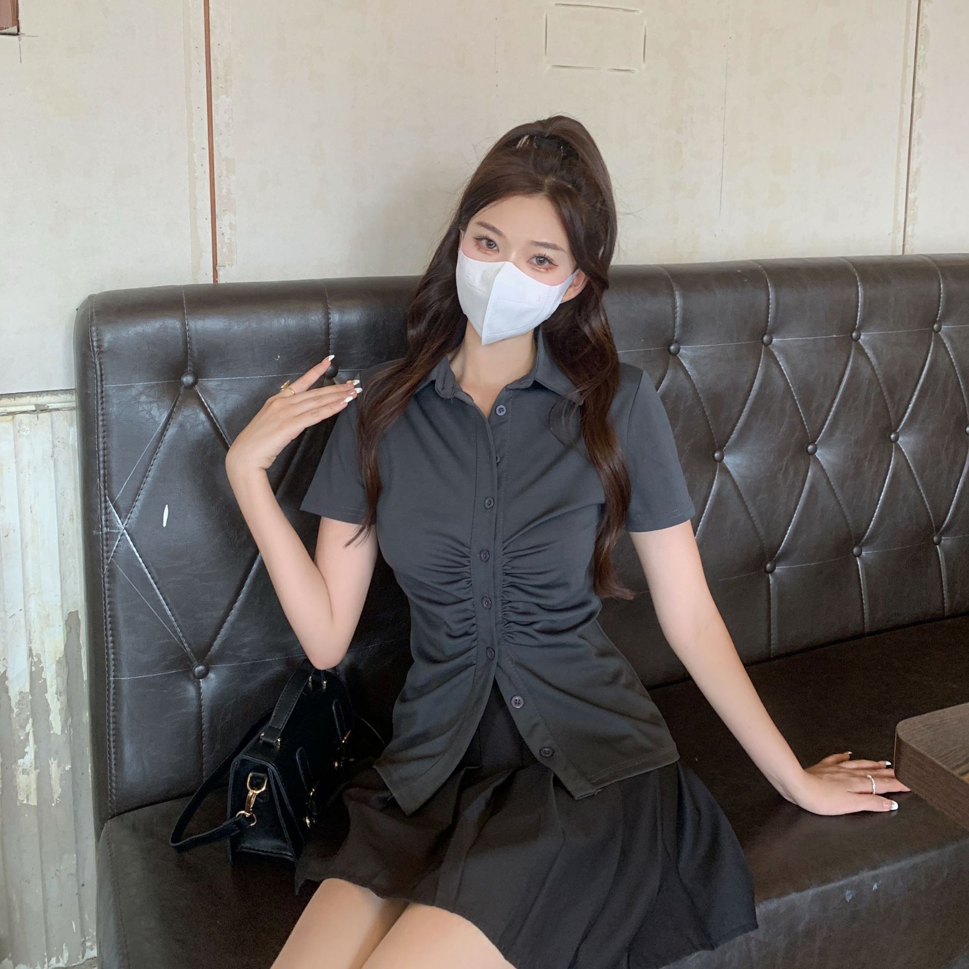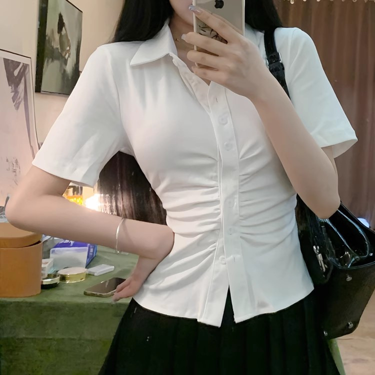 국경 간 공장 유럽과 미국 태국 주름 허리 셔츠 여성 여름 짧은 소매 셔츠 단색 탑 흔들기 Taobao스토어 가기