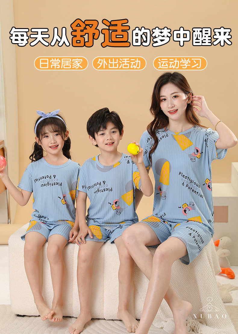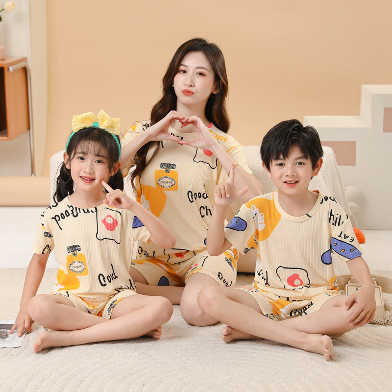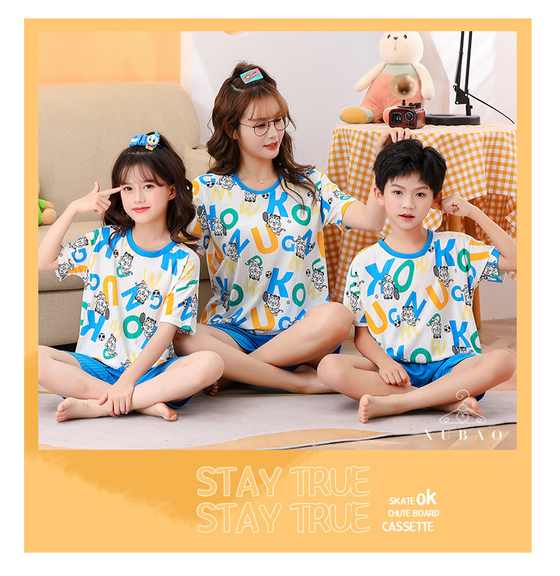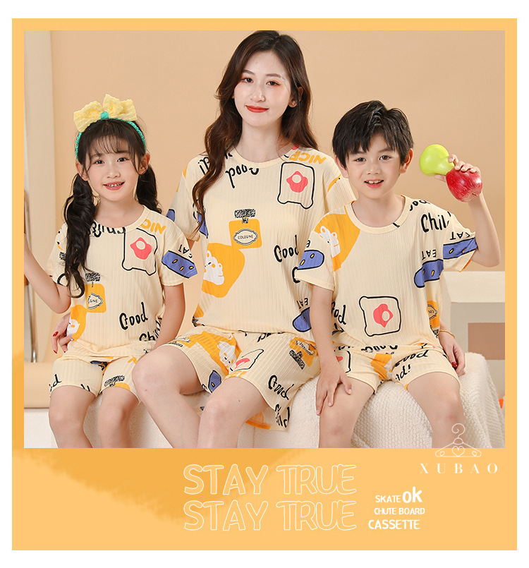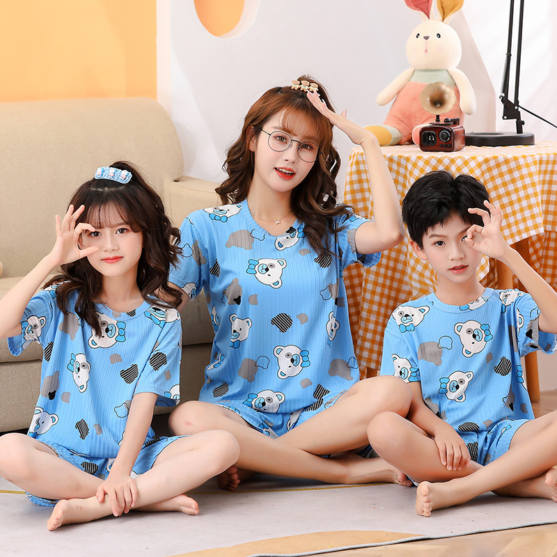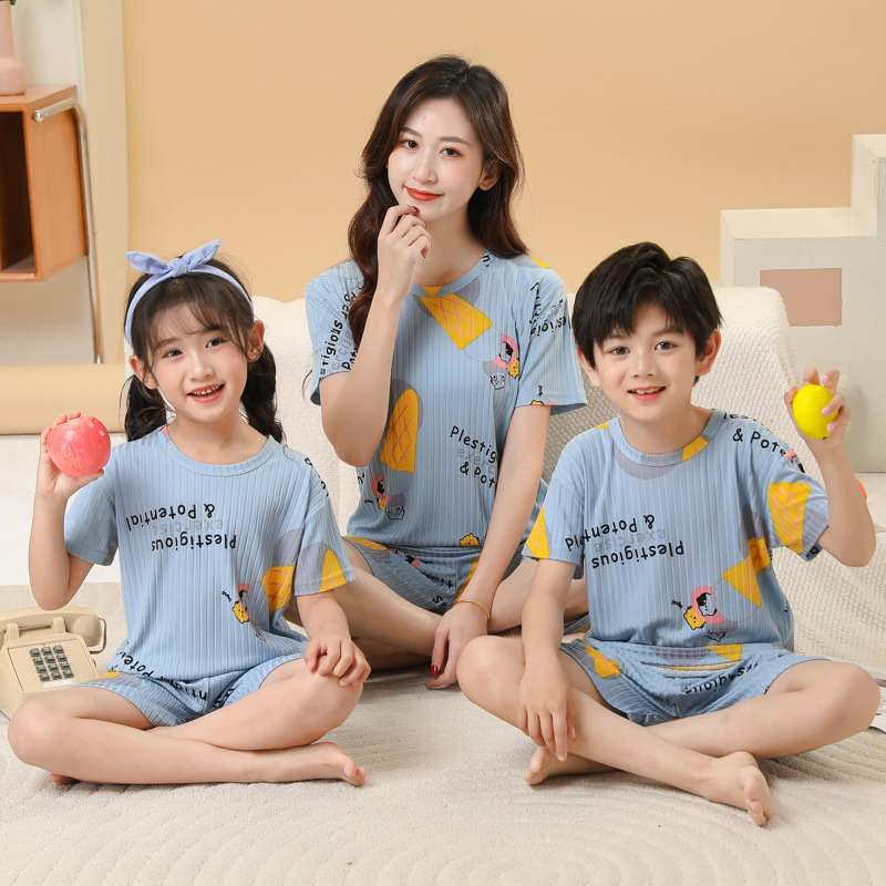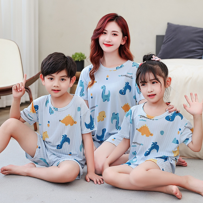 25 여름 부모-자녀 루즈핏 캐주얼 에어컨 홈웨어 중대형 남녀 아동용 만화 반팔 반바지 잠옷 투피스 세트스토어 가기