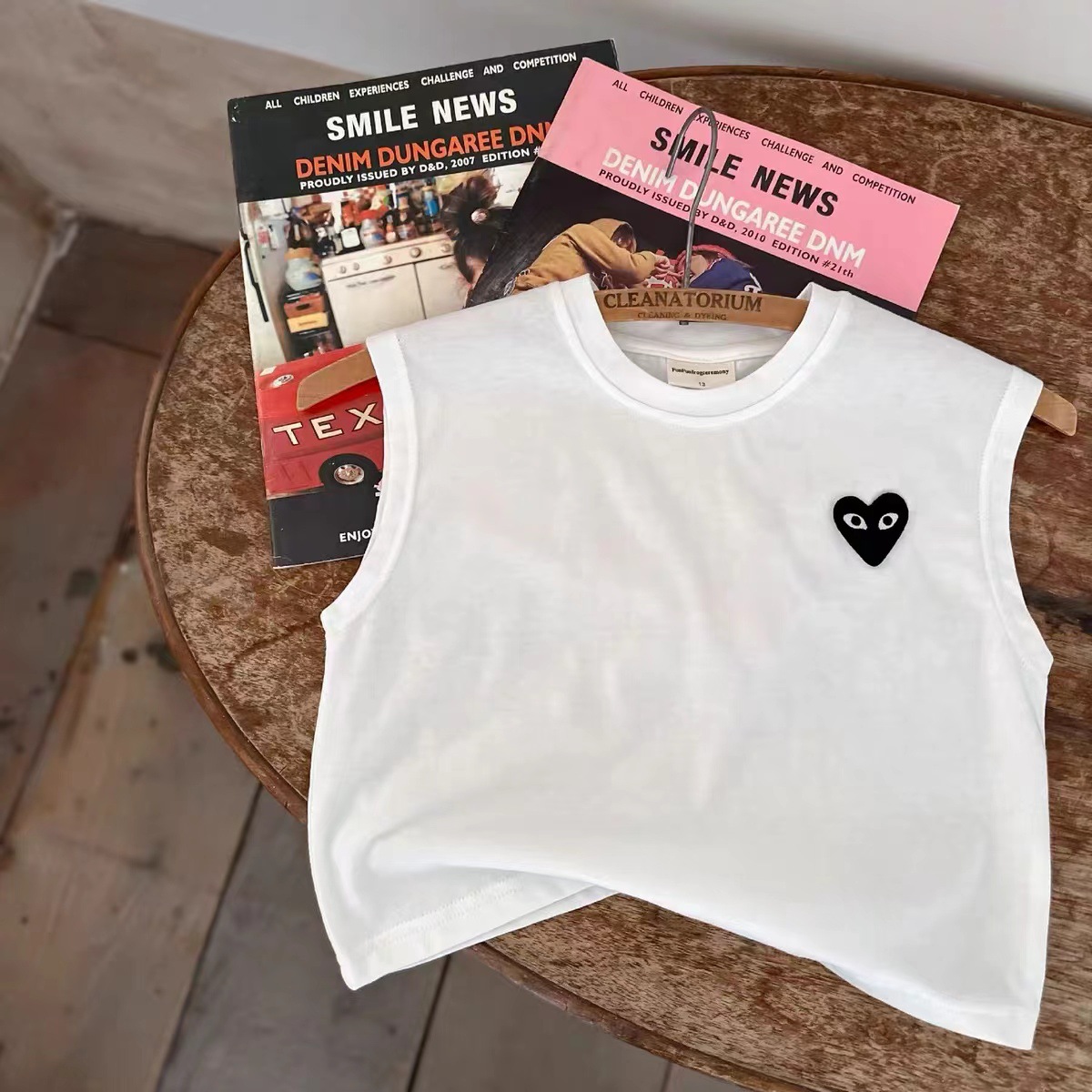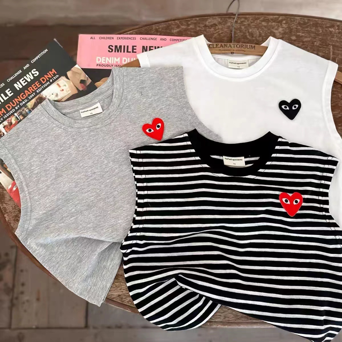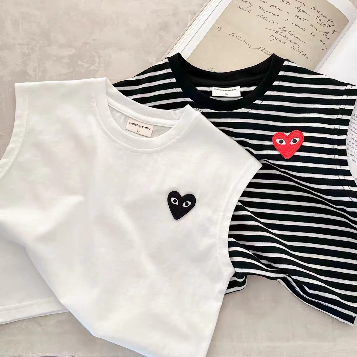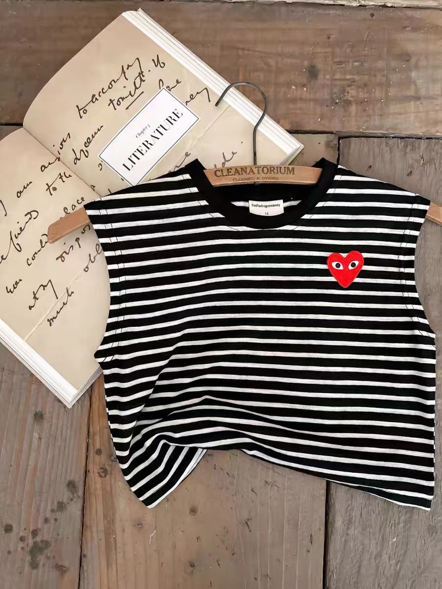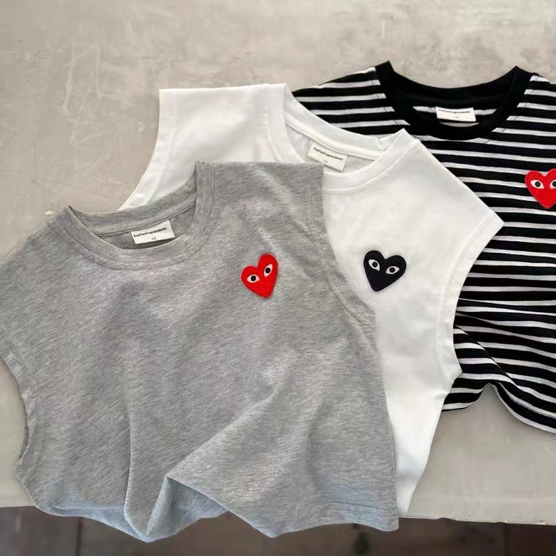어린이 조끼 2025 여름 신상 남녀 공용 하트 라벨 민소매 조끼 아기 단색 스트라이프 티셔츠스토어 가기