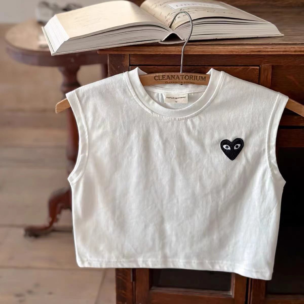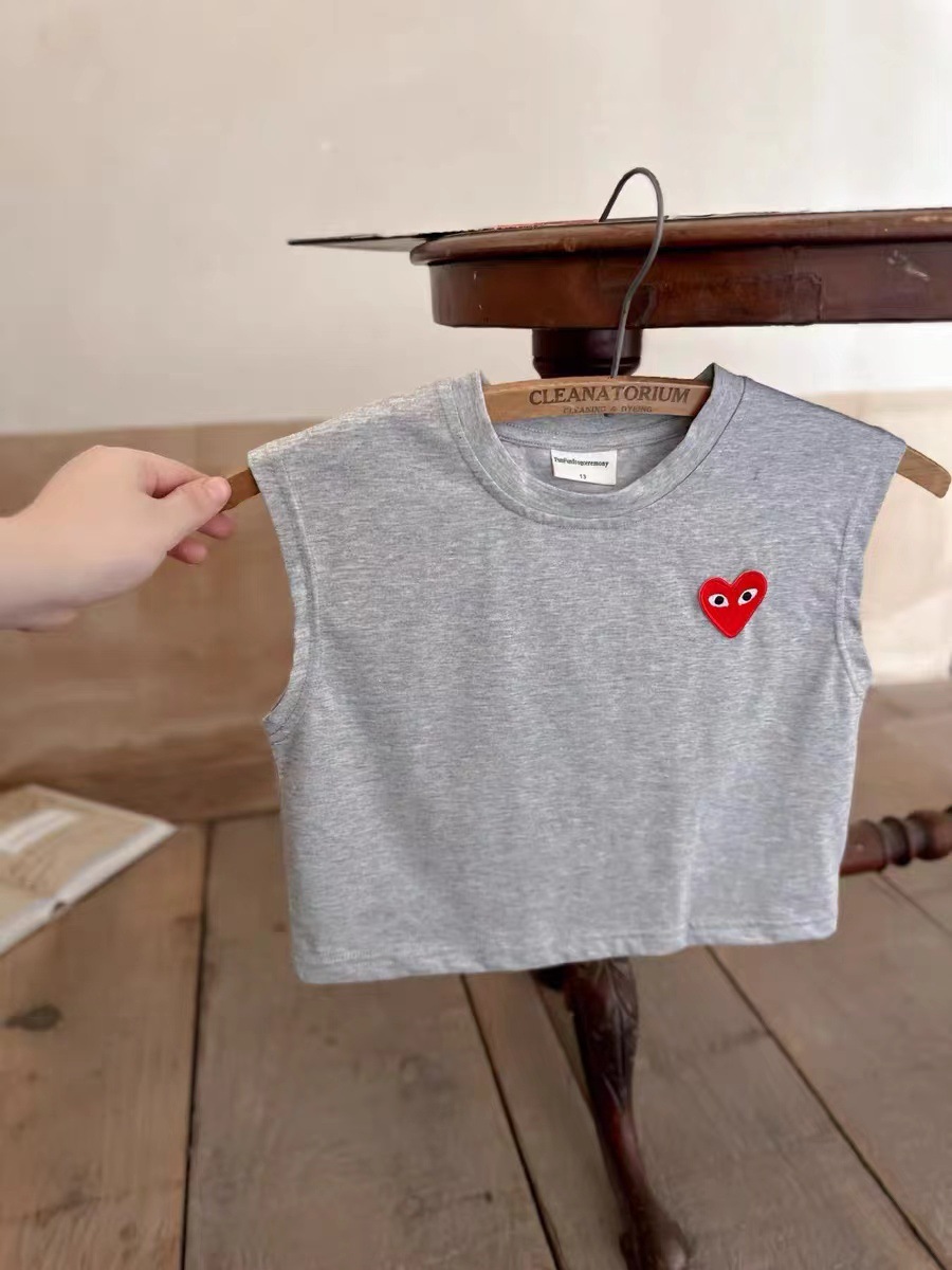 어린이 조끼 2025 여름 신상 남녀 공용 하트 라벨 민소매 조끼 아기 단색 스트라이프 티셔츠