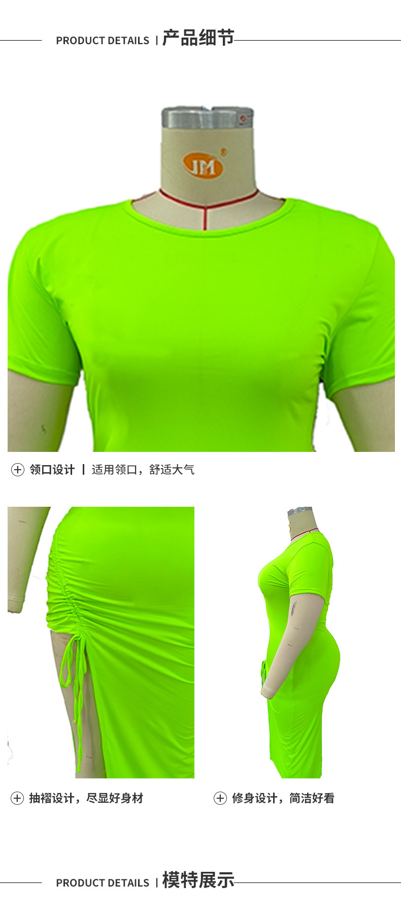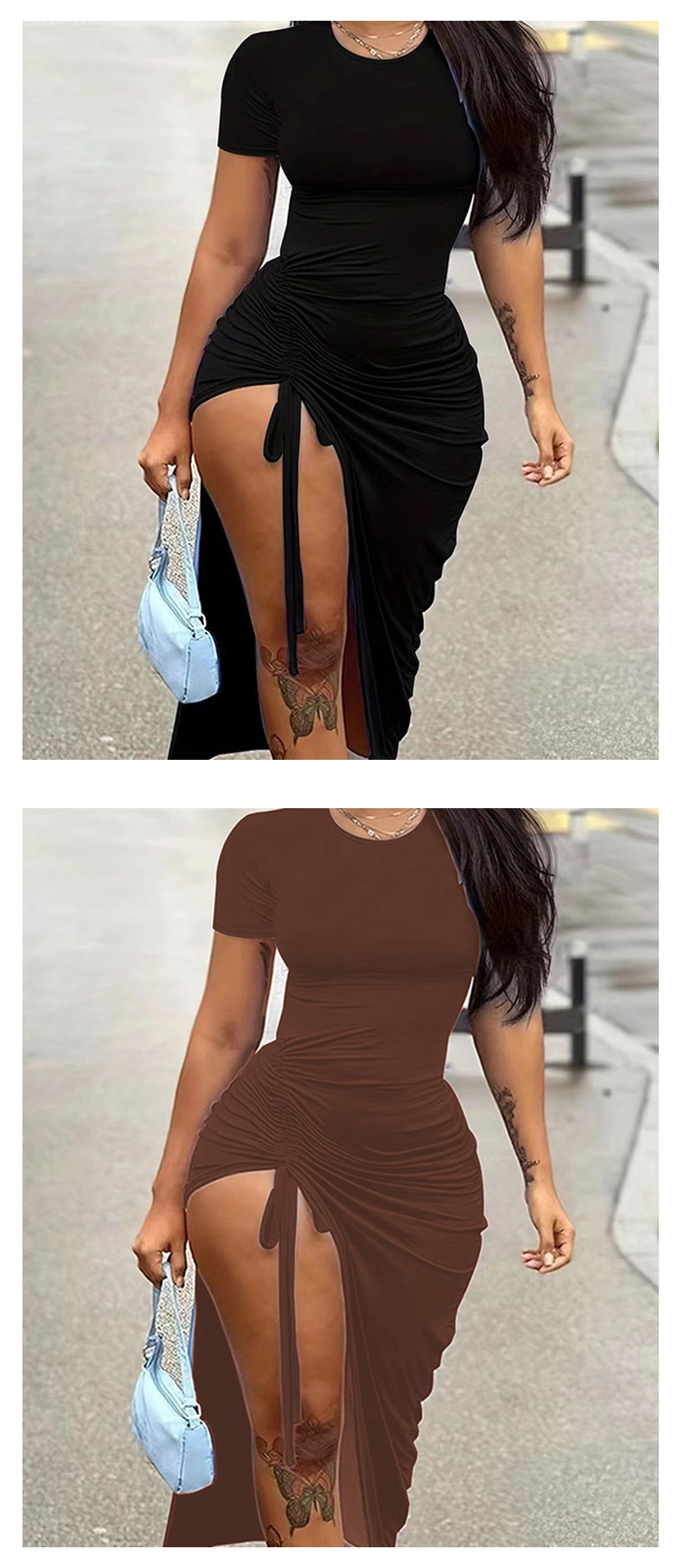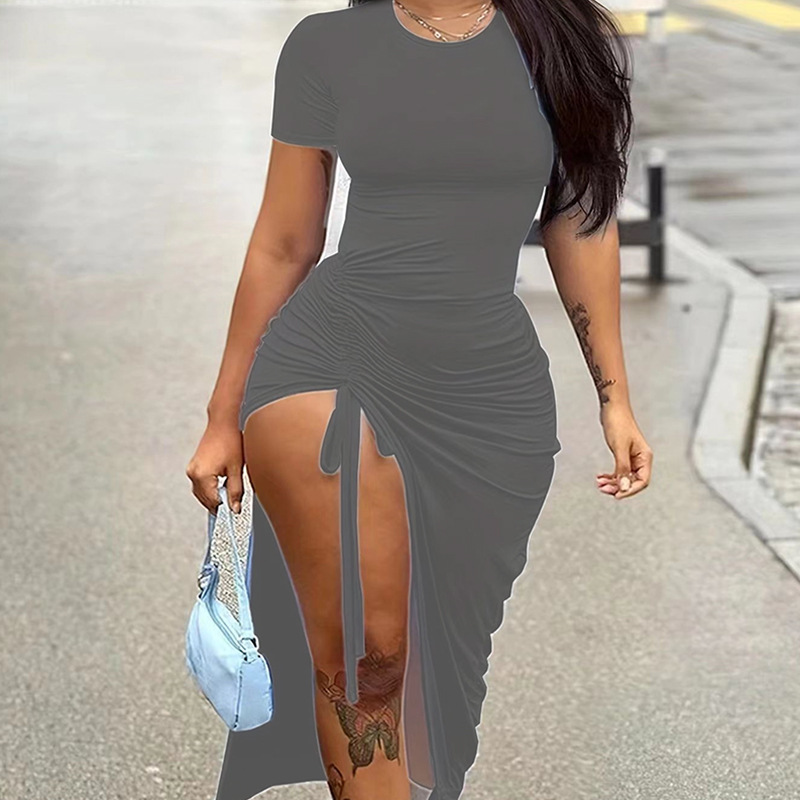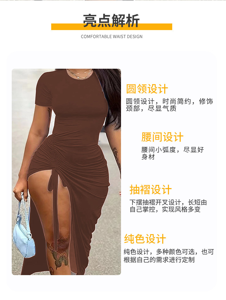 AliExpress 유럽과 미국 2024 여성 섹시 슬림 핏 라운드 넥 솔리드 컬러 플리트 비정규 짧은 소매 원피스
