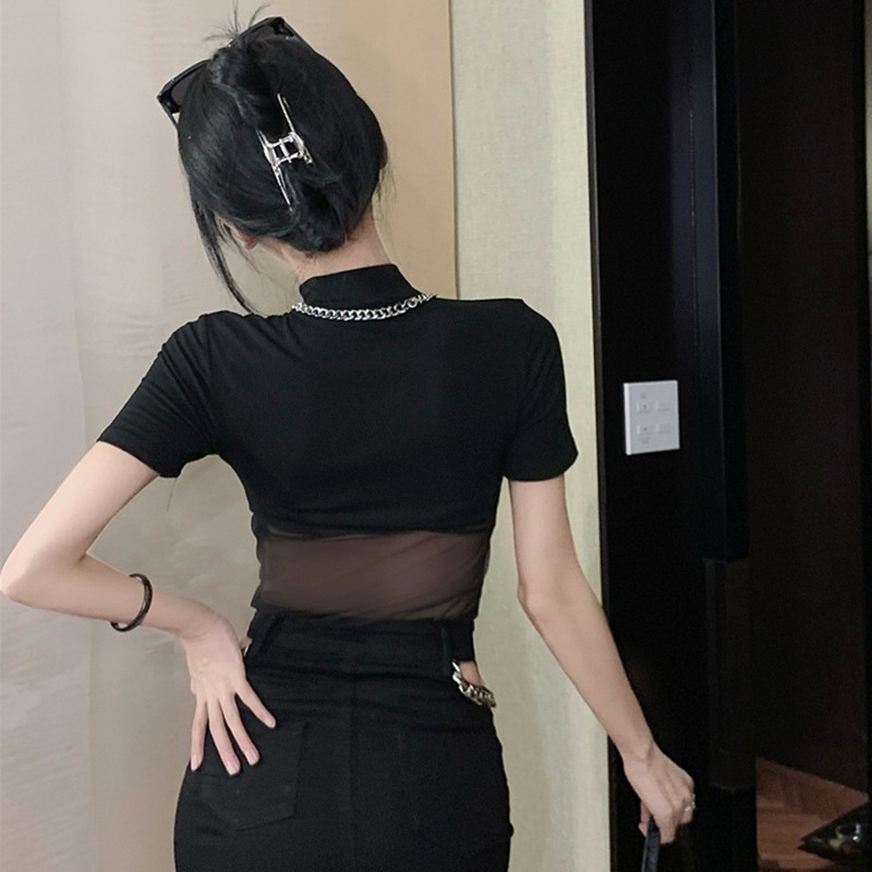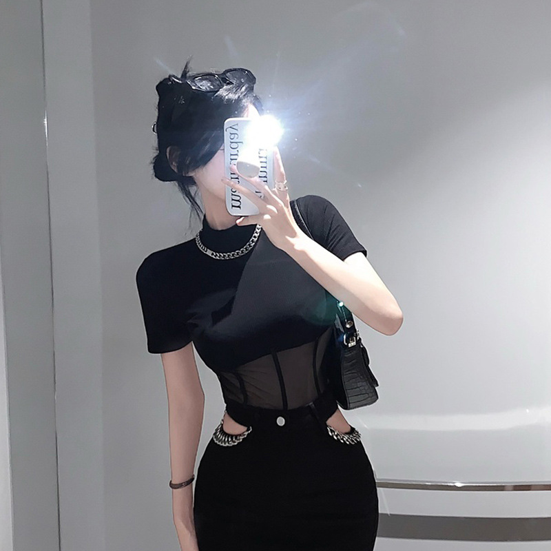 국경 간 공장 유럽과 미국 메쉬 반팔 티셔츠 하프 하이 칼라 블랙 재킷 하이 허리 속이 빈 여성 여름 떨림 타오바오스토어 가기