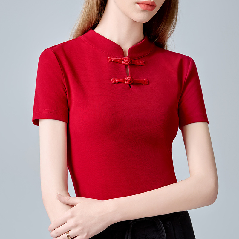 새로운 중국 스타일 수직 칼라 반팔 티셔츠 여성 2024 년 여름 새로운 여성 레트로 버클 내셔널 스타일 티셔츠 칙 탑
