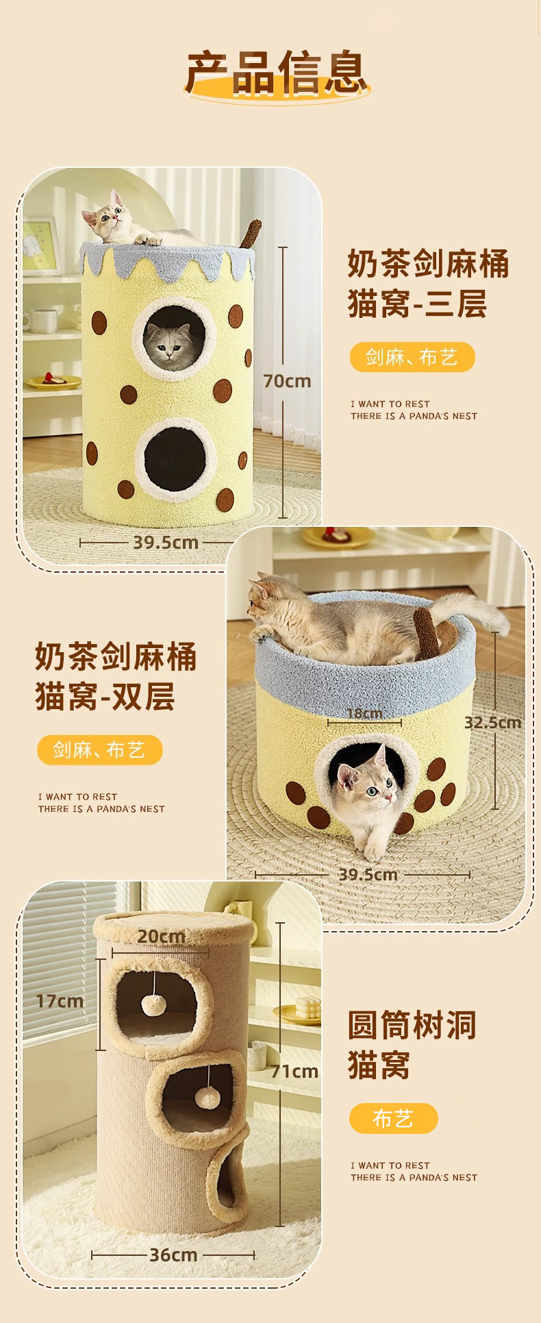 【品名】:HOOPET(方形双色猫抓桶/圆形剑麻猫抓桶)/邮筒小熊双层猫窝 S/小熊之家高筒窝爬 S/ 奶茶剑麻桶-(单层/双层)/宠物三层树洞圆筒爬架(米色)