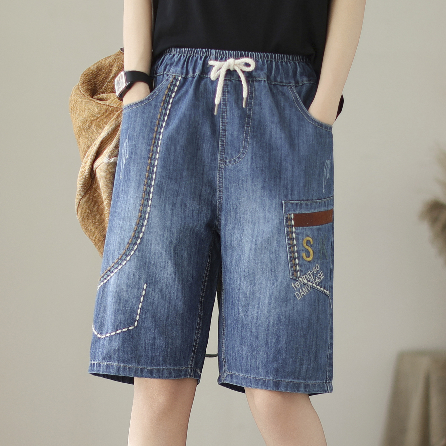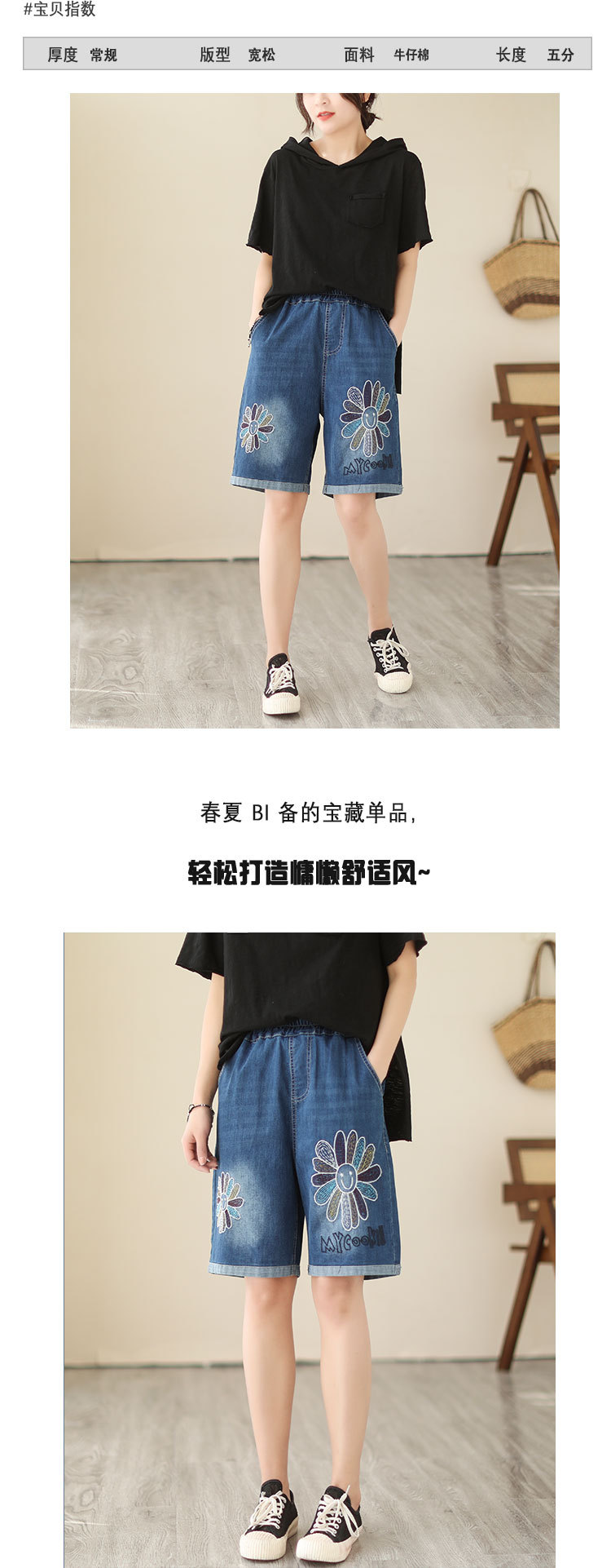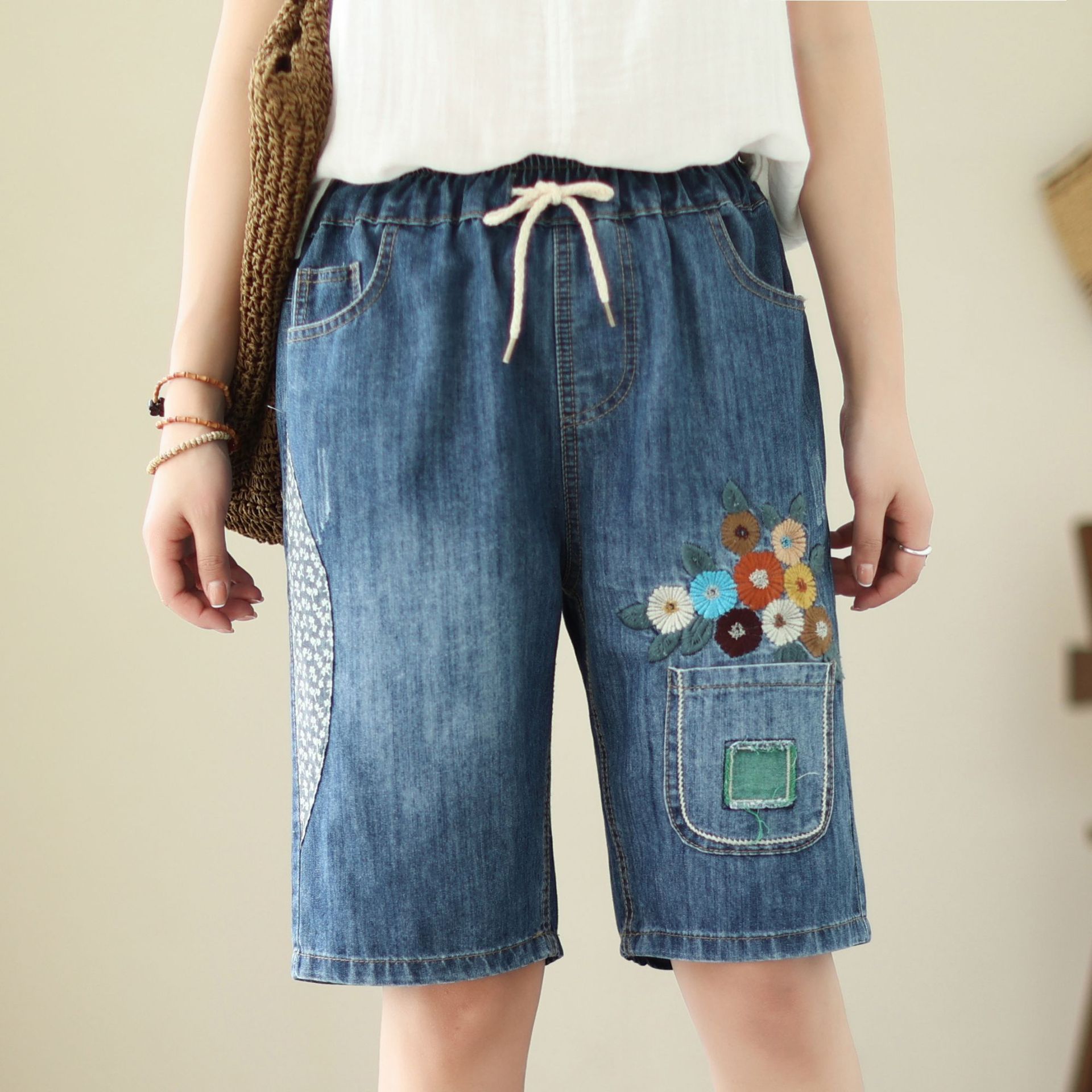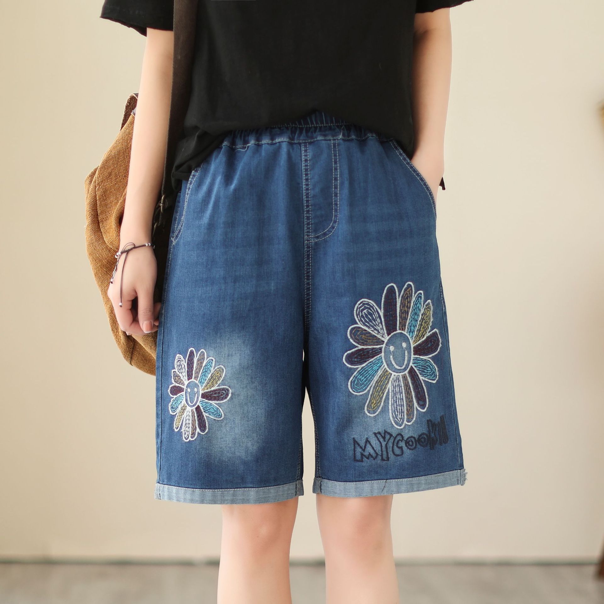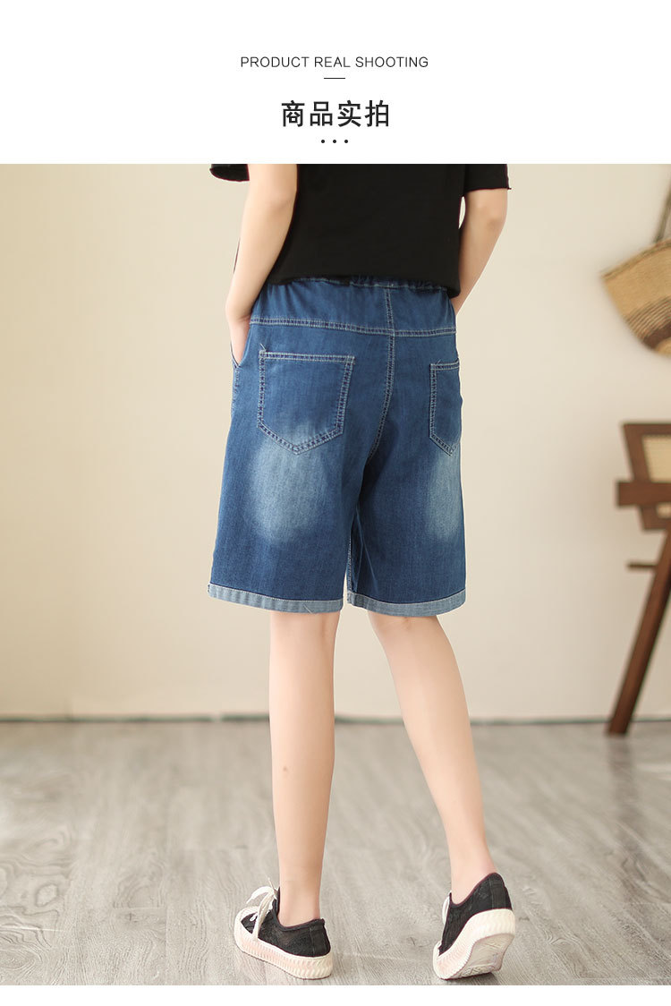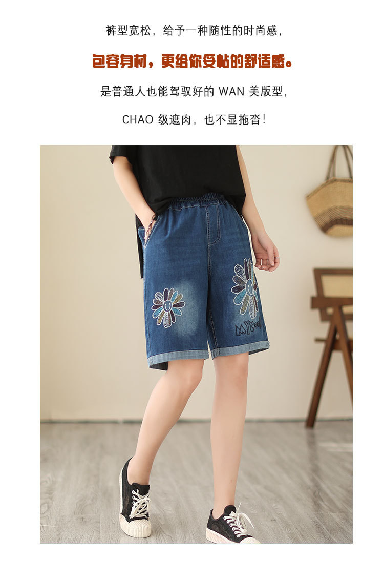 신축성 있는 허리 데님 반바지 여성의 새로운 스타일 5부 바지 여름 얇은 느슨한 유행 작은 자수 6부스토어 가기