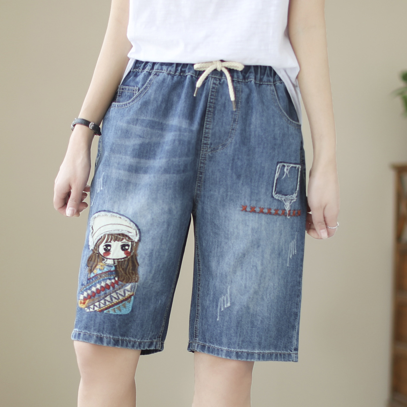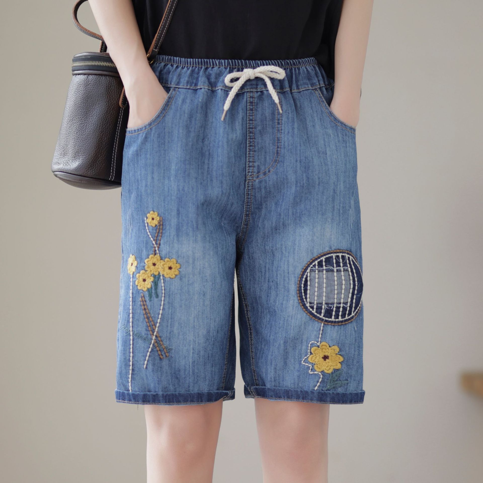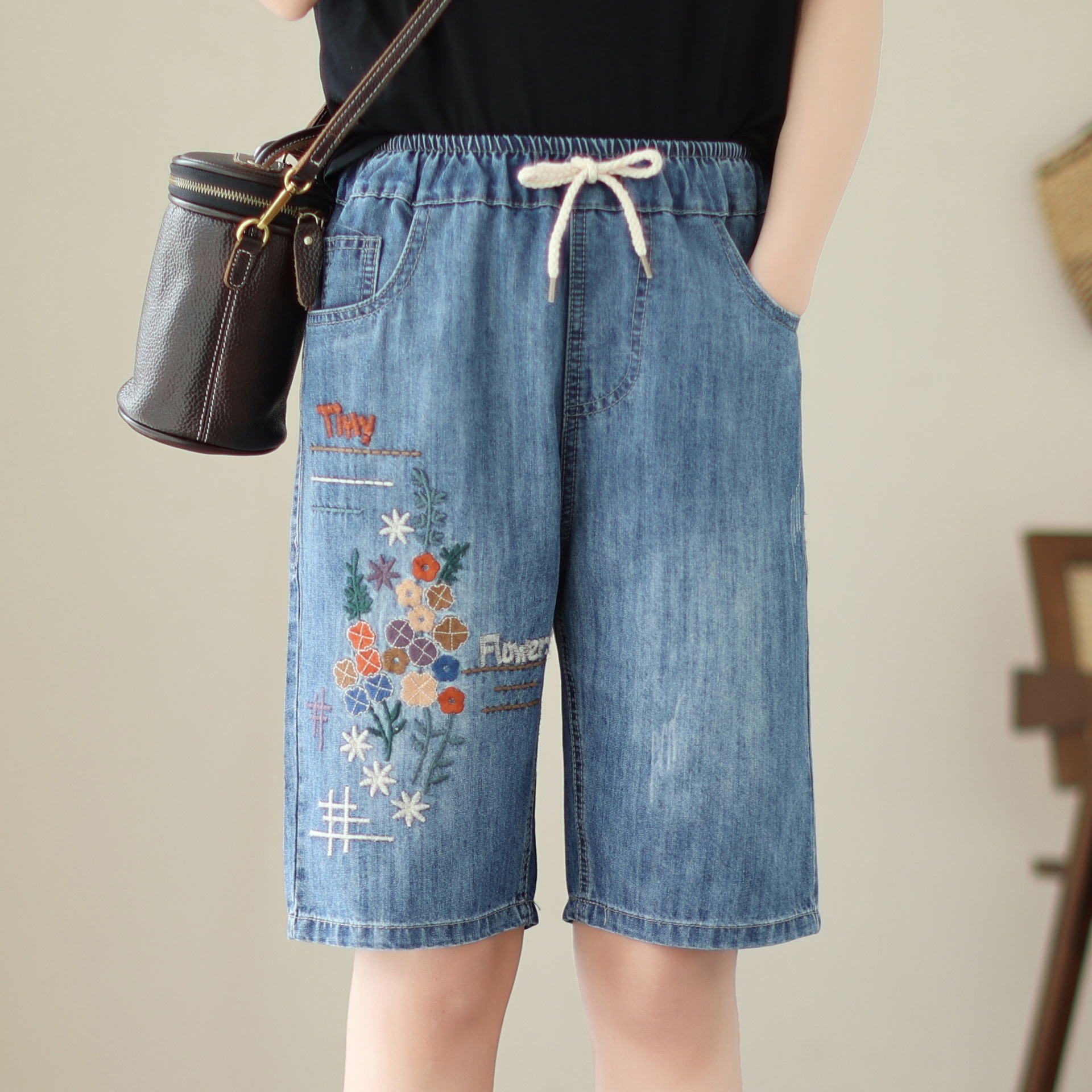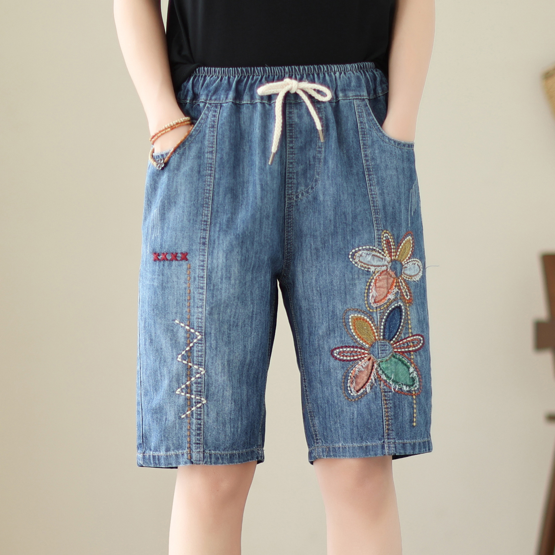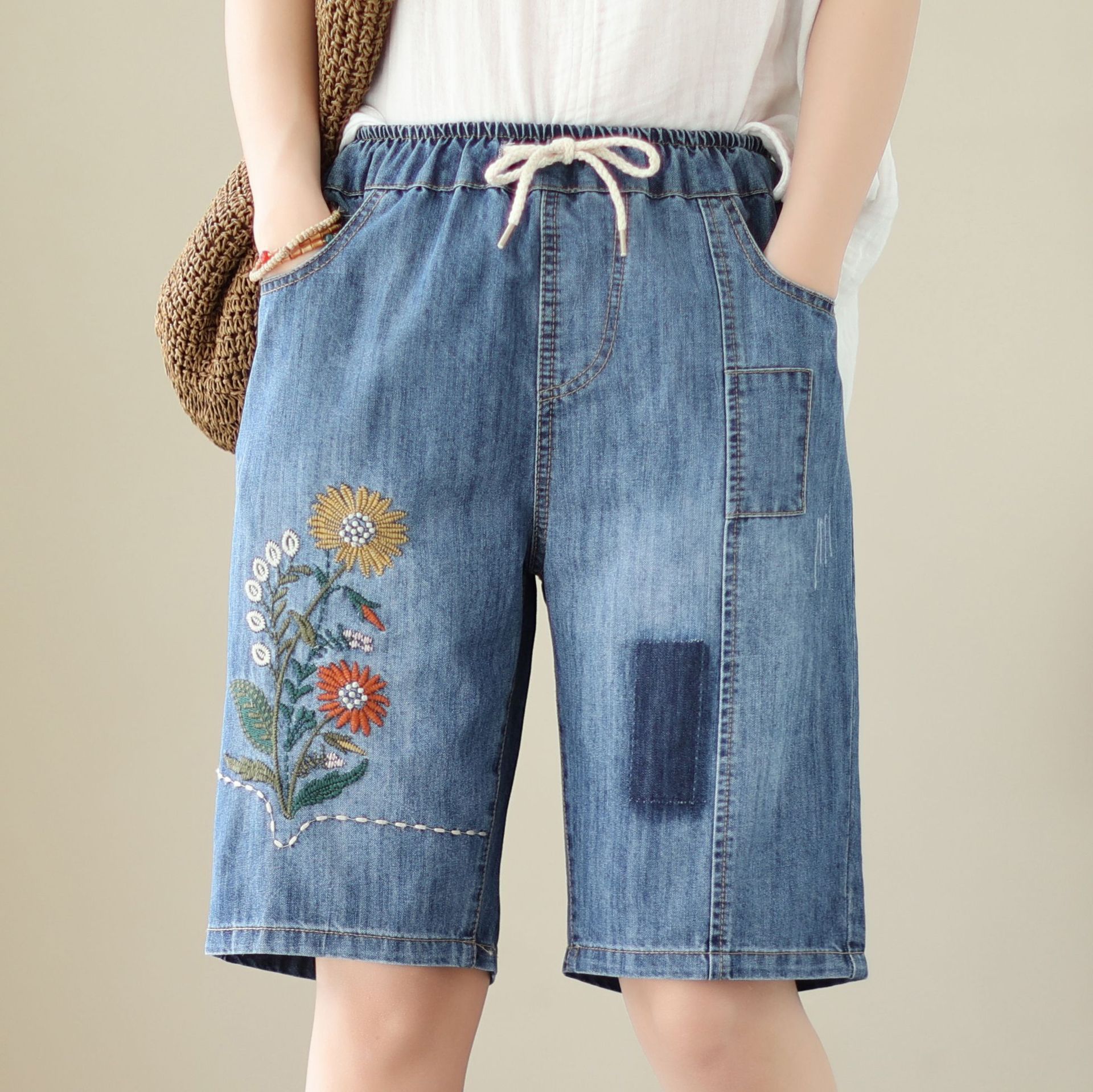 신축성 있는 허리 데님 반바지 여성의 새로운 스타일 5부 바지 여름 얇은 느슨한 유행 작은 자수 6부스토어 가기