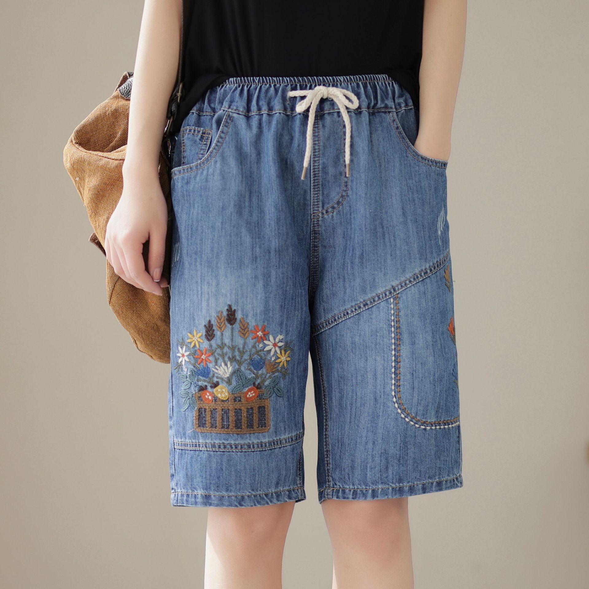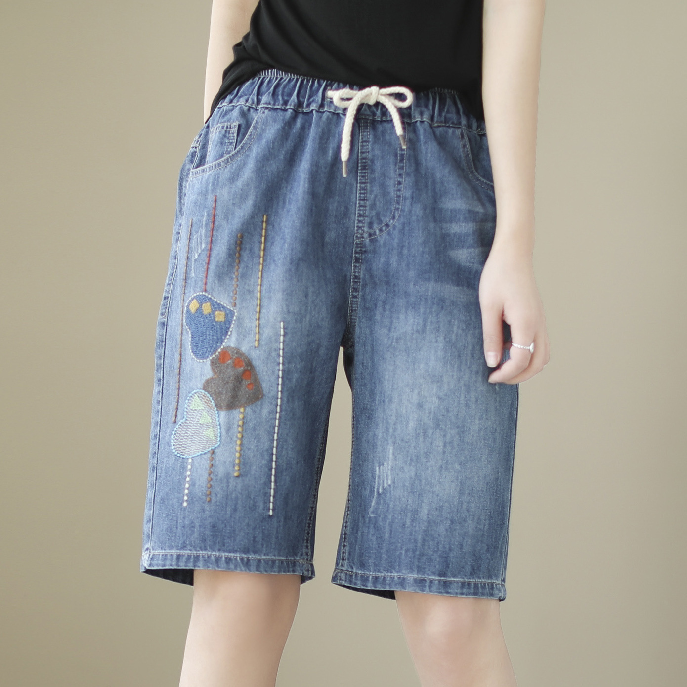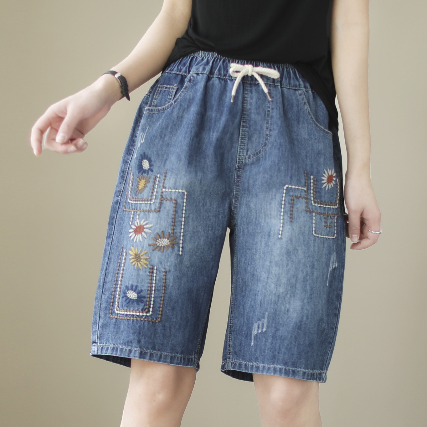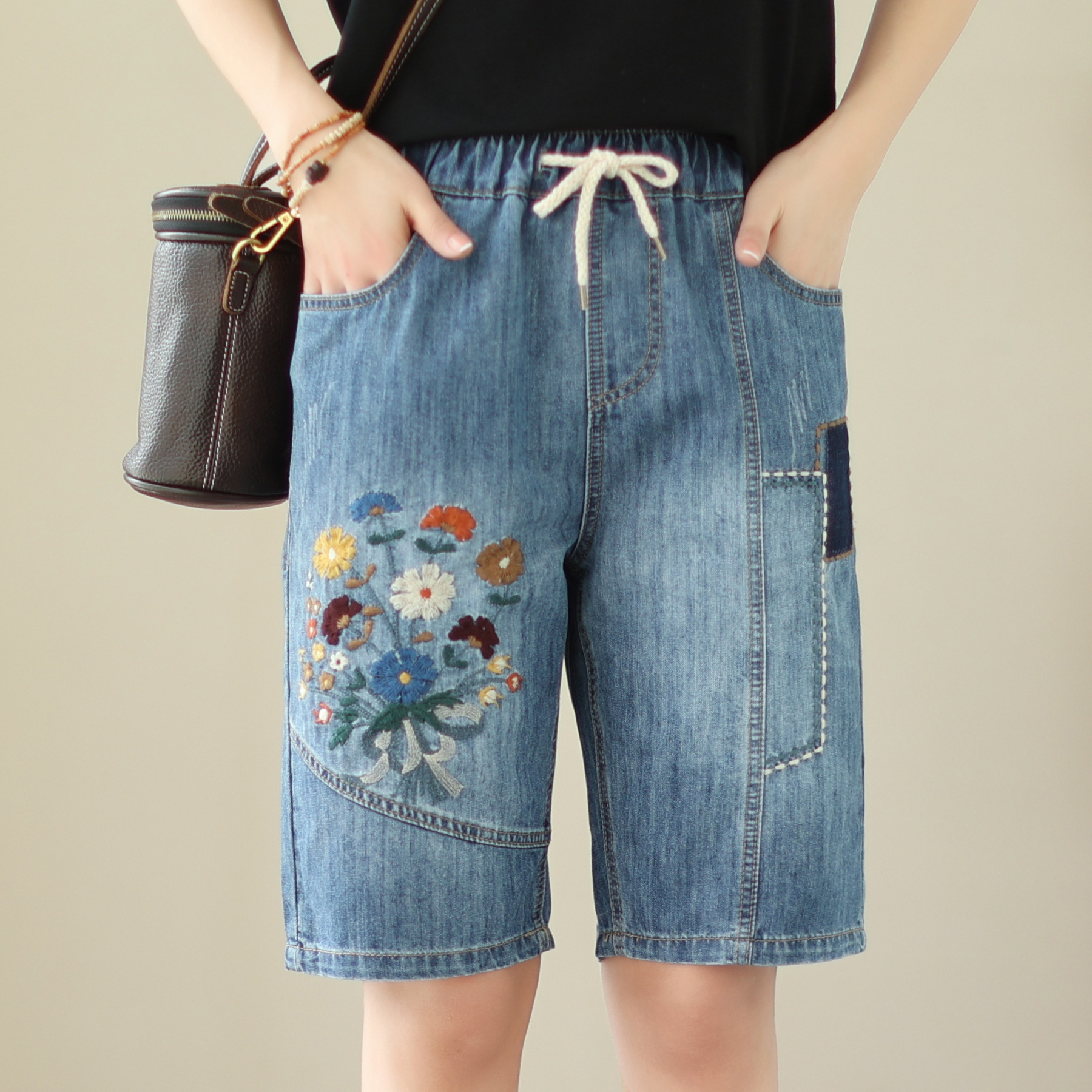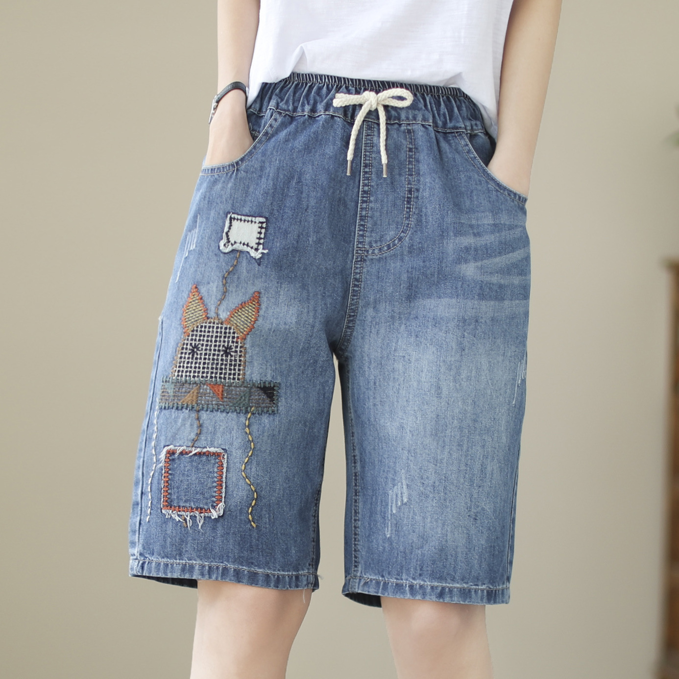 신축성 있는 허리 데님 반바지 여성의 새로운 스타일 5부 바지 여름 얇은 느슨한 유행 작은 자수 6부스토어 가기