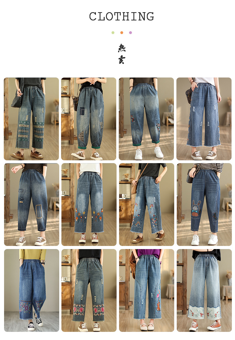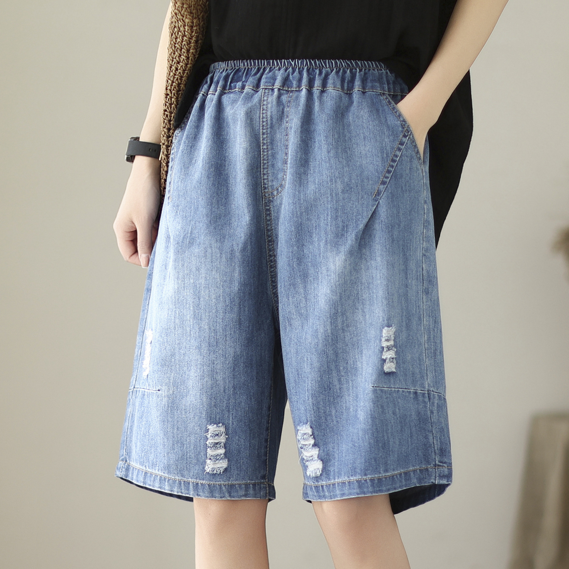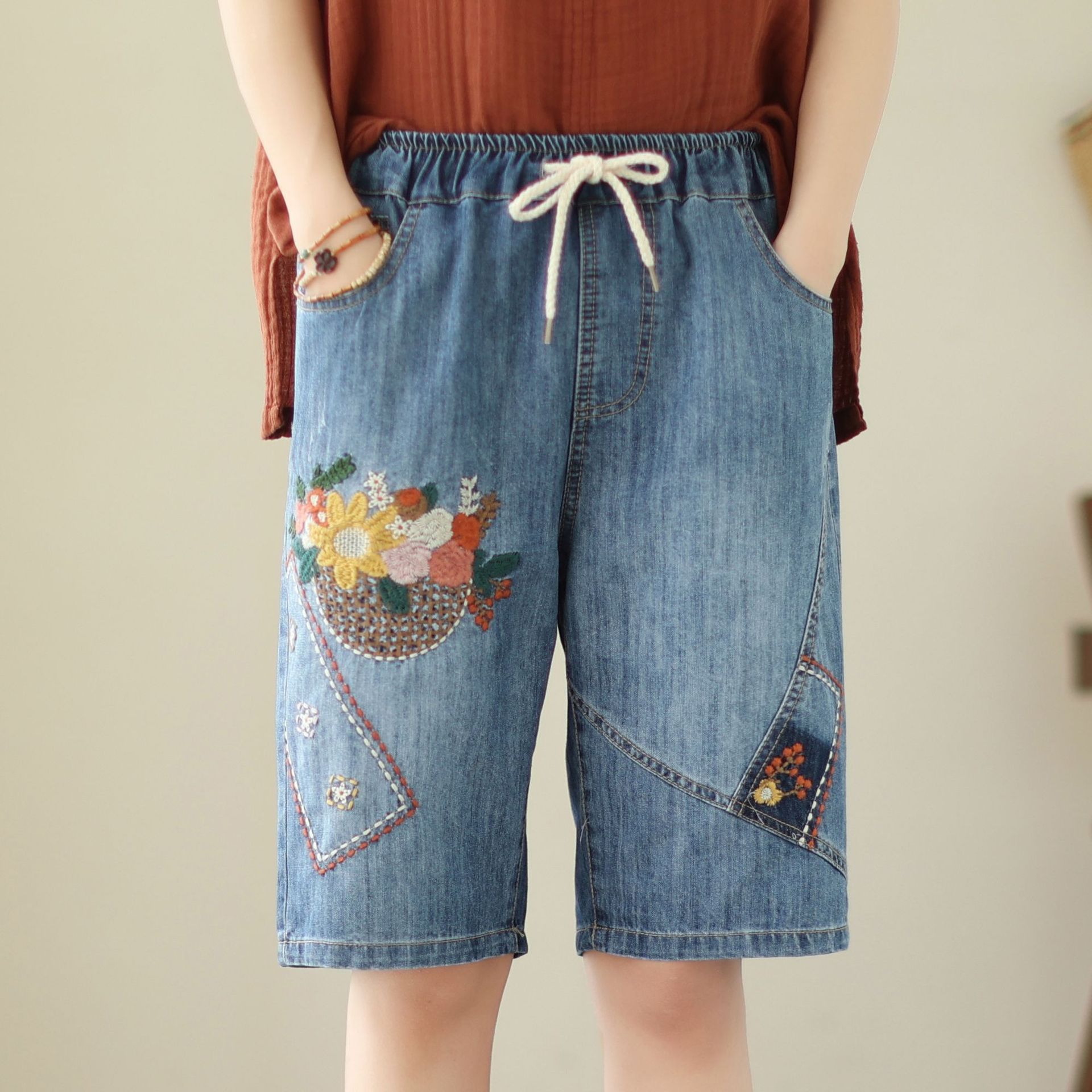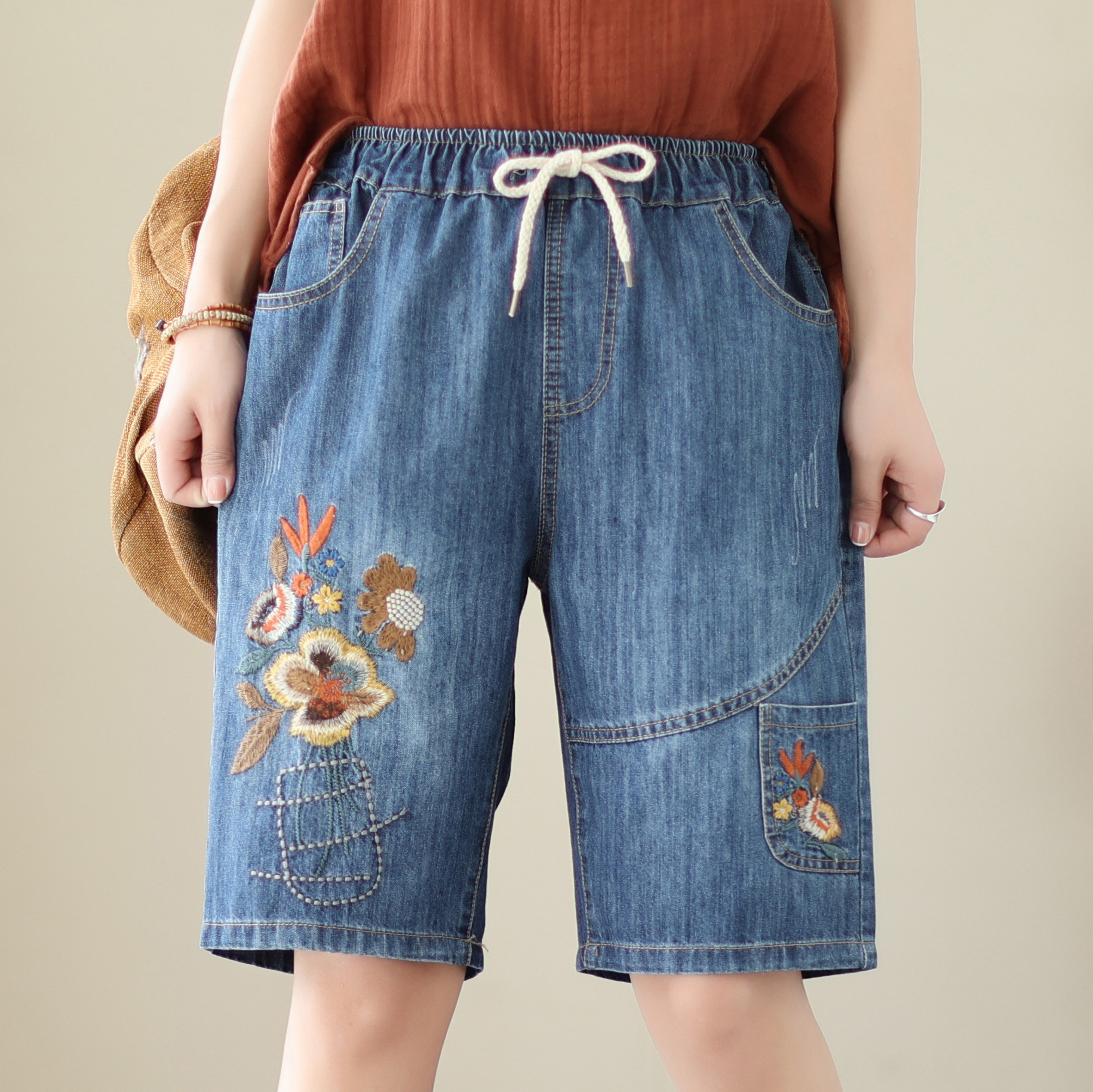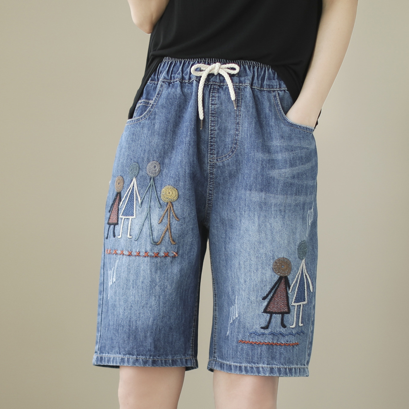 신축성 있는 허리 데님 반바지 여성의 새로운 스타일 5부 바지 여름 얇은 느슨한 유행 작은 자수 6부스토어 가기