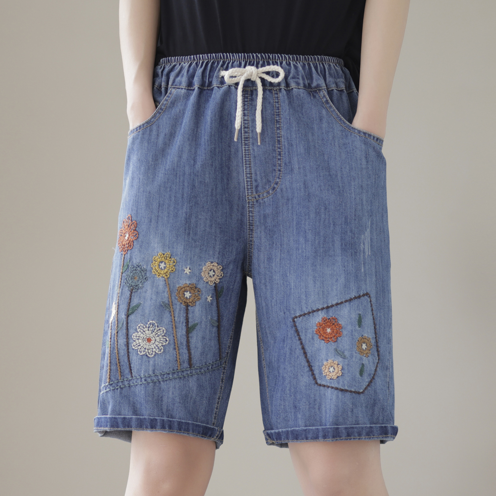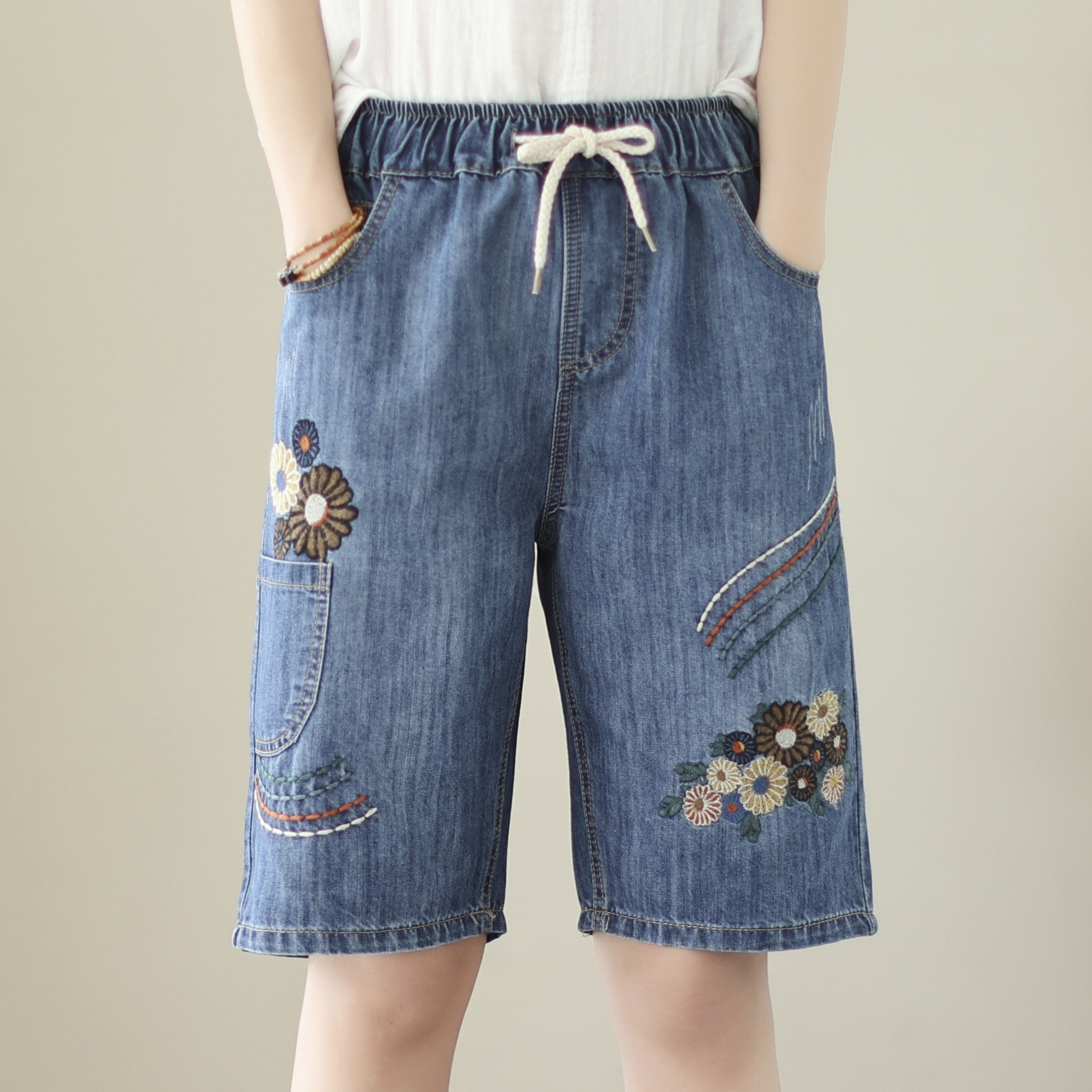 신축성 있는 허리 데님 반바지 여성의 새로운 스타일 5부 바지 여름 얇은 느슨한 유행 작은 자수 6부