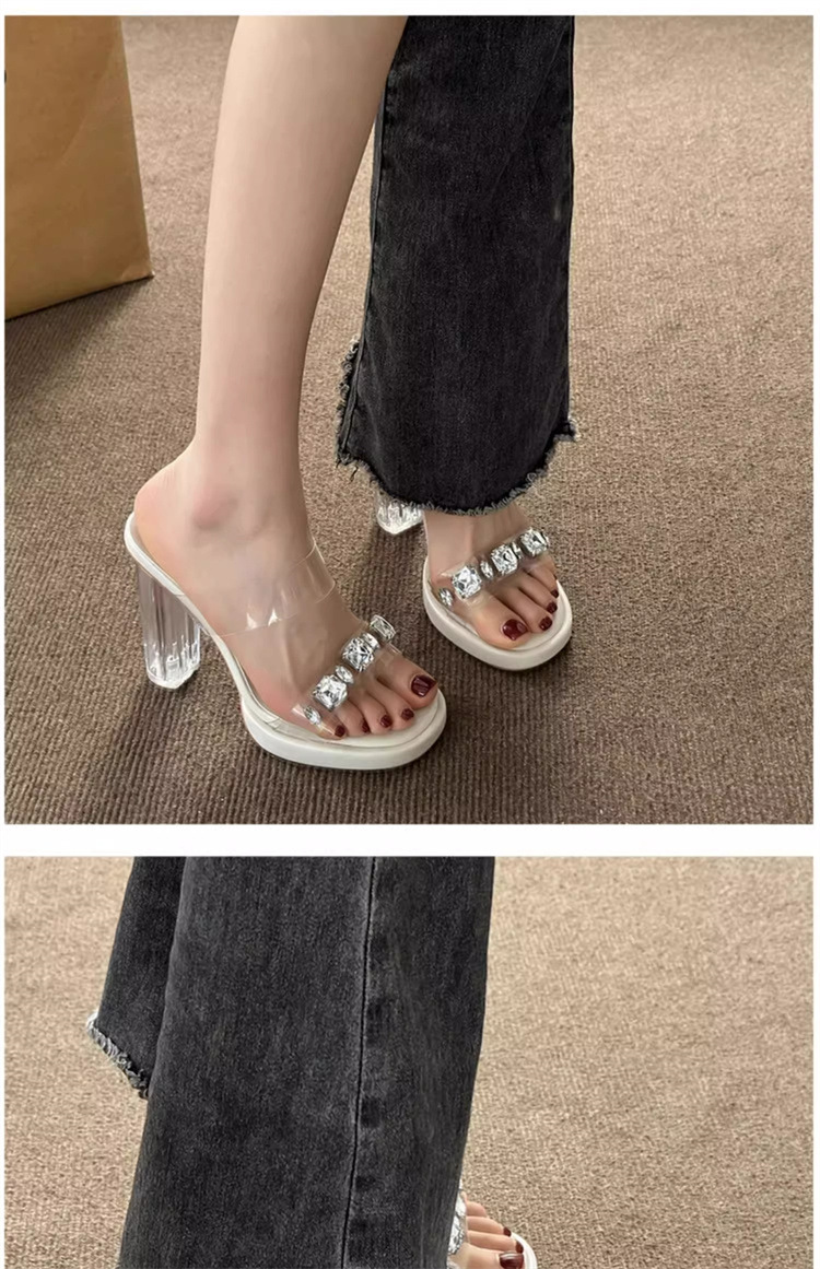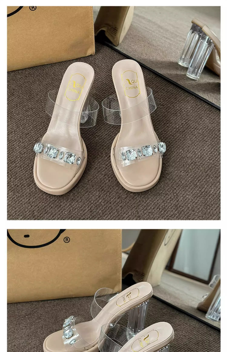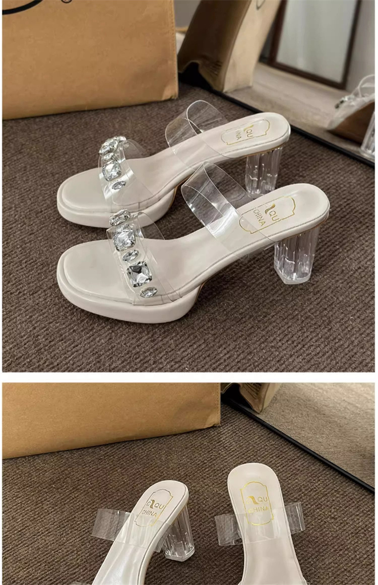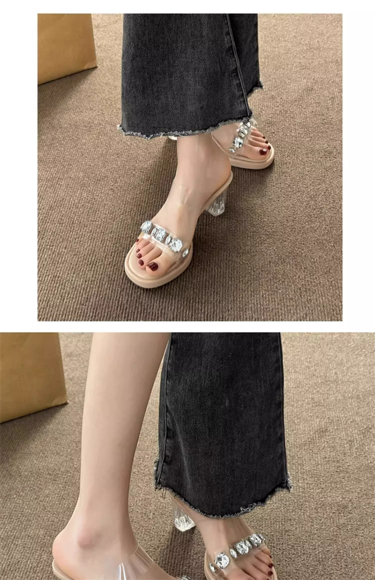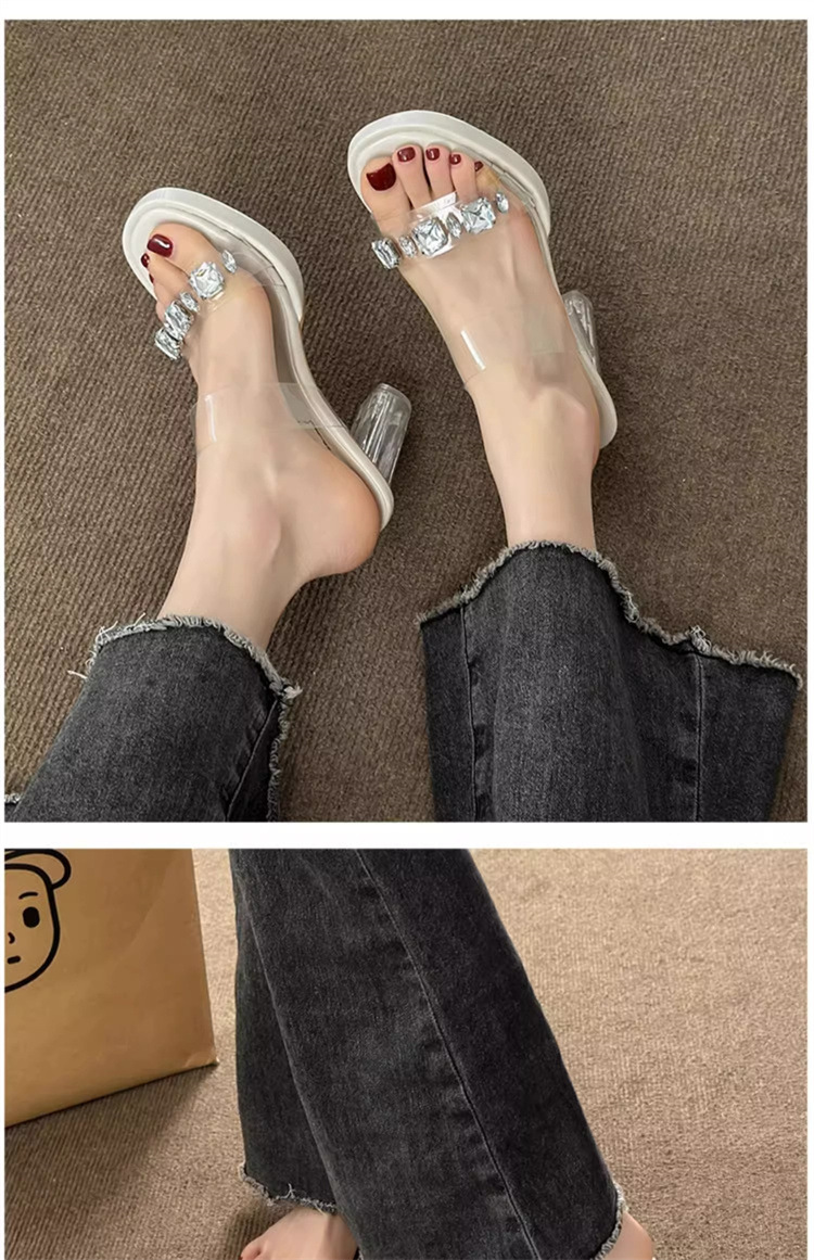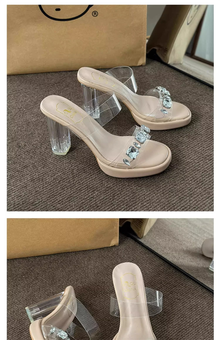 여성용 하이힐 2025 여름 신작 프렌치 두꺼운 굽 라인스톤 투명 크리스탈 샌들 여성 슬리퍼 여성 신발스토어 가기