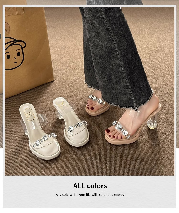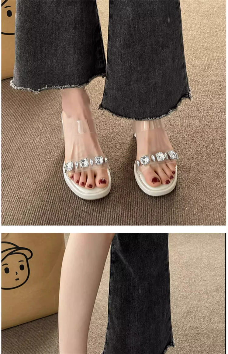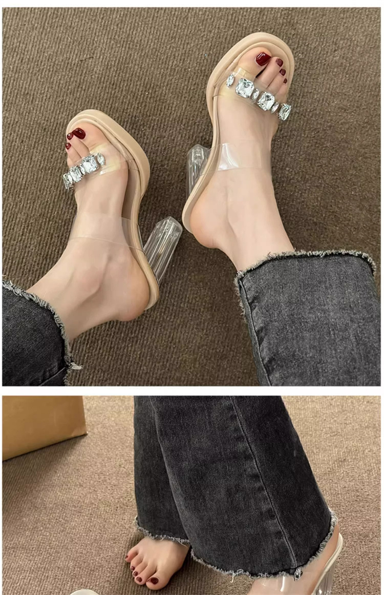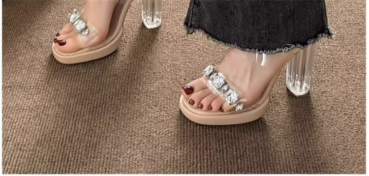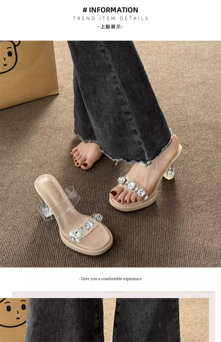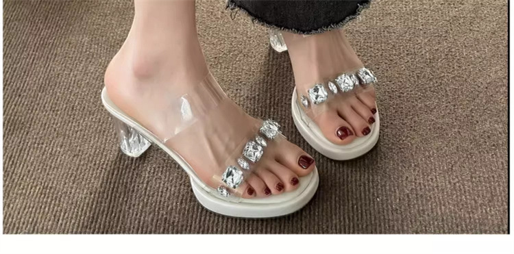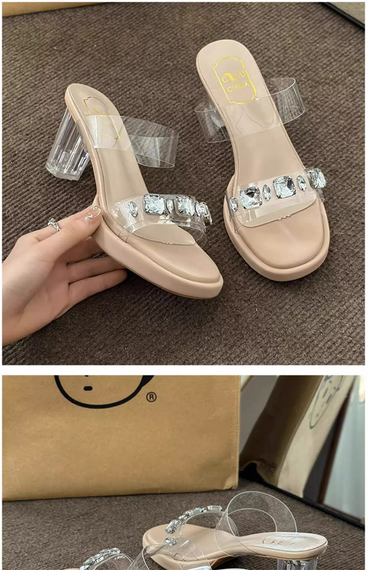 여성용 하이힐 2025 여름 신작 프렌치 두꺼운 굽 라인스톤 투명 크리스탈 샌들 여성 슬리퍼 여성 신발스토어 가기